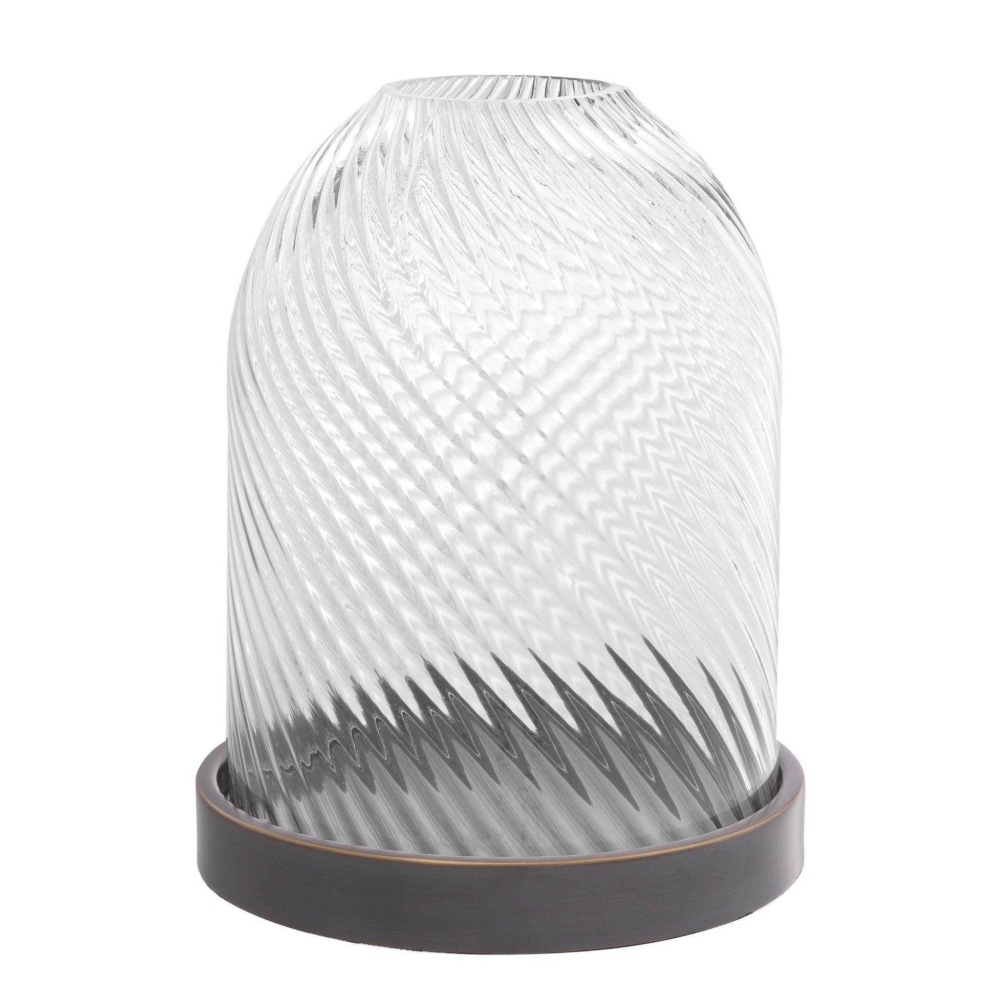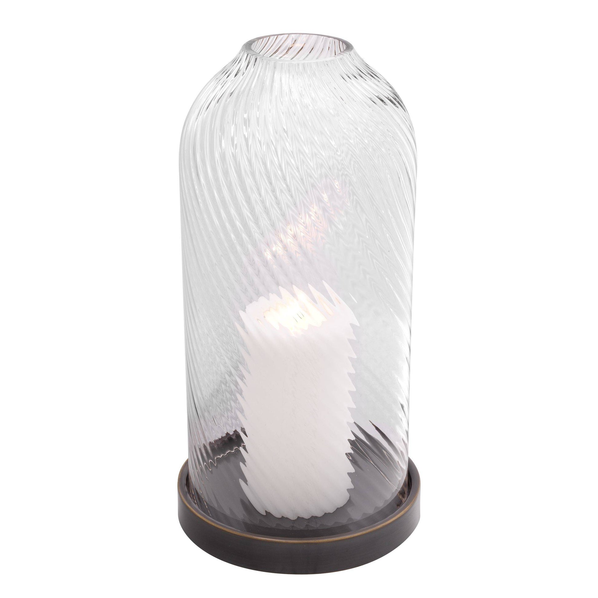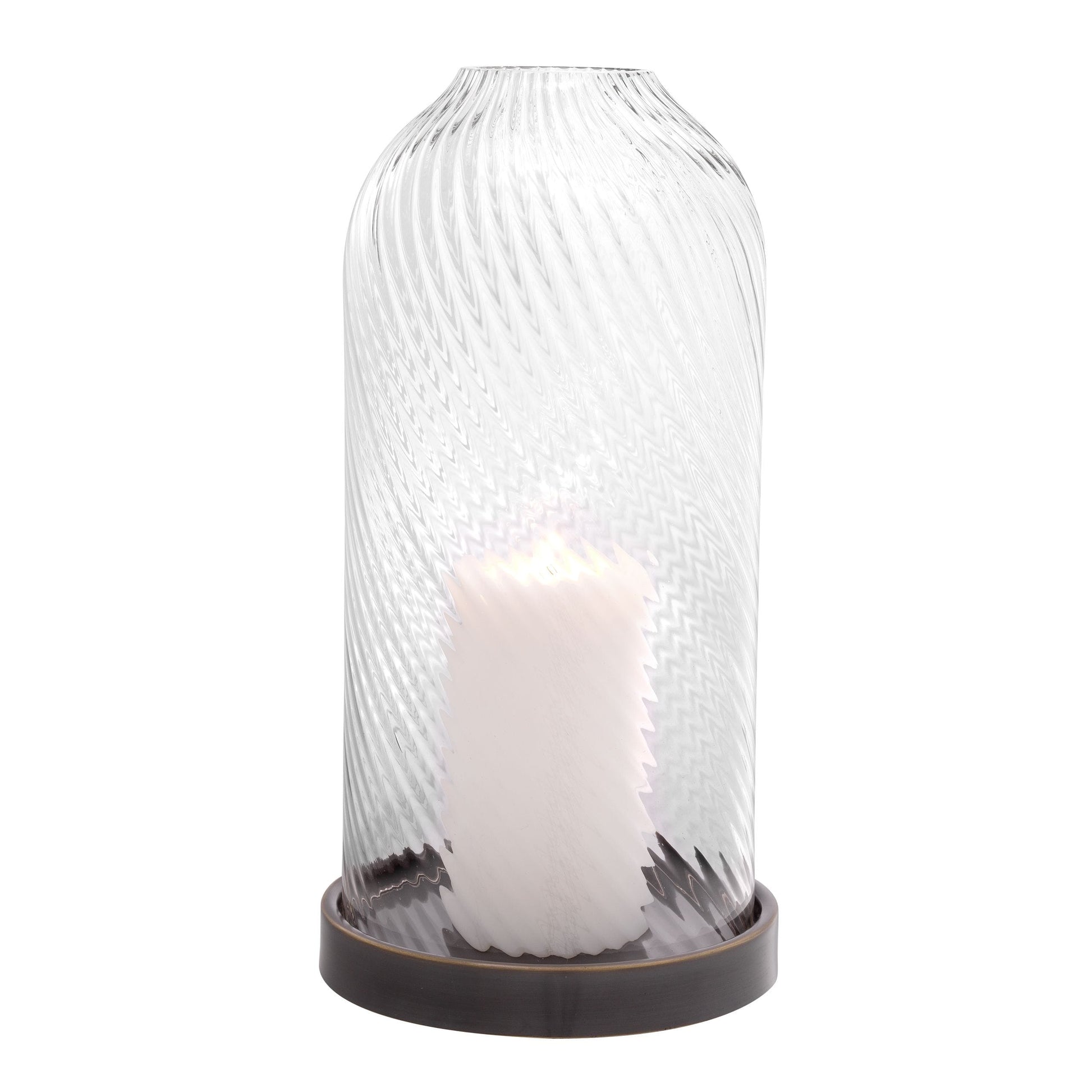 Härligt kvalitativ ljuslykta med handblåst glas med läckert mönster som sveper sig upp i cirklande rörelse. Botten i mässing som fått sig en snygg bronsfinish.