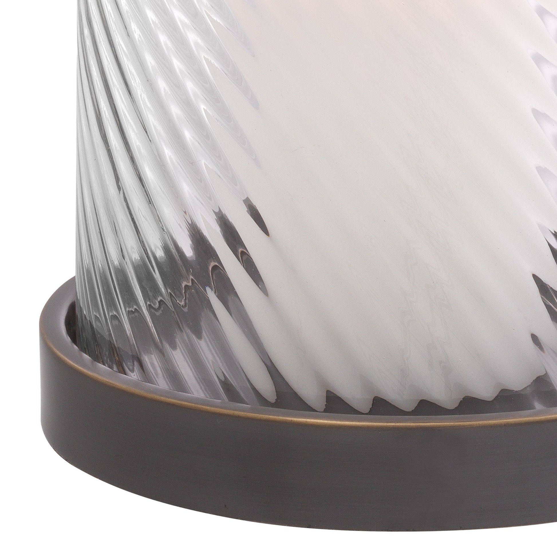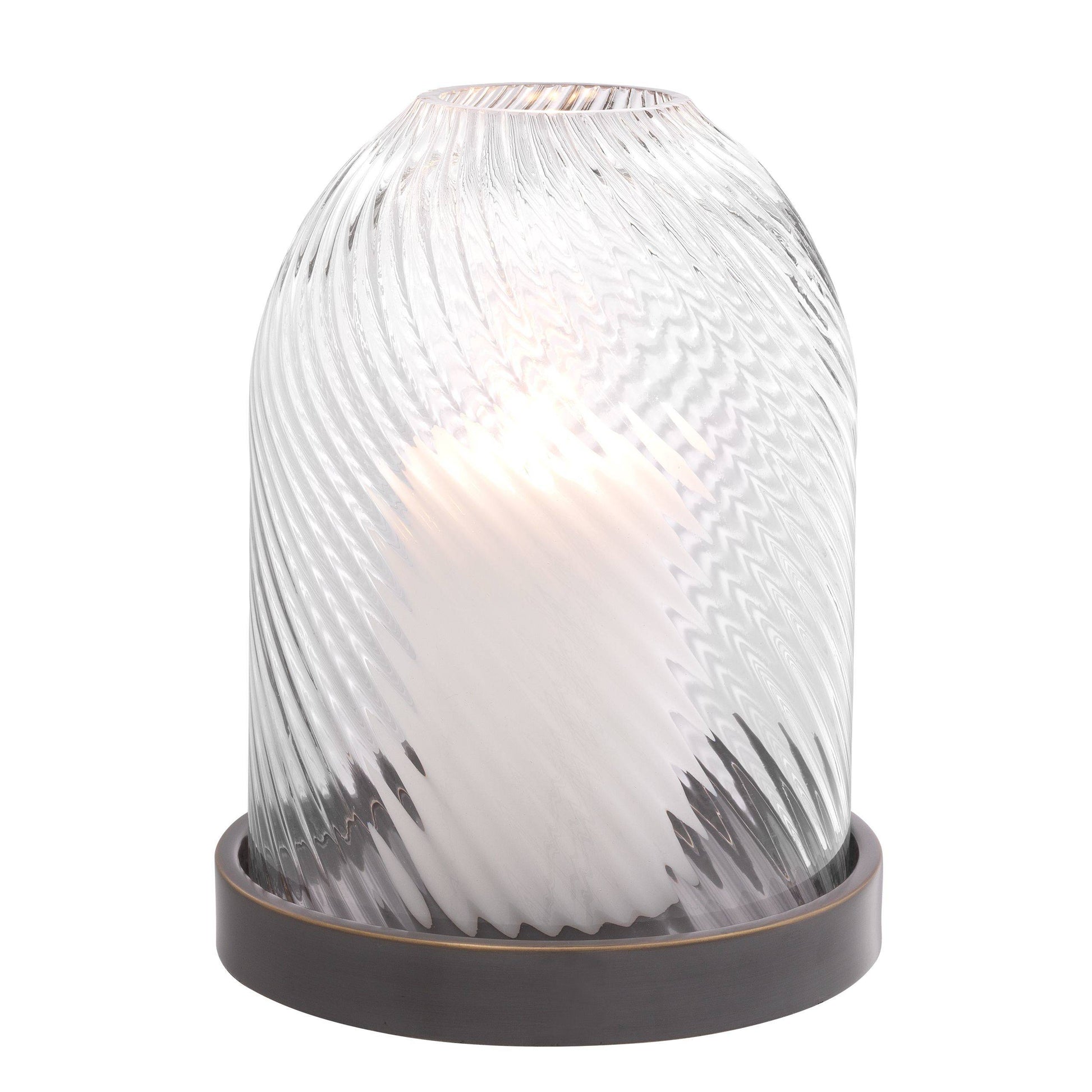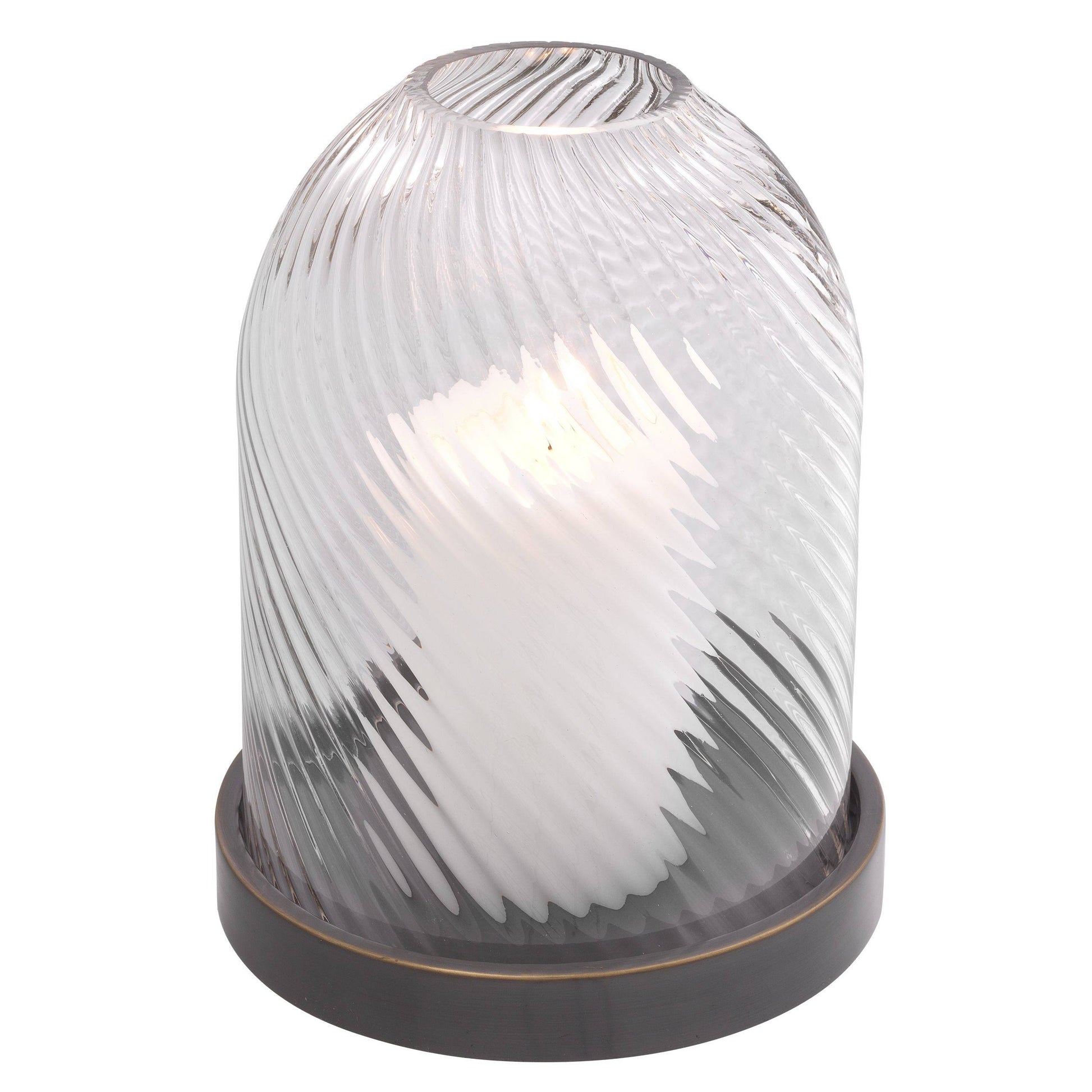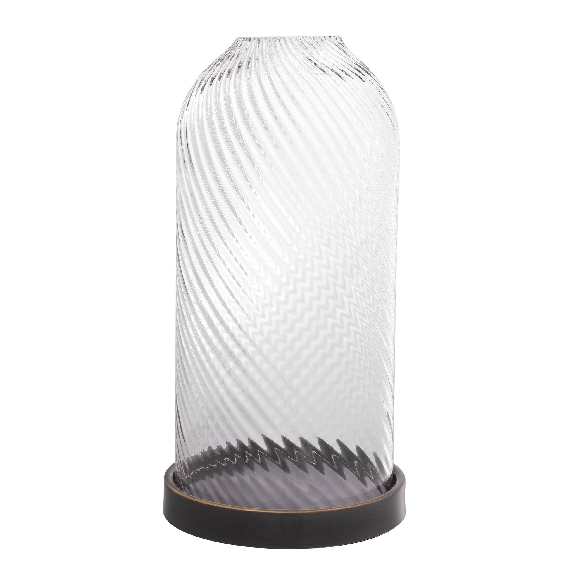 Härligt kvalitativ ljuslykta med handblåst glas med läckert mönster som sveper sig upp i cirklande rörelse. Botten i mässing som fått sig en snygg bronsfinish.