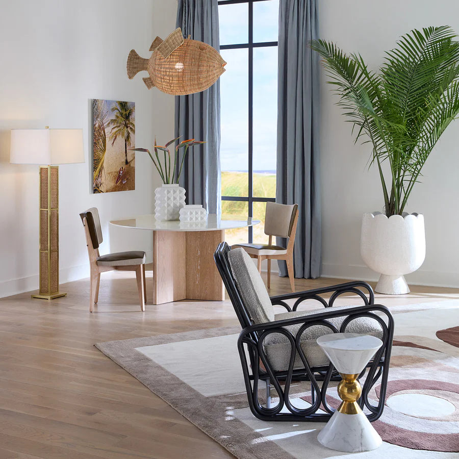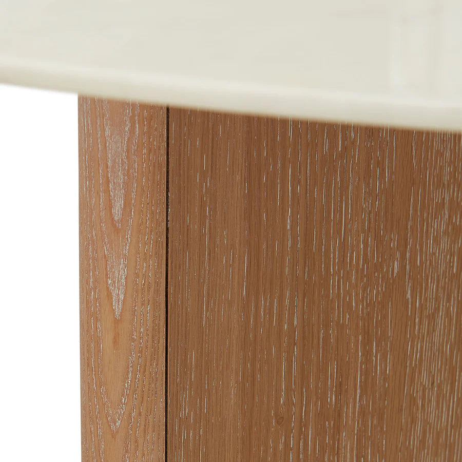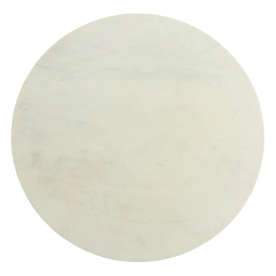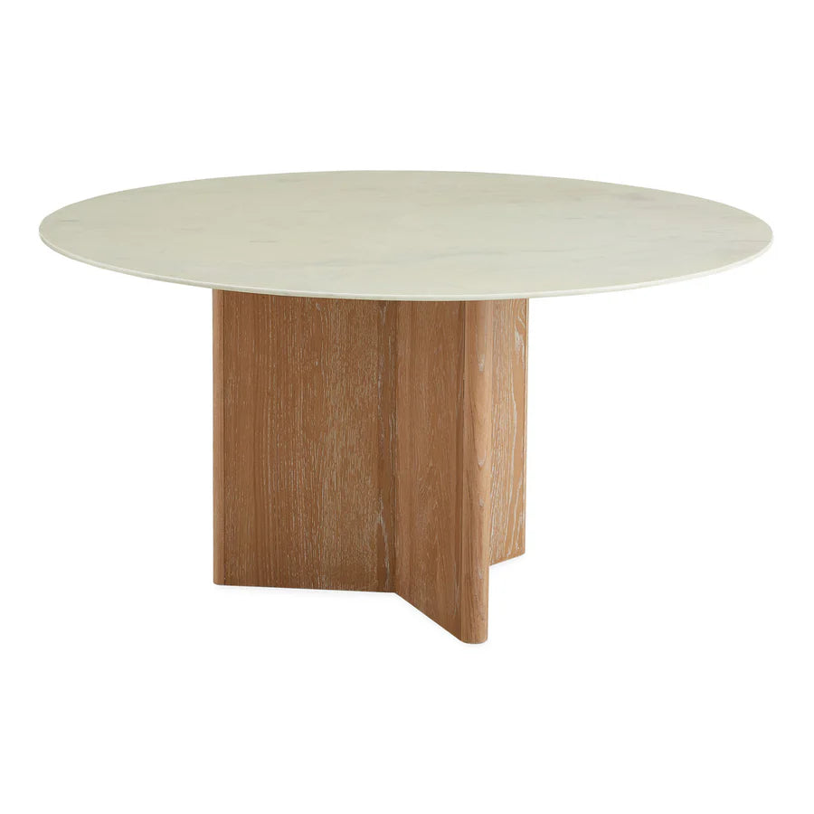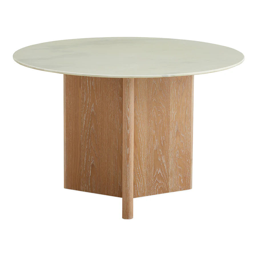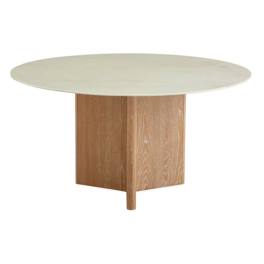 En rund bordsskiva i vit Carrara-marmor vilar på Y-formad bas som ger lekfullt asymmetrisk känsla, tillverkad av lätt vitbetsad massiv ek.