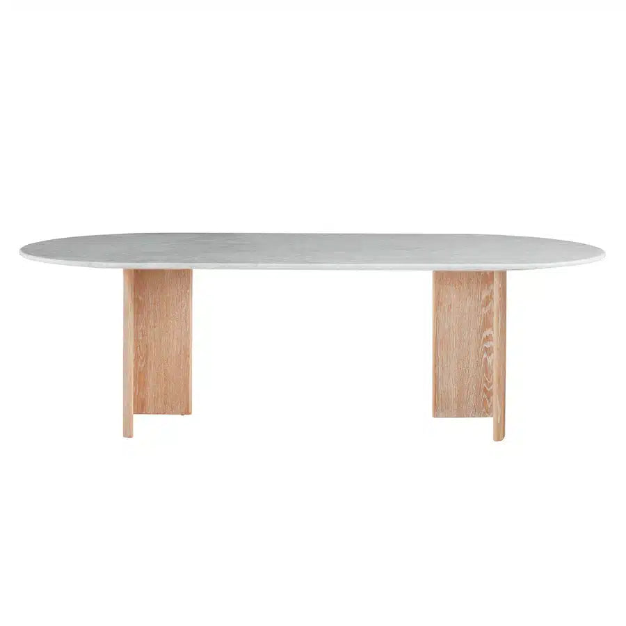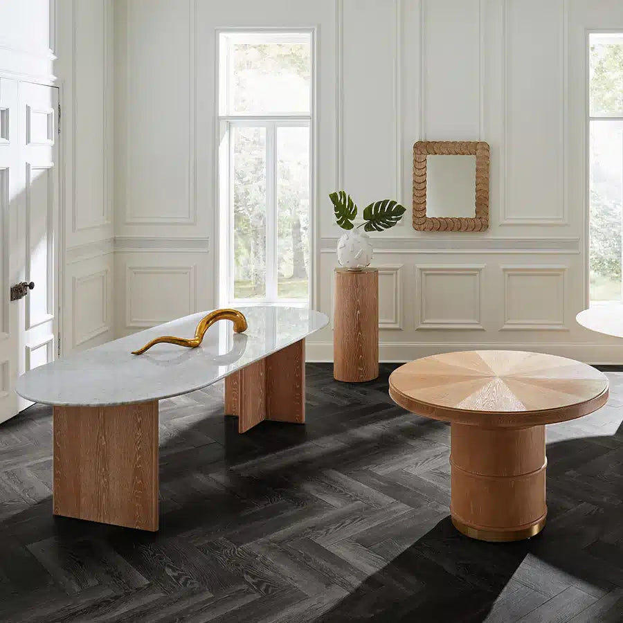 Den polerade Carraramarmorn har en tidlös dragningskraft med sina unika grå ådringar som ger varje bord en individuell karaktär. Den kontrasterar perfekt mot de varma, organiska tonerna i den vitkalkade eken, vilket skapar en harmonisk balans mellan elegans och naturlighet. De T-formade baserna ger inte bara stabilitet utan adderar också en skulptural dimension till bordet, vilket gör det till ett konstverk i sig.