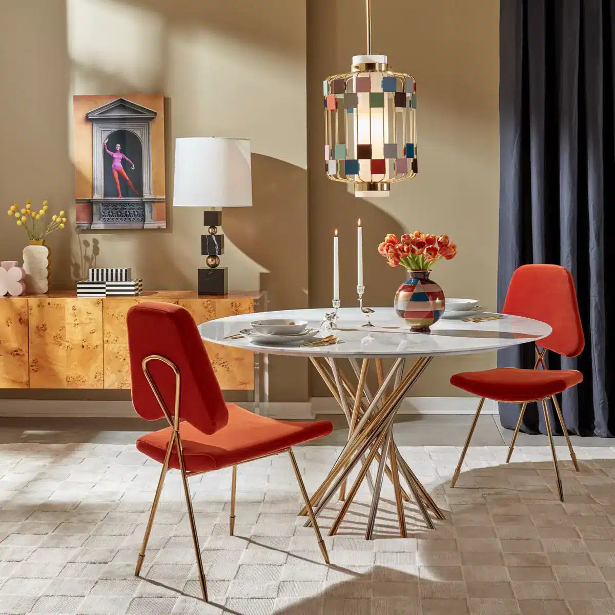 Matbord Electrum har en virvlande konstellation av polerade mässings- och nickelstänger. Rymmer bekvämt och med stil och elegans sex personer. Ett mycket exklusivt och smakfullt matbord som passar in i de flesta inredningar.