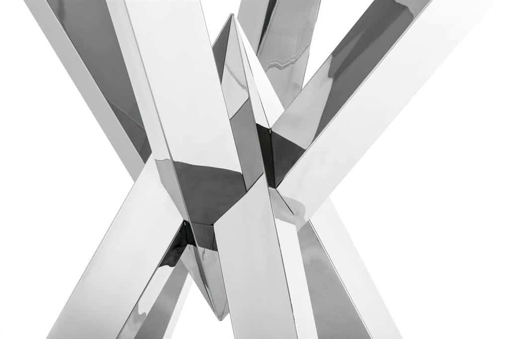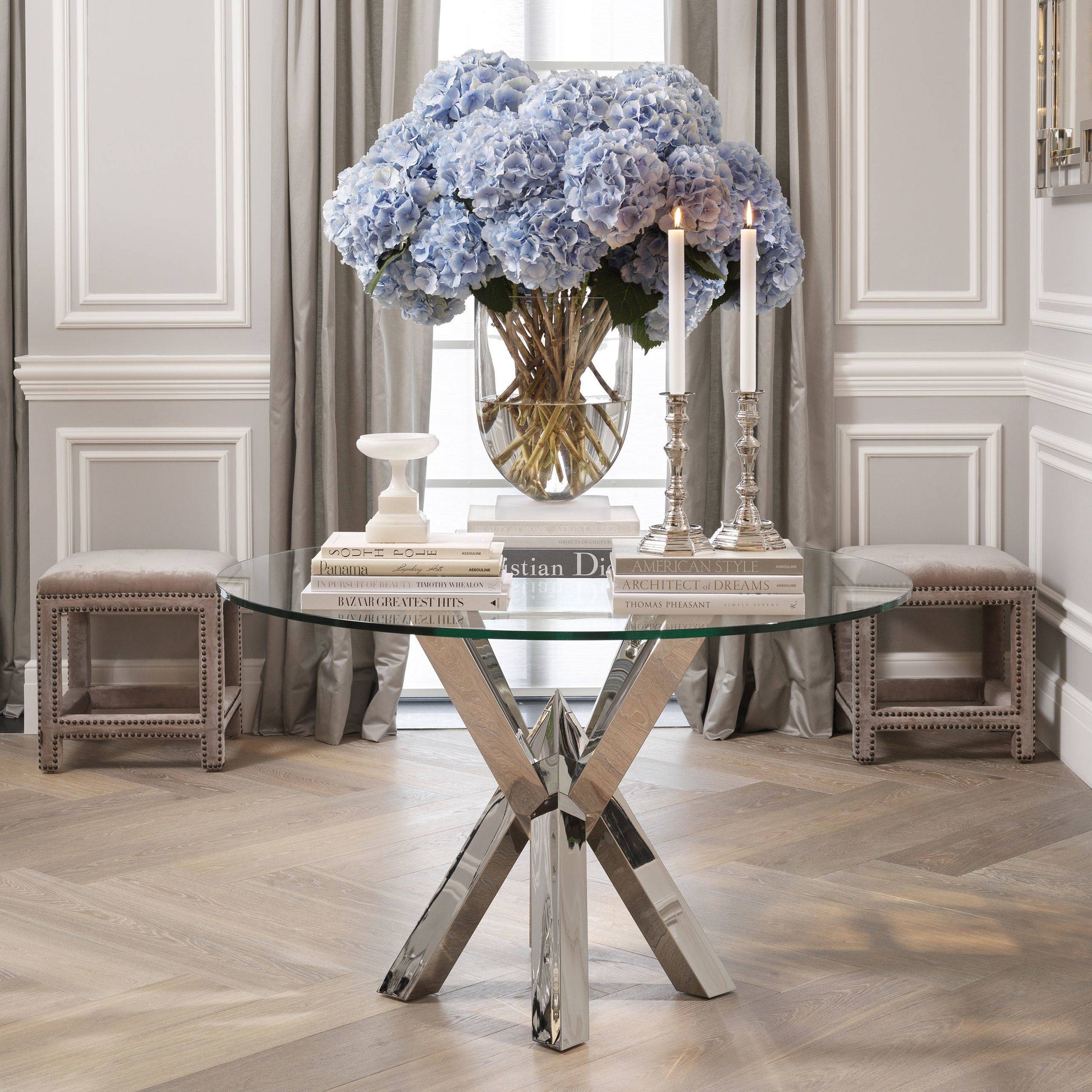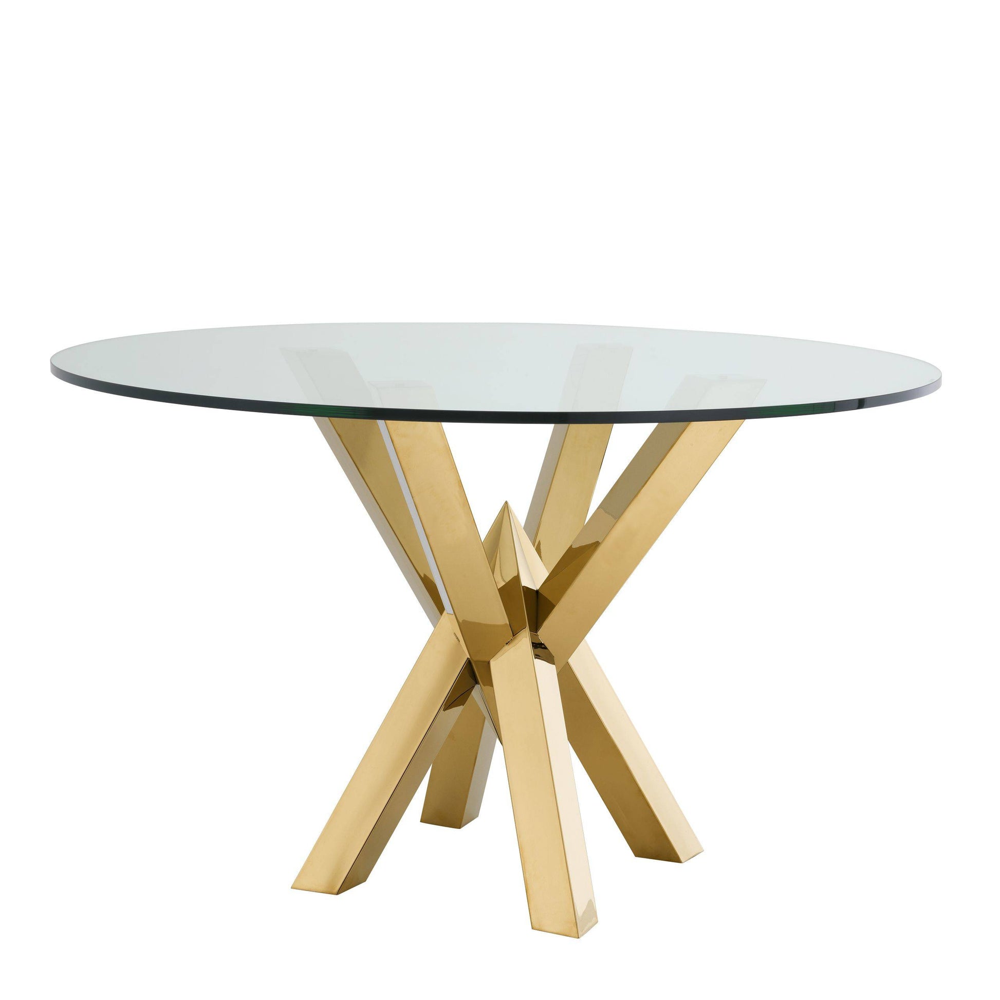 Ett snyggt och iögonfallande runt middagsbord med ställning i polerat rostfritt stål eller guldfinish och skiva i klarglas. Ett annorlunda och snyggt matbord för läckra inredningar.