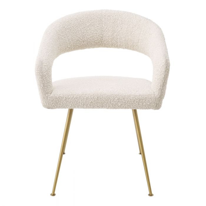 Lägg till karaktär till din matsal med Bravo Dining Chair. Kombinera elegansen från 50-talsmöbler med modern design. Den härliga klädseln i off-white Bouclé ger denna stol en inbjudande känsla, medan de avsmalnande benen i borstad mässingsfinish ger ditt hem en modern och lyxig look.