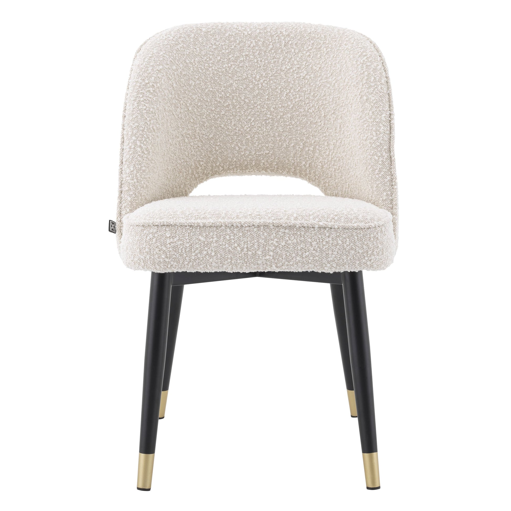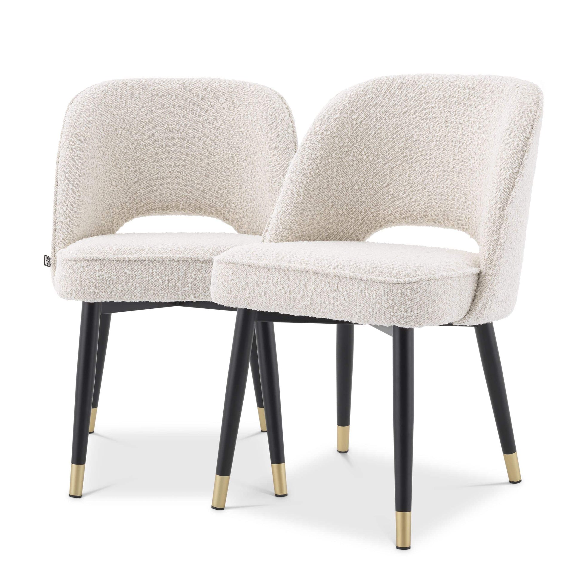 Matstol Cliff från världsberömda Eichholtz är en exklusiv och mycket designrik middagsstol med härlig sittkomfort och lyxig klädsel i sammet eller bouclé. Svarta, avsmalnande ben som avslutas med en gyllene fot ger en härlig detalj och känns otroligt snyggt. En modern stol med tidlös touch som håller länge. Säljs i par/set om två