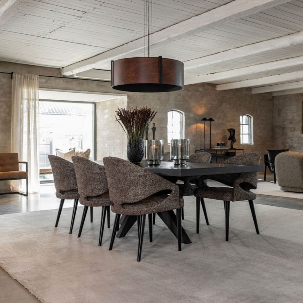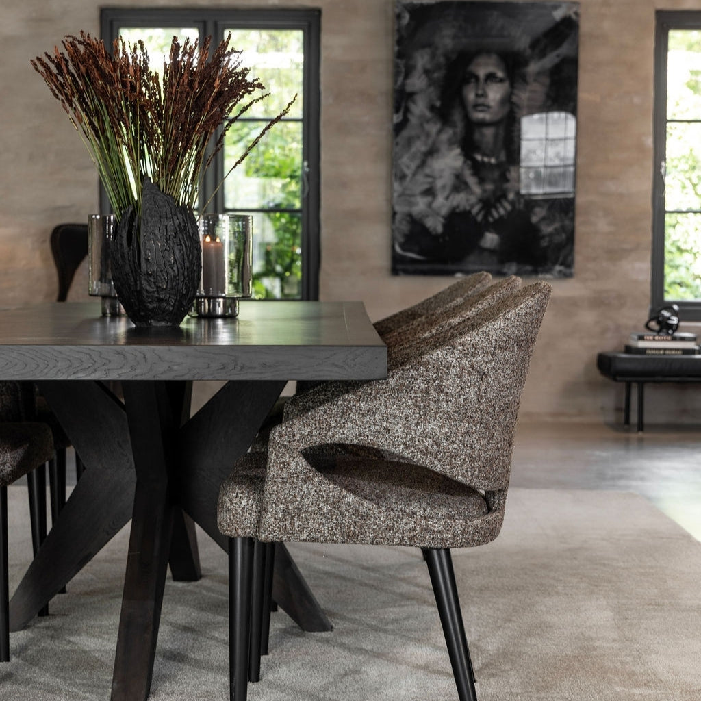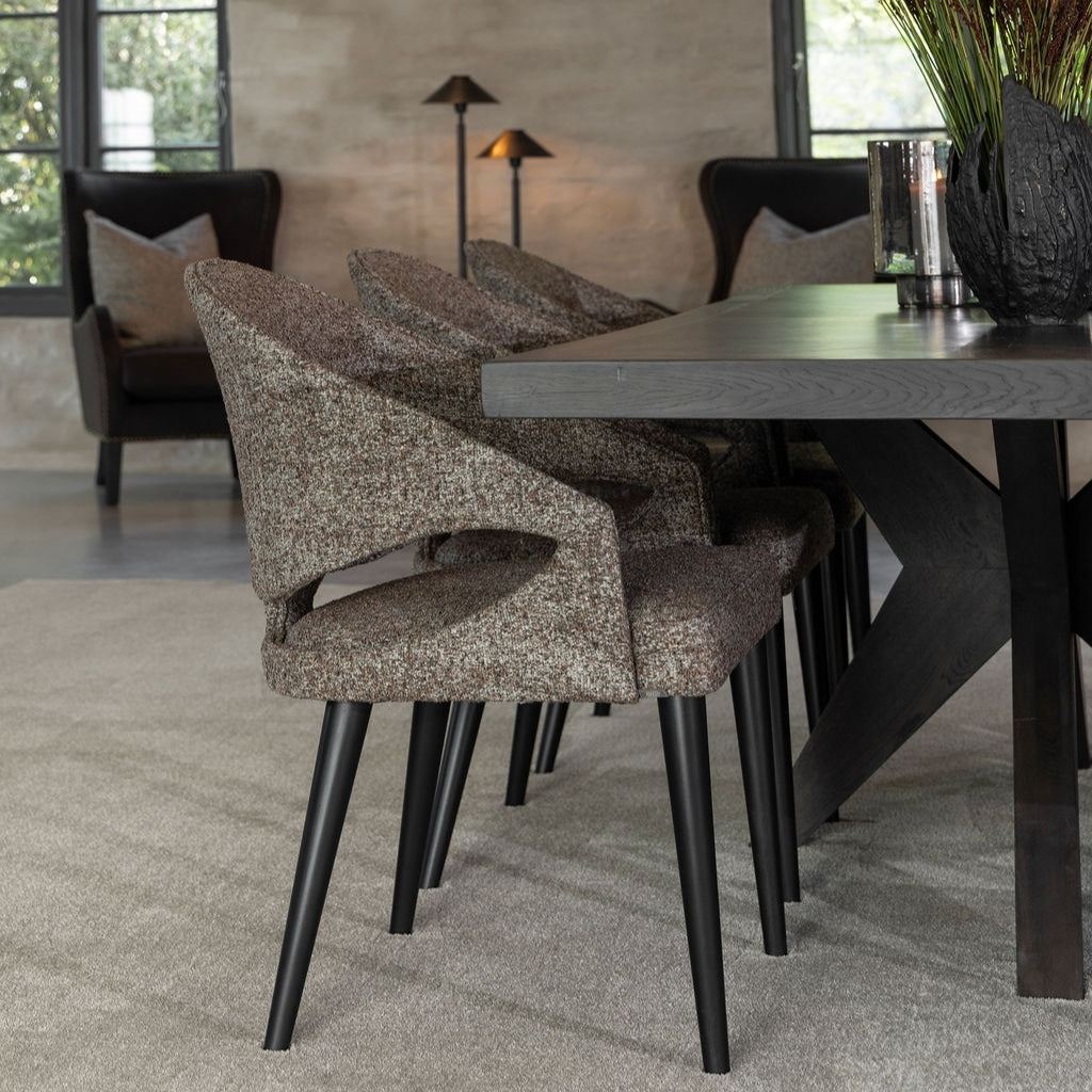 Vance matstol från Artwood är en elegant stol med modern formgivning och hög sittkomfort. Klädd i det mjuka tyget Bronzo Brown kombinerar den en helklädd design med en skålformad rygg och öppna utskärningar som ger både karaktär och visuell lätthet. De smala, avsmalnande benen i trä skapar en vacker kontrast till den mjuka stoppningen och bidrar till ett luftigt och balanserat uttryck. Detaljerade sömmar längs rygg och sits framhäver hantverket och förstärker stolens sofistikerade helhetsintryck.