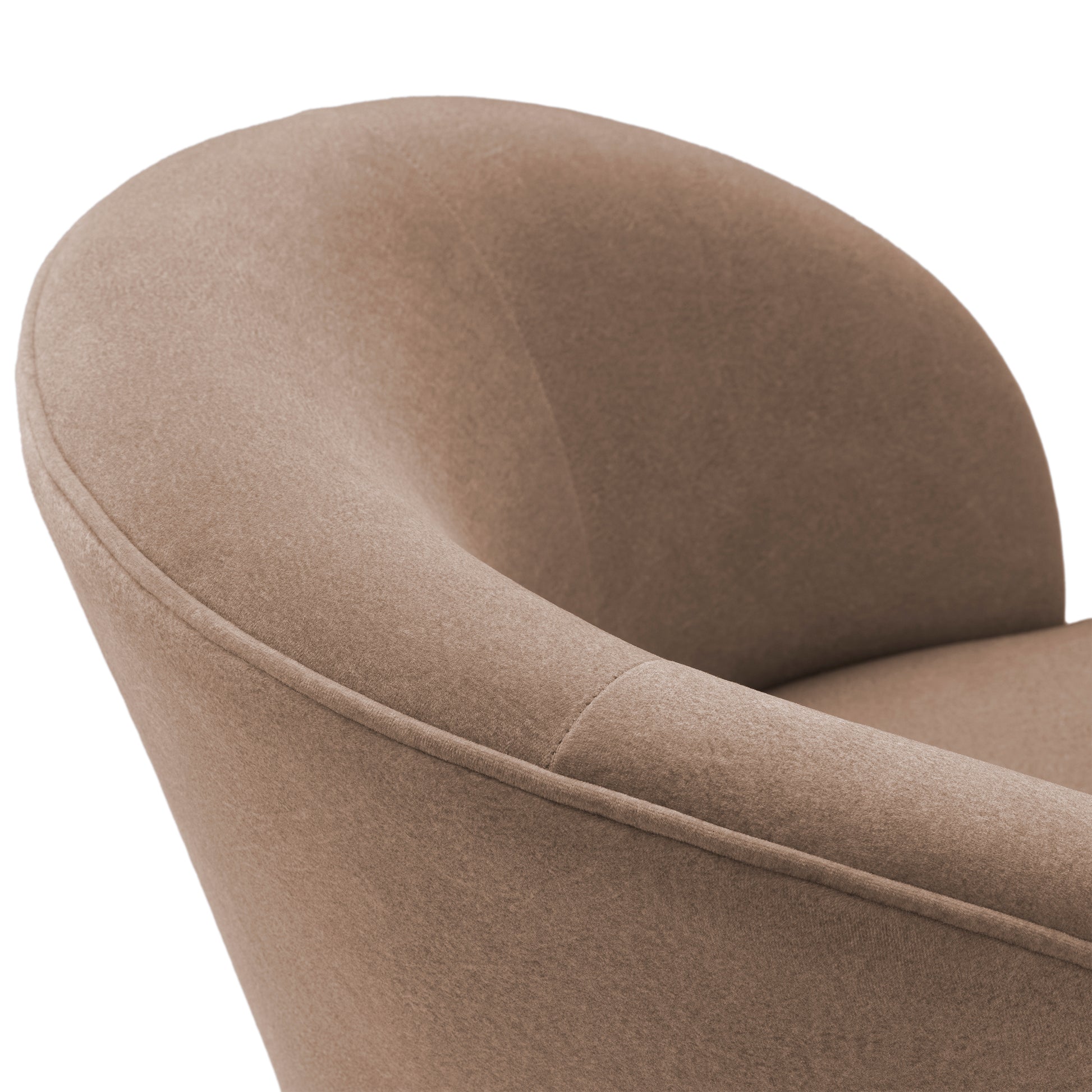 Den är klädd i ett exklusivt tyg i Tondro beige som ger en varm och inbjudande känsla, medan de slanka benen i svart metall skapar en stilren kontrast.