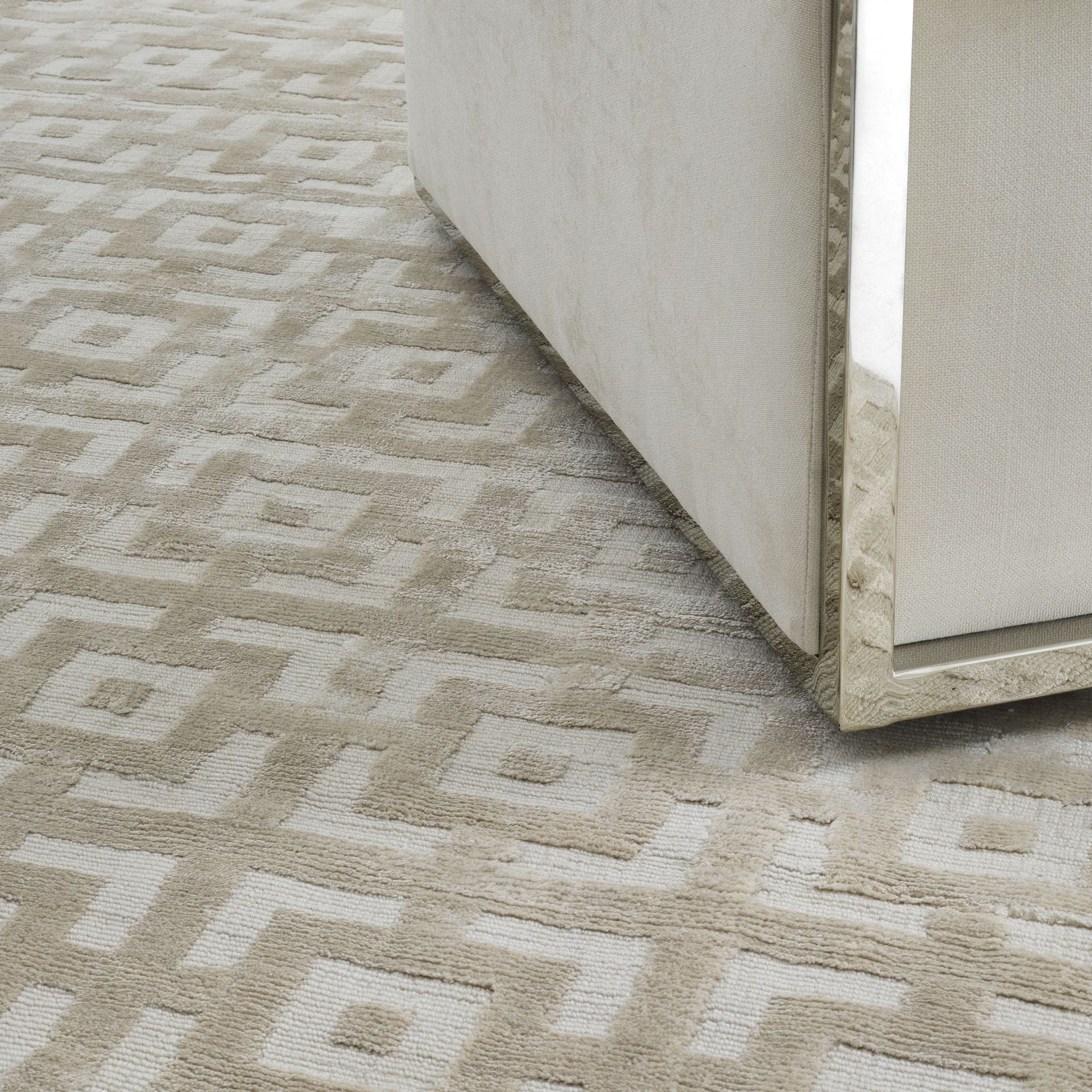 Med sitt naturliga utseende och vackra grafiska mönster är denna matta ett mycket stilrent tillskott till din inredning . Det är handvävt i Indien i 100% högkvalitativ viskos, som är ett naturligt syntetfiber. Viskosmattor har en silkeslen finish när de utsätts för ljus och därför används viskos ofta som en praktisk ersättning för siden. Det är lätt att underhålla och särskilt lämpligt för människor som är allergiska mot djurhår.