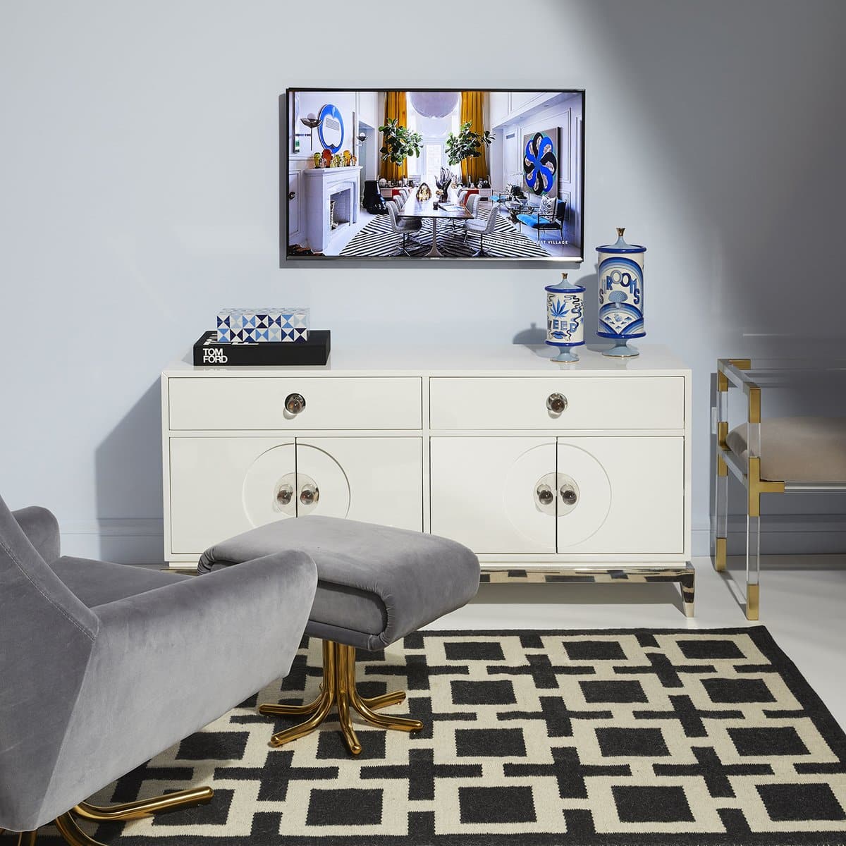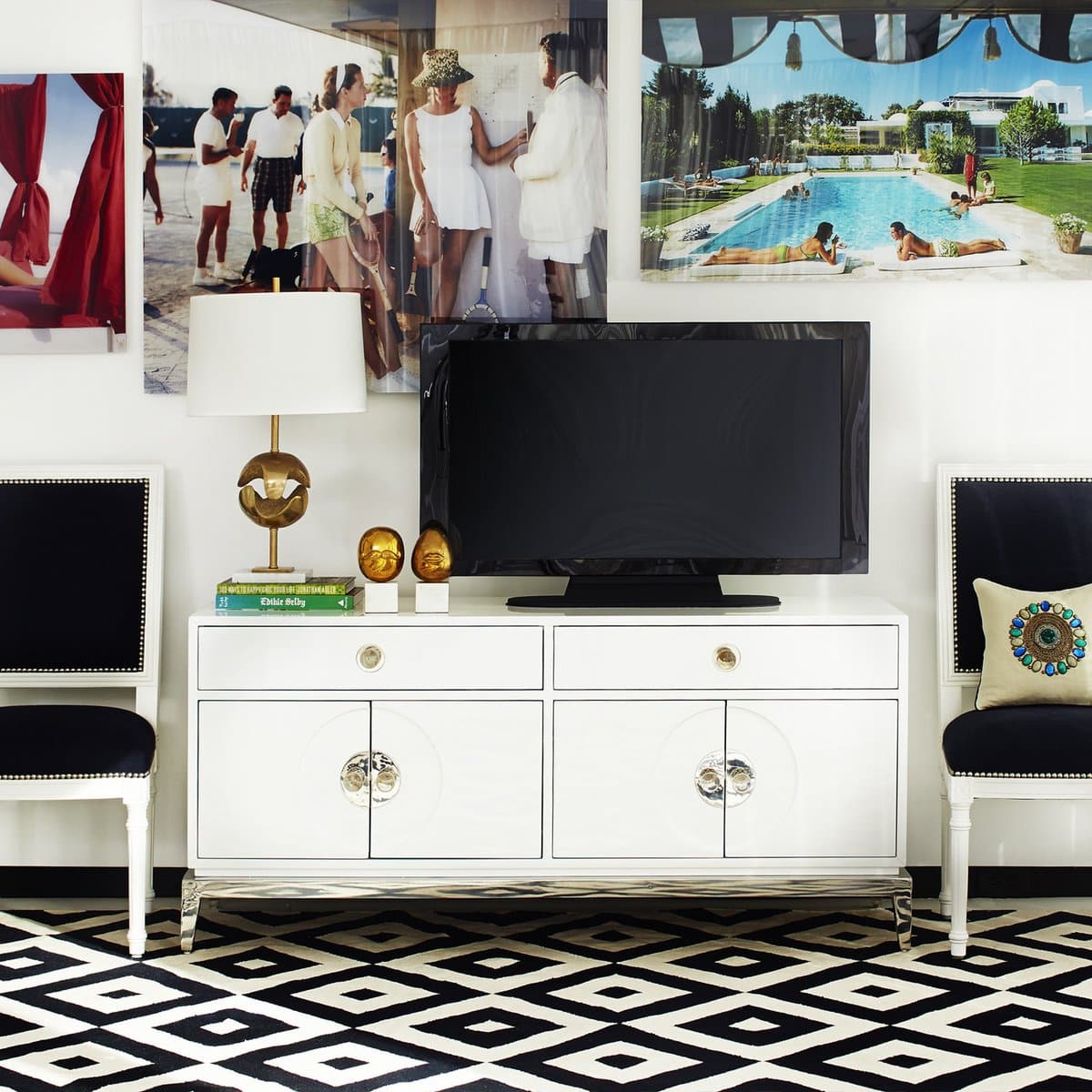 Neo-Classical lines, a dash of Hollywood glamour, and a top note of Mod moxie: that’s our Channing Collection. Our lacquered media console is designed to tidily stow all of your entertainment essentials with slim flip-front drawers. The double doors—decorated with demilune estucheons, polished accents, and oversized acrylic knobs—open to reveal adjustable shelves for customizable storage. Cut-outs at the back hide unsightly cords and preserve the piece’s sleek and shiny silhouette.