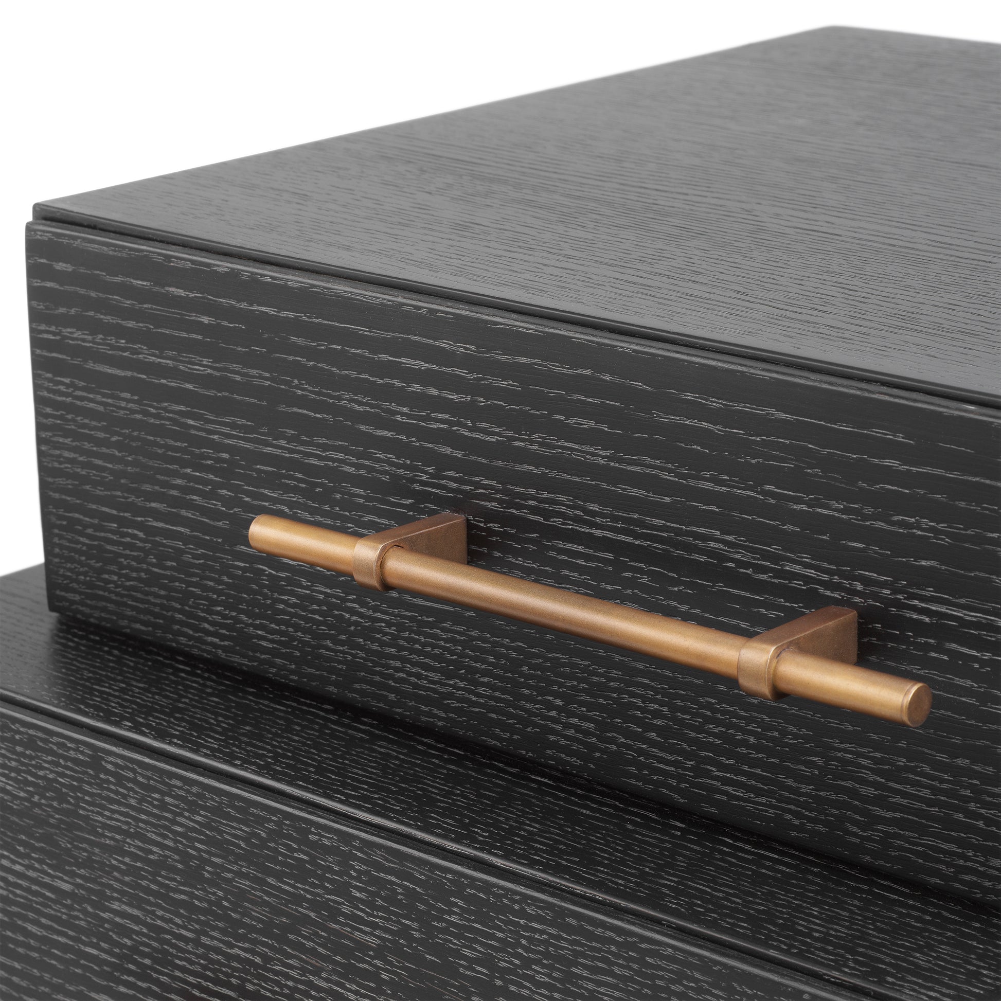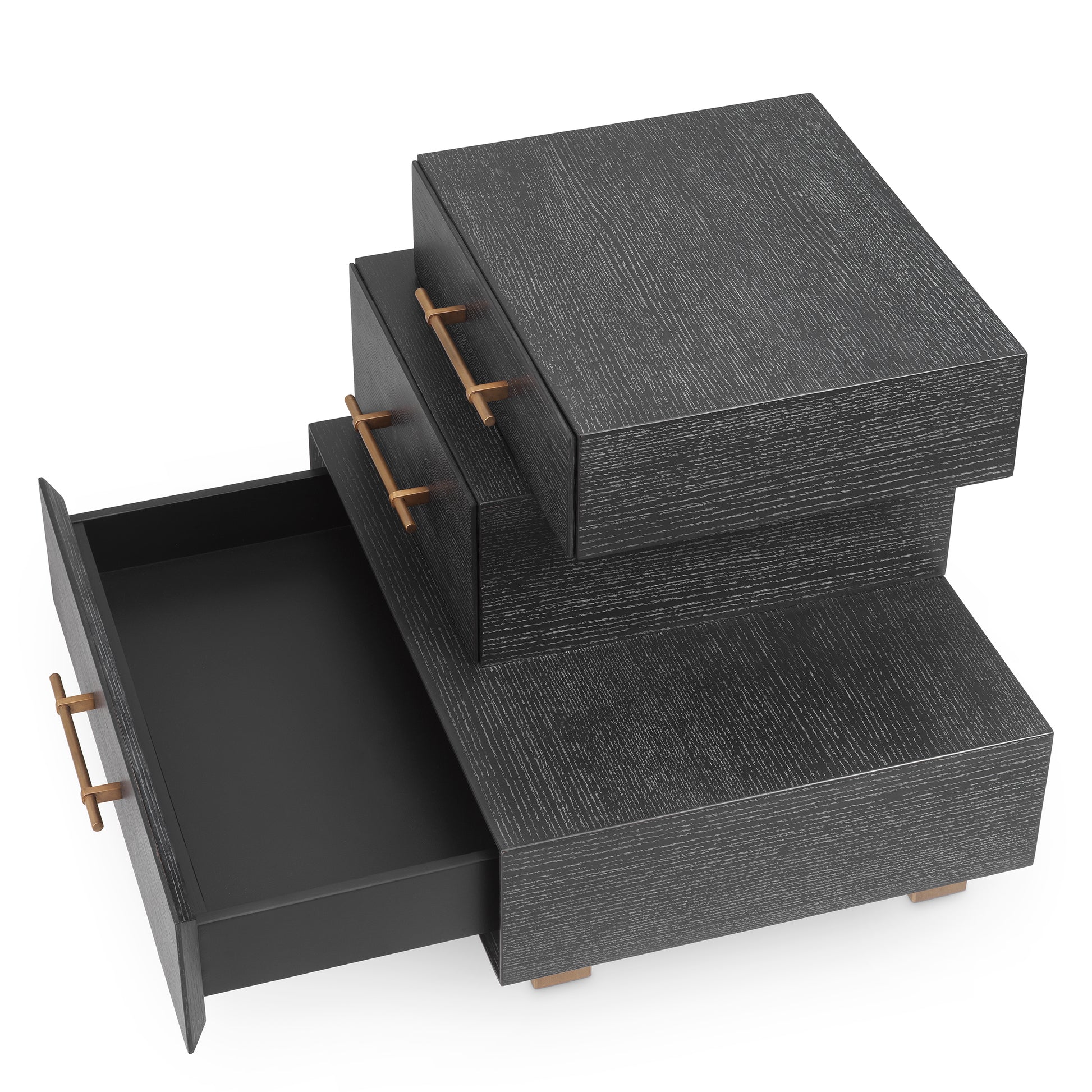 Upptäck sängbordet Evendale från Eichholtz, ett unikt nattduksbord som verkligen är ett konstverk. Tillverkat med stor skicklighet i ekfanér – ett lyxigt och hållbart material som tål tidens prövningar och som ger ett stilfullt lyft till alla rum. Den karaktäristiska designen består av tre lådor, alla placerade i olika vinklar för en spännande och unik finish. Handtagen och benen är i borstad mässingsfinish, vilket ger bordet ett tidlöst uttryck.