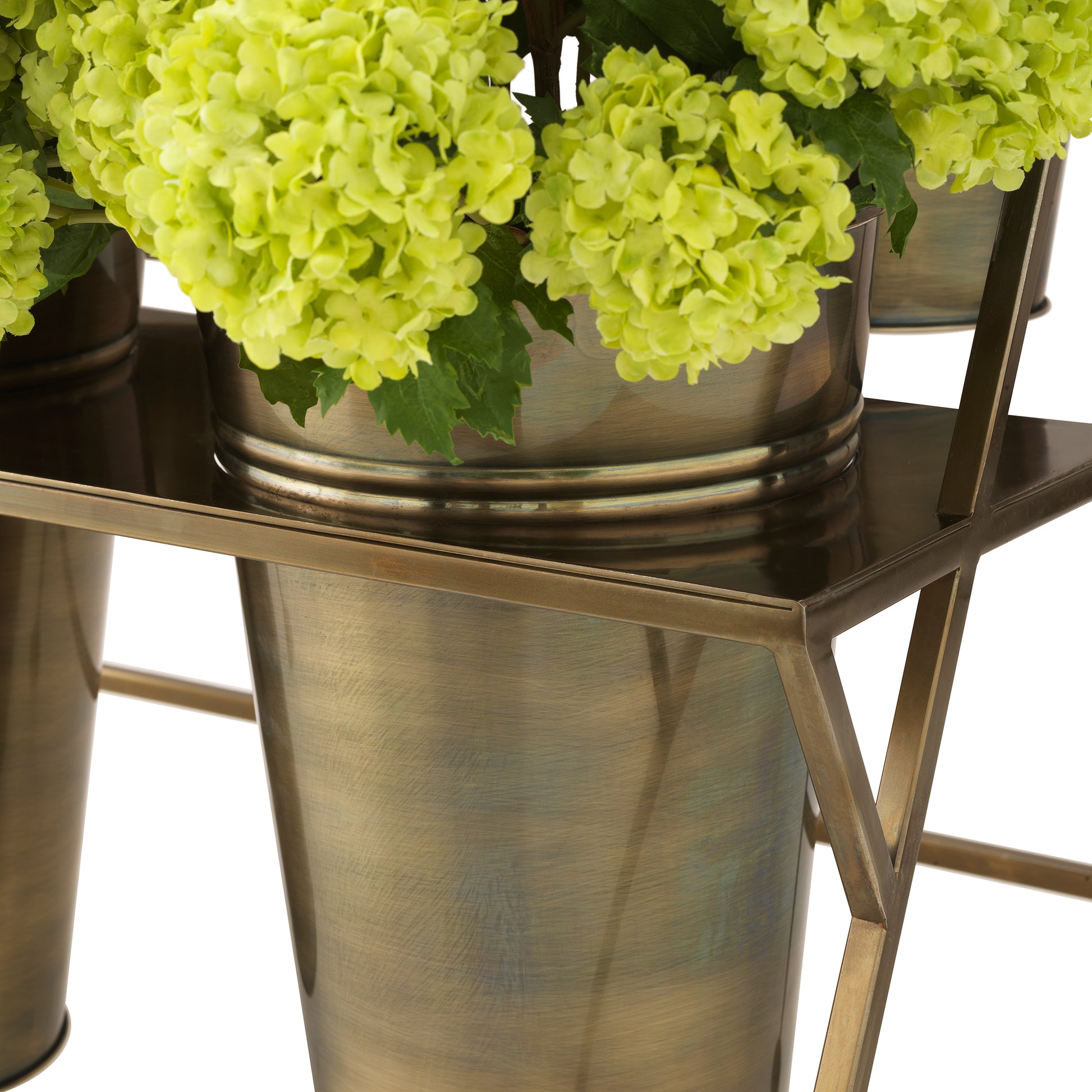 Displayställ Maison des Fleurs från Eichholtz i vintage-brass finish. Stället har sex hinkar som är utformade för att elegant visa upp Eichholtz konstblommor. Den varma metalliska ytan tillför en känsla av lyx och skapar en stilfull presentation som förhöjer varje noggrant utvald samling med tidlös charm och elegant närvaro.