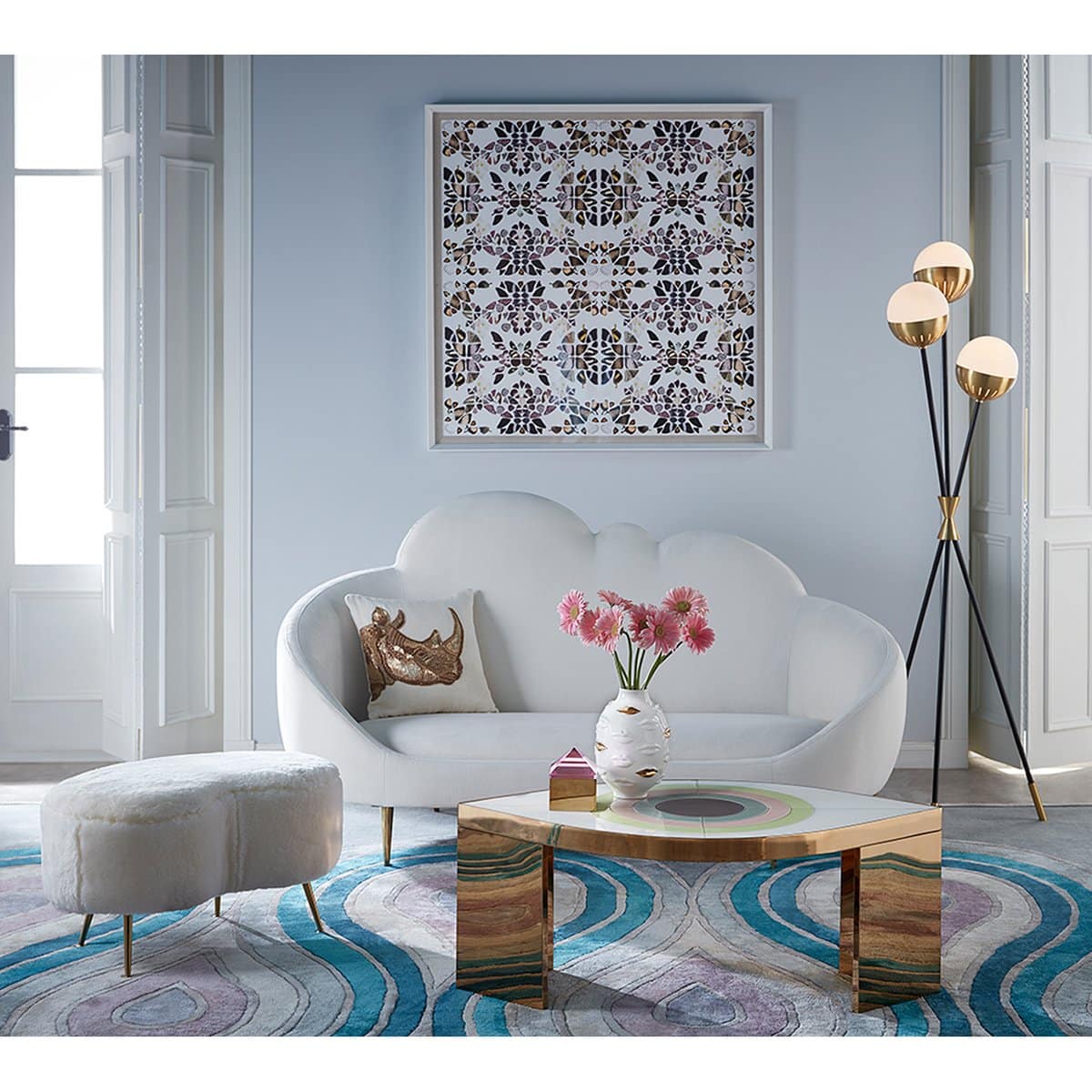 An elegant, fluid shape to give any room a swish of chic. The classic kidney-shaped silhouette gets an ultra-luxe makeover in shearling or a jewel-toned turn in lavender or turquoise velvet. Twinkly, angled brass legs take it to the next level. A curvaceous complement to any lounge chair or sofa.