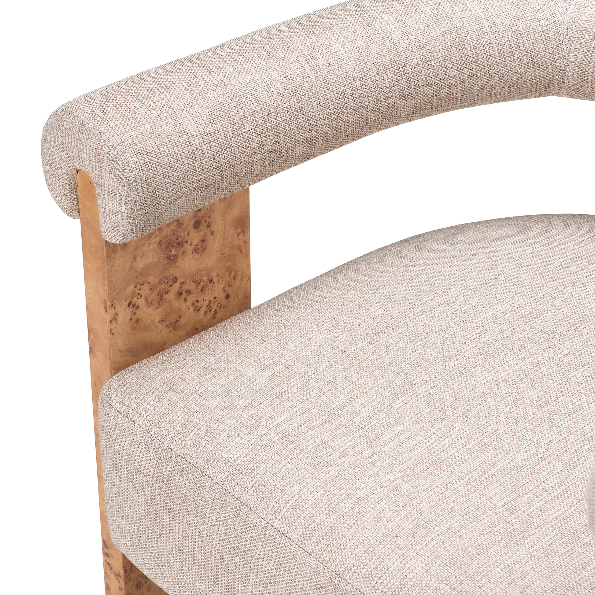Upptäck Matstolen Percy från Eichholtz, där ljusbrun mappa burl-fanér möter den naturliga värmen från Loki-tyget. Mappa burl är känt för sina intrikata, virvlande ådringar och rika visuella djup, vilket ger stolen en unik karaktär. Kombinationen av noggrant utvalda material och jordnära toner skapar en inbjudande silhuett som utstrålar diskret elegans och taktil lyx, perfekt för sofistikerade interiörer med tidlös charm.