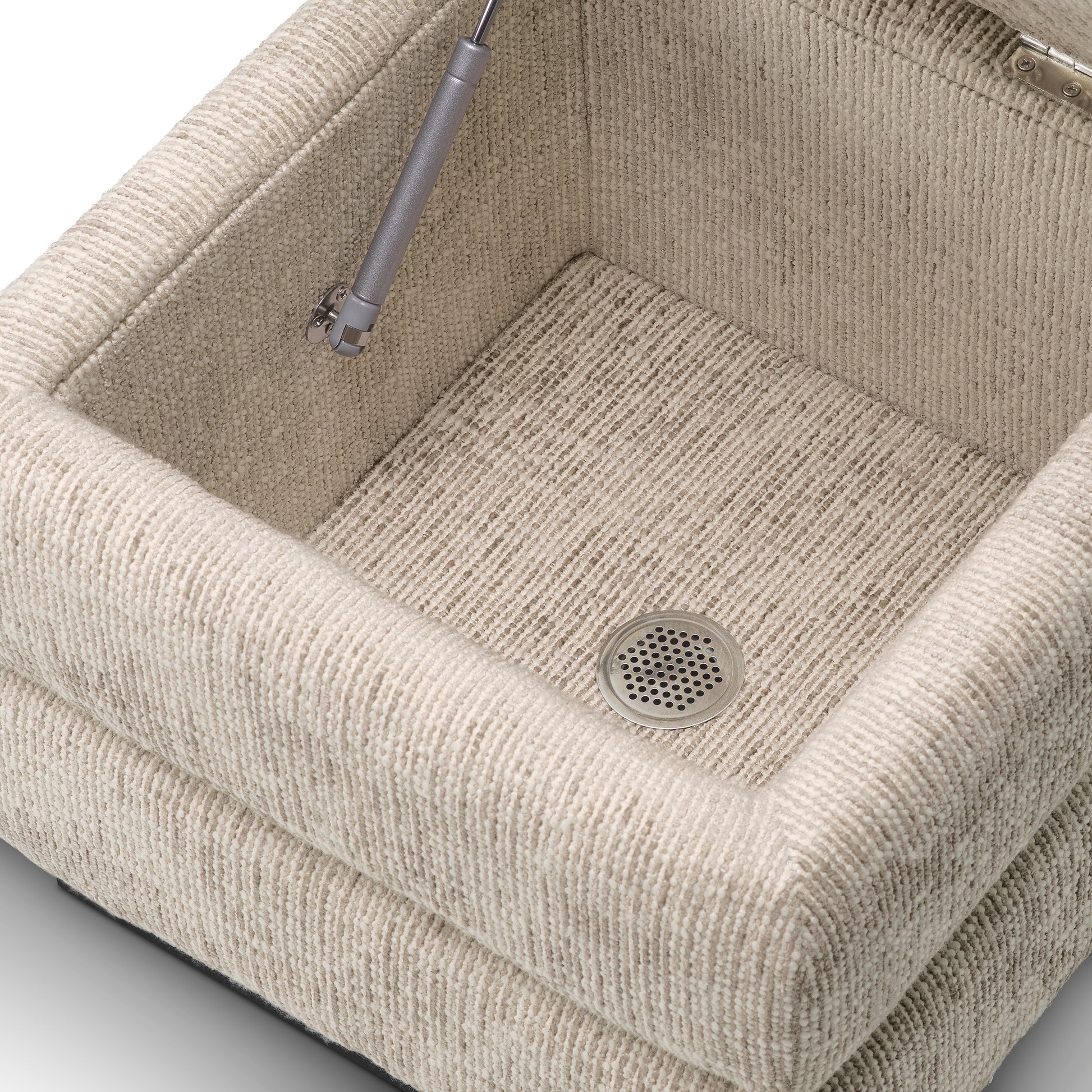Pall Valmont från Eichholtz har en sittdyna i lyxigt Creststone beige-tyg på en bas i ebony-finish, vilket kombinerar komfort med praktiskt förvaringsutrymme. Den integrerade luftsystem-armen förbättrar användarvänligheten och gör denna stilfulla möbel till en perfekt blandning av funktion och tidlös design.