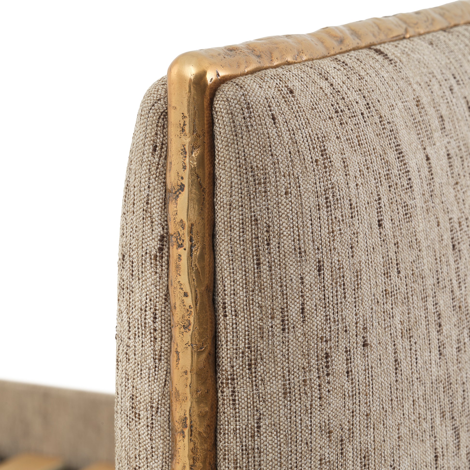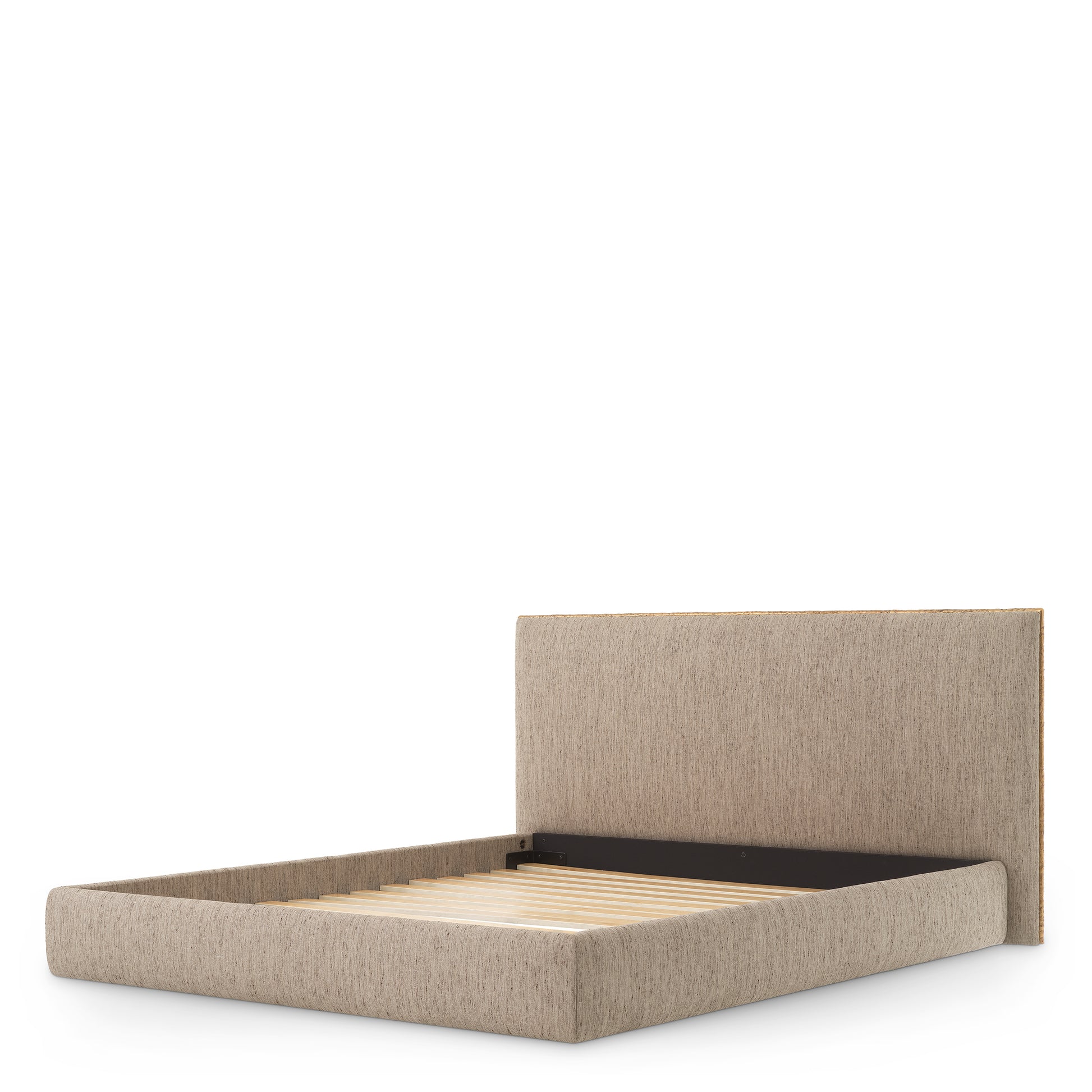 Sängens karaktäristiska detalj är den dekorativa kanten i hamrad metall med guldfinish på huvudgaveln. Den subtila kontrasten mellan det mjuka tyget och metallen ger sängen ett sofistikerat och tidlöst uttryck som passar både moderna och klassiska inredningar.