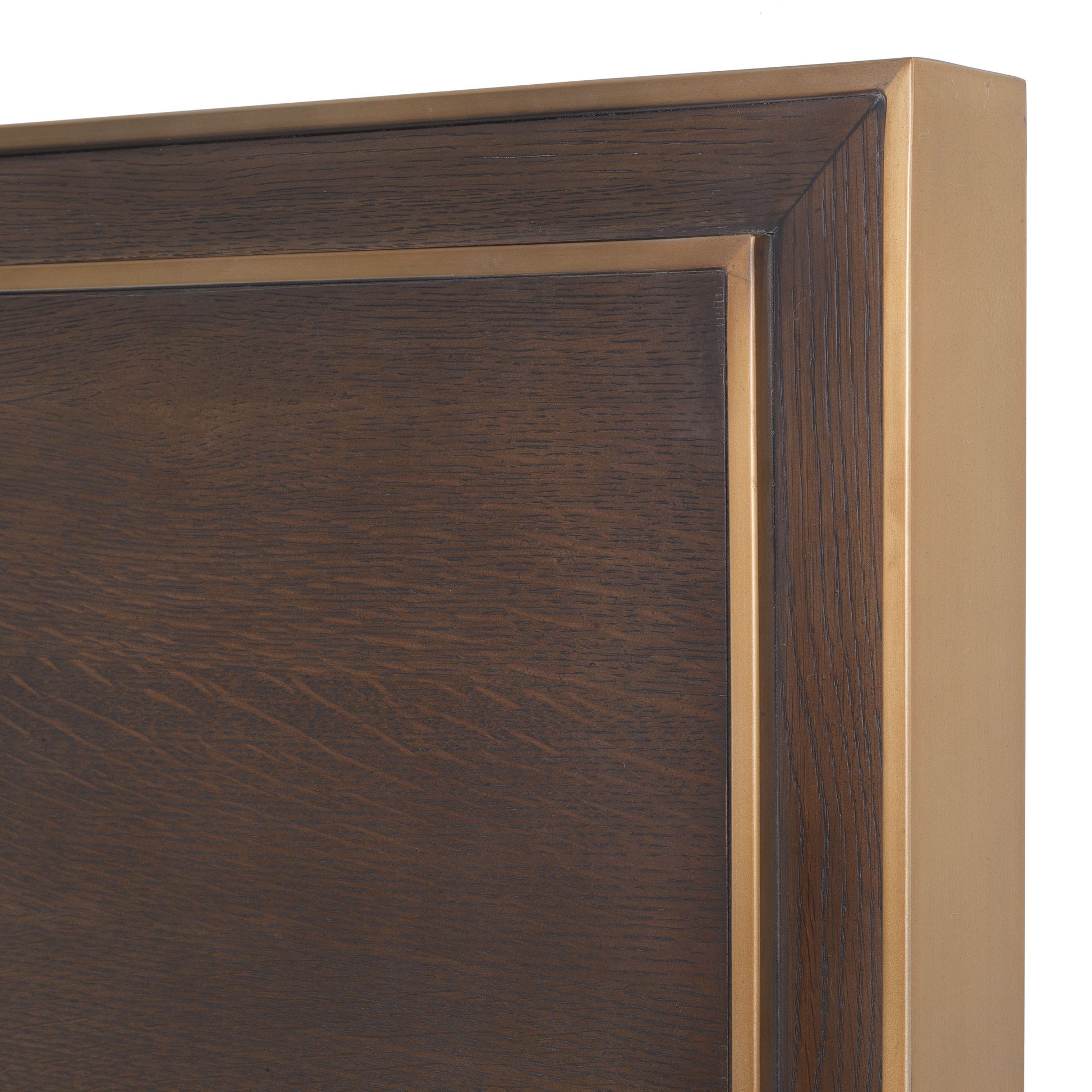 Med sängram Camelot från Eichholtz, läckert tillverkad i brun ekfaner, gifter sig snygg och modern design med retro tonerl. Detaljer i borstad mässingsfinish pryder huvudgaveln i denna underbara dubbelsängsram som passar resårbotten på 180x210cm. (säng/resårbotten/madrass o.dyl. ingår ej)