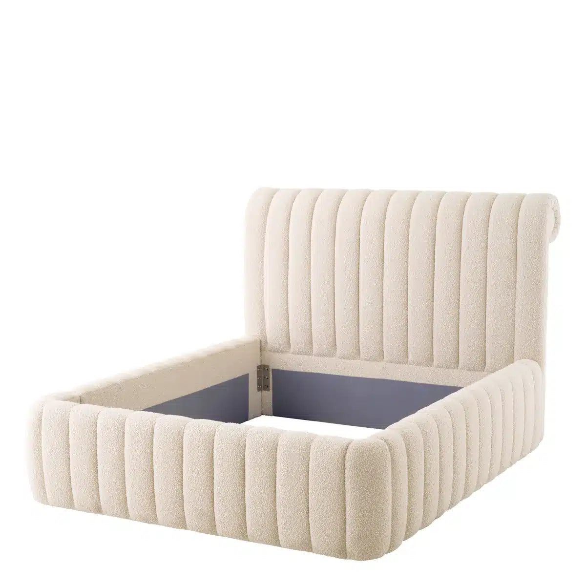 Sängramens överdrag i exklusivt bouclé-tyg i krämvitt utstrålar både stil och komfort. Det mjuka, texturerade tyget ger inte bara en visuellt tilltalande struktur, utan känns också otroligt mjukt mot huden, vilket gör att varje natt känns som en lyxig retreat. Den välpolstrade designen, med sina distinkta vertikala kanaler, skapar en omslutande känsla som inbjuder till djup avslappning.