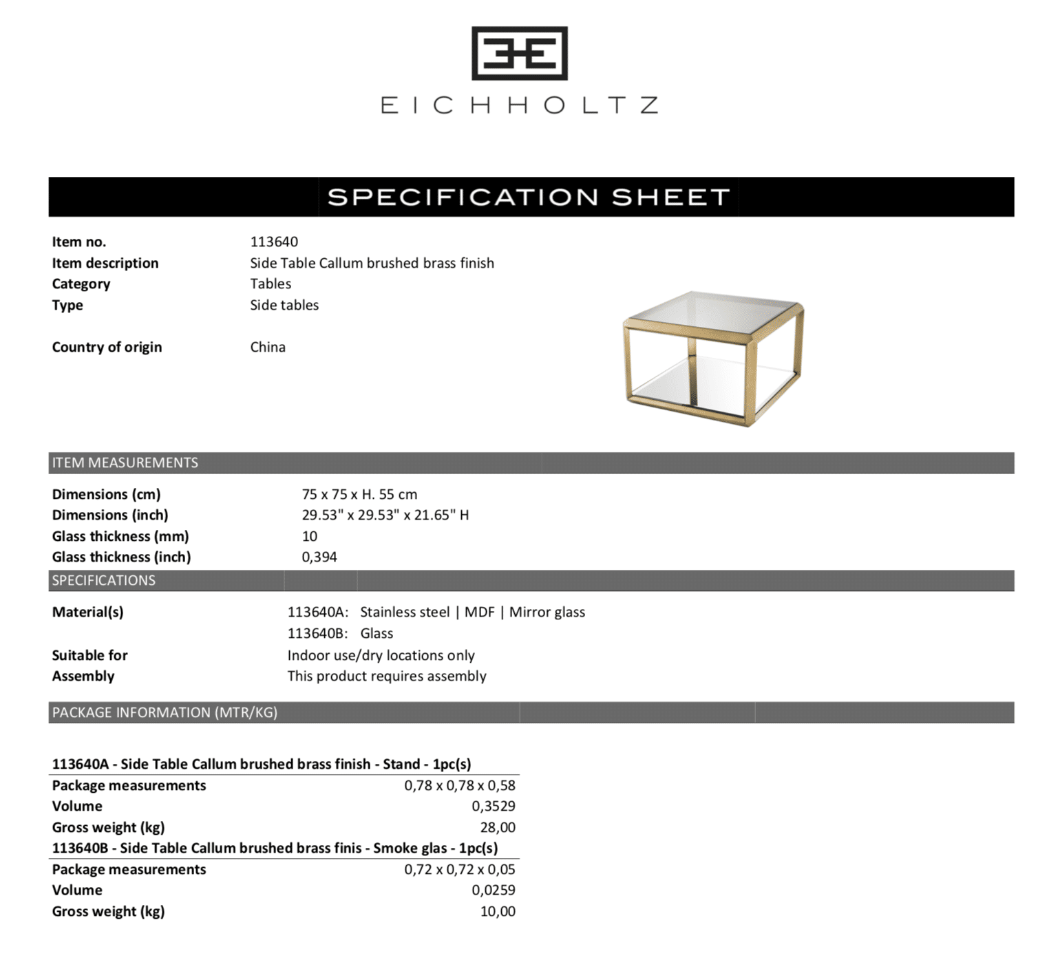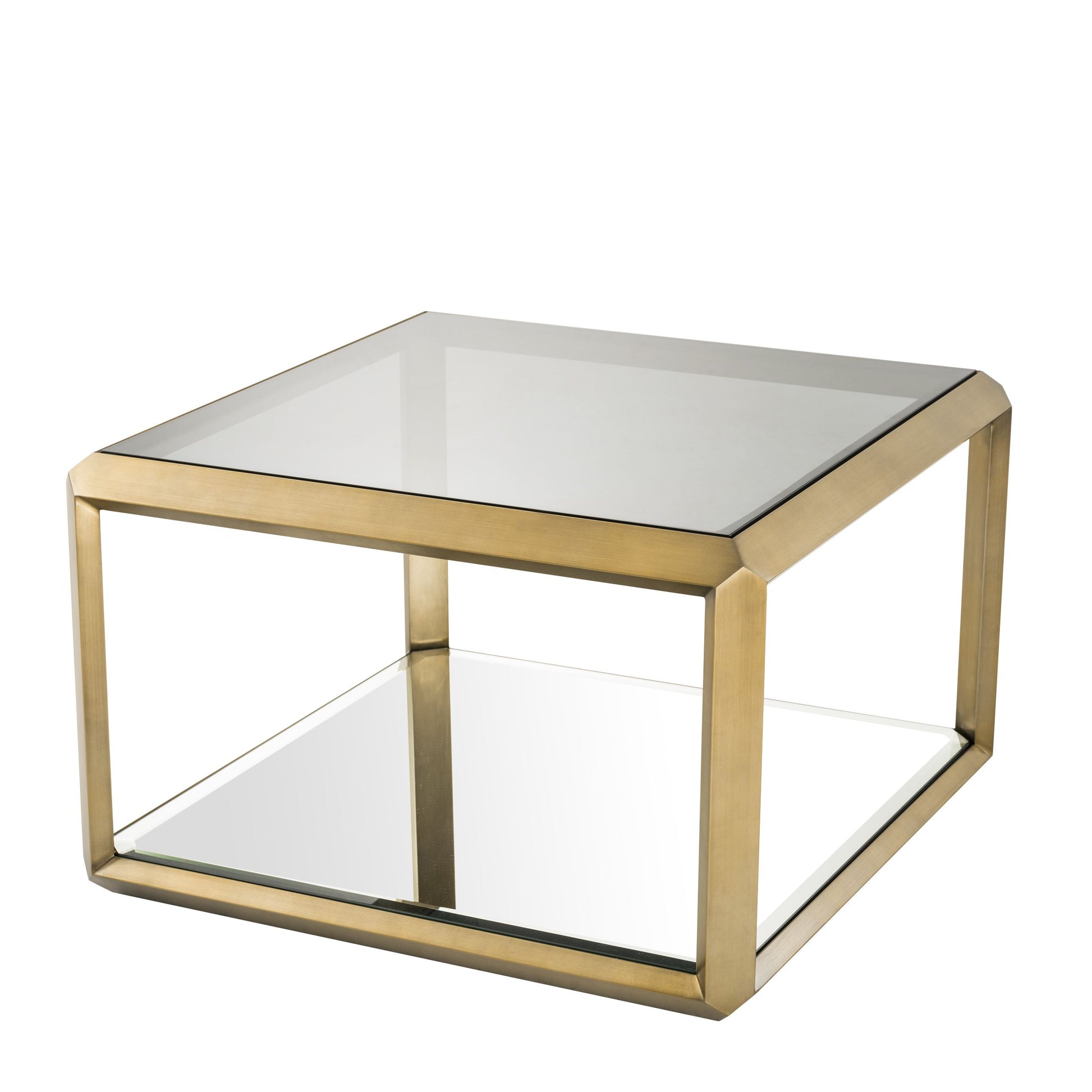 Läckert och väldesignat kvalitetsbord i borstad mässingsfinish, rökfärgat glas och spegelglas. Kombineras gärna med soffbord Callum och konsolbord Callum.