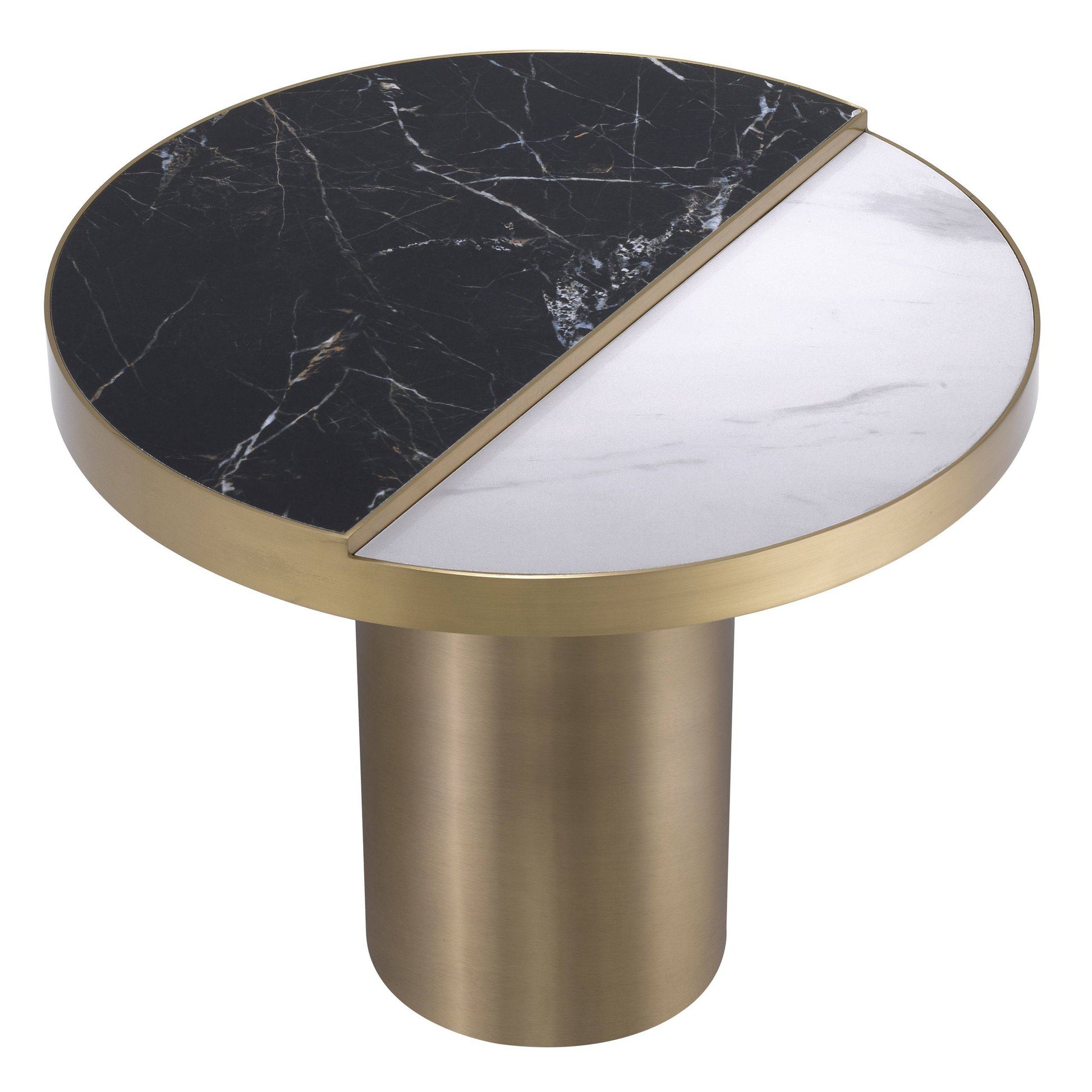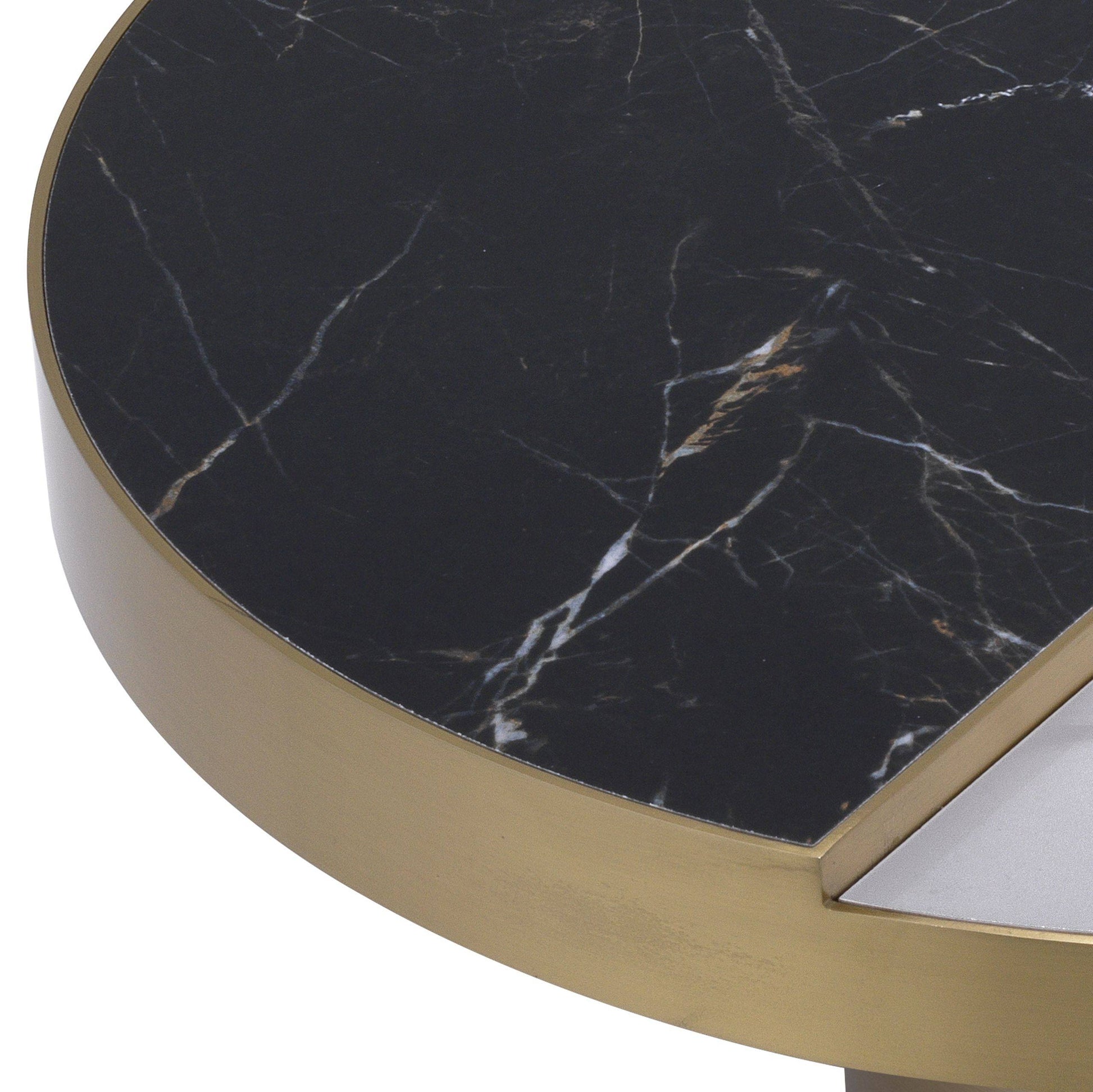 Toppa upp ditt vardagsrum med detta extremt eleganta sidobord. Den exceptionella bordsskivan består av två halvcirkelformade keramiska plattor i vit och svart marmorfinish. Jämfört med den vita marmordelen är den svarta marmordelen större och något upphöjd, vilket ger ett härlig liv och spännande uttryck i bordet. Bas i borstad mässingsfinish.