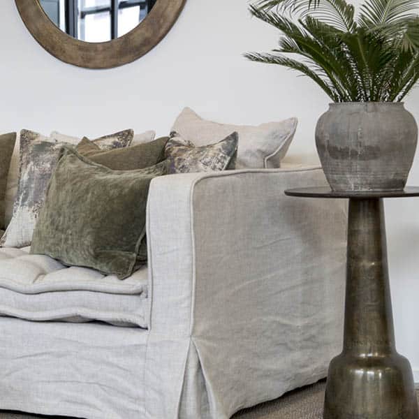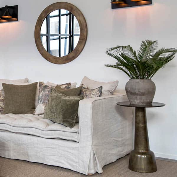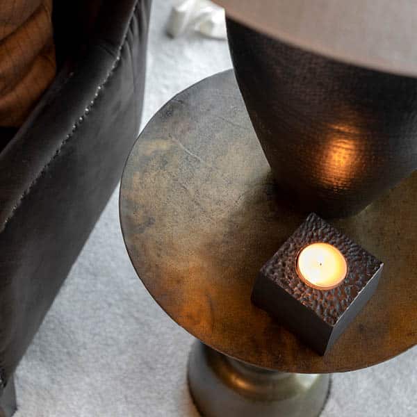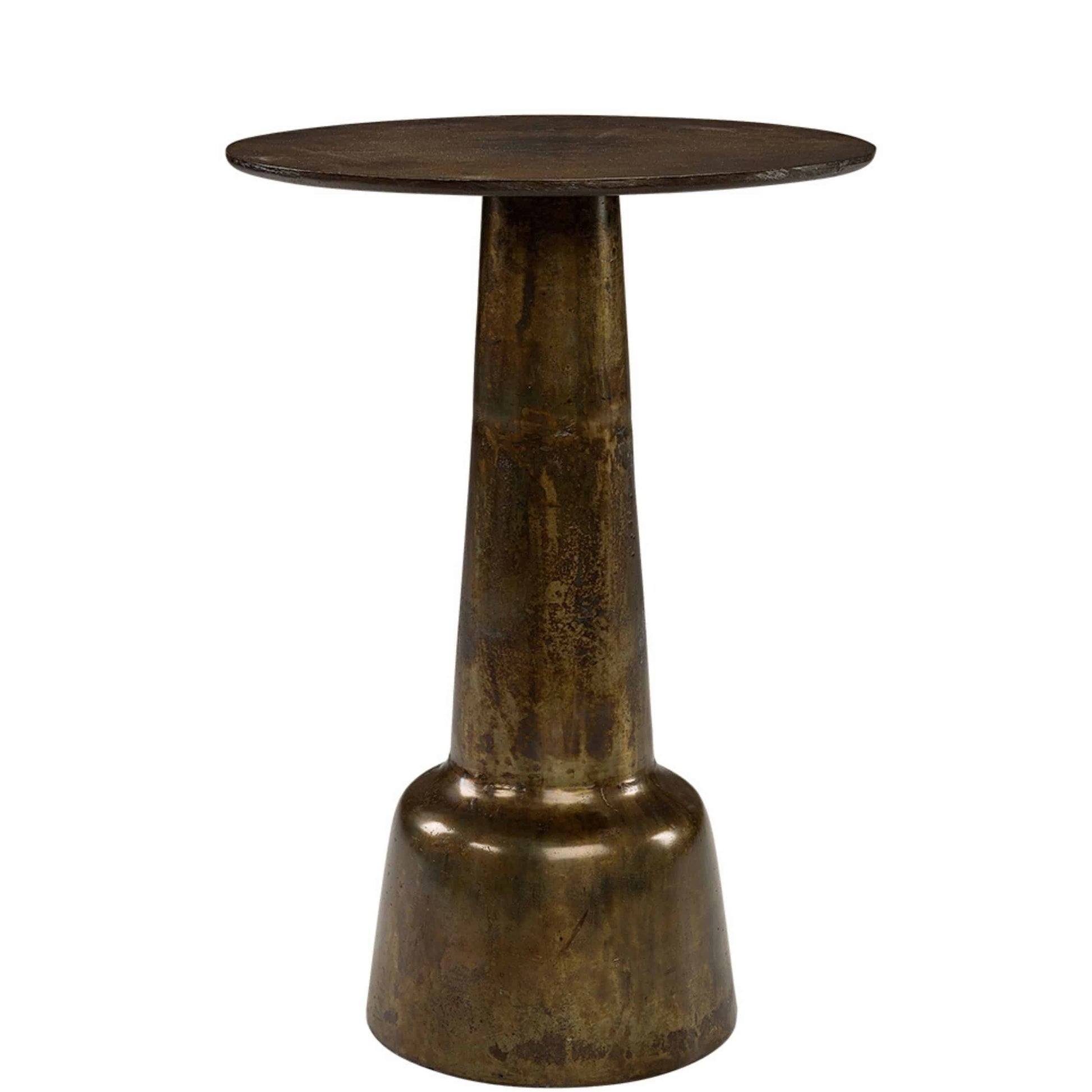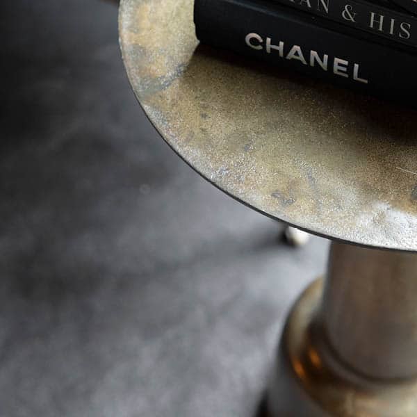 Runt sidobord i metall med en sofistikerad svarvad piedestalbas. En perfekt kombination av modern elegans och klassiskt hantverk – detta stilfulla sidobord ger både karaktär och funktionalitet till ditt hem. Varje bord är unikt, med subtila variationer i finish och detaljer som förstärker dess charm och exklusivitet.