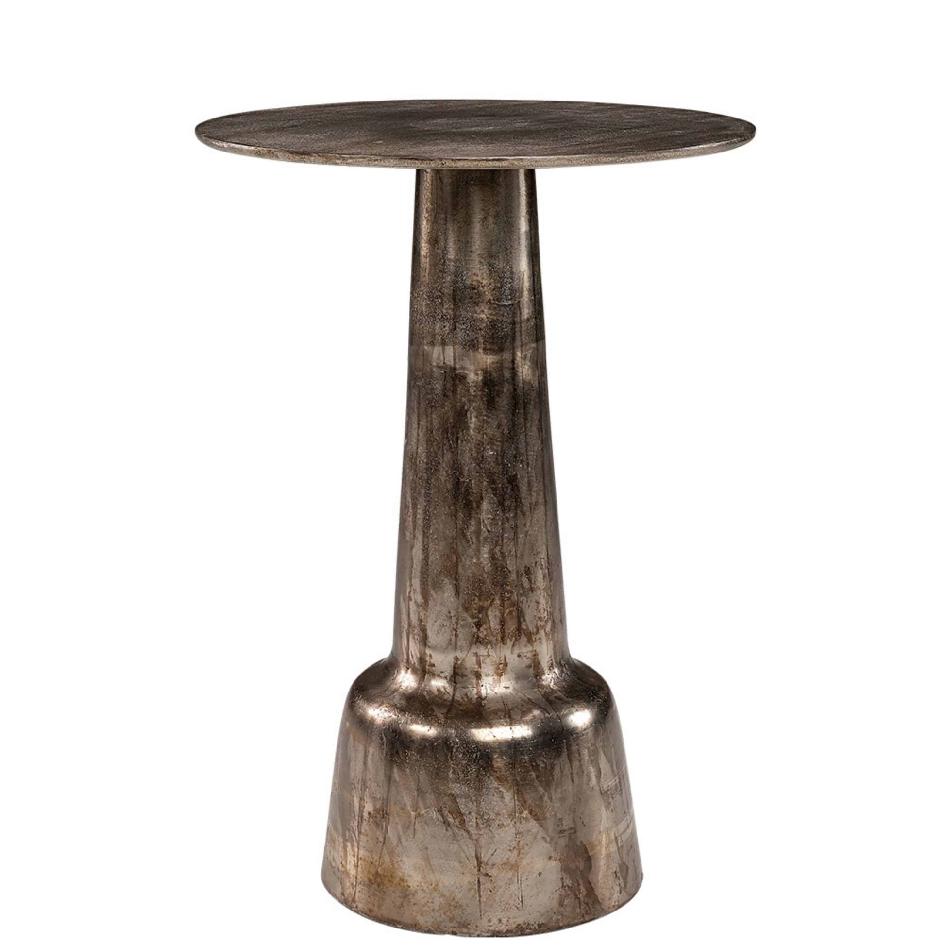 Tillverkat av högkvalitativ metall har bordet en slät och hållbar yta med en raffinerad finish, vilket gör det idealiskt för moderna, industriella eller vintage-inspirerade interiörer. Den elegant formade foten ger en konstnärlig och sofistikerad touch, vilket gör detta sidobord till mer än bara en praktisk möbel – det blir ett designinslag i ditt hem.