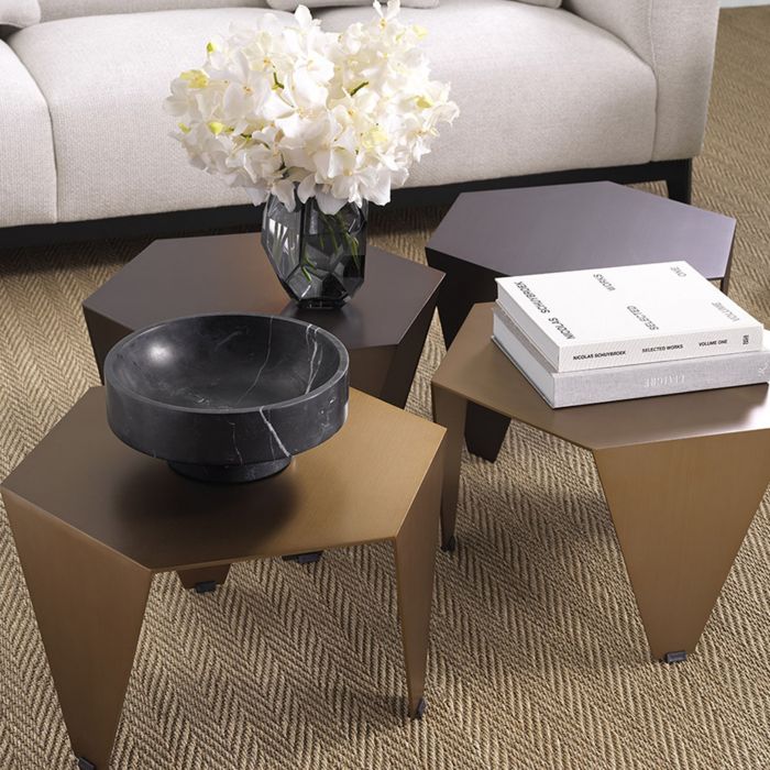 Med en sexkantig bordsskiva och tre avsmalnande ben i bronsfinish ger Metro Chic Side Table en geometrisk accent till ditt vardagsrumsinredning. Denna moderna design utstrålar modern stil och kombinerar enkla former med lyxigt material. Placera flera bord tillsammans och blanda med den borstade mässingsversionen för att skapa en dynamisk grupp