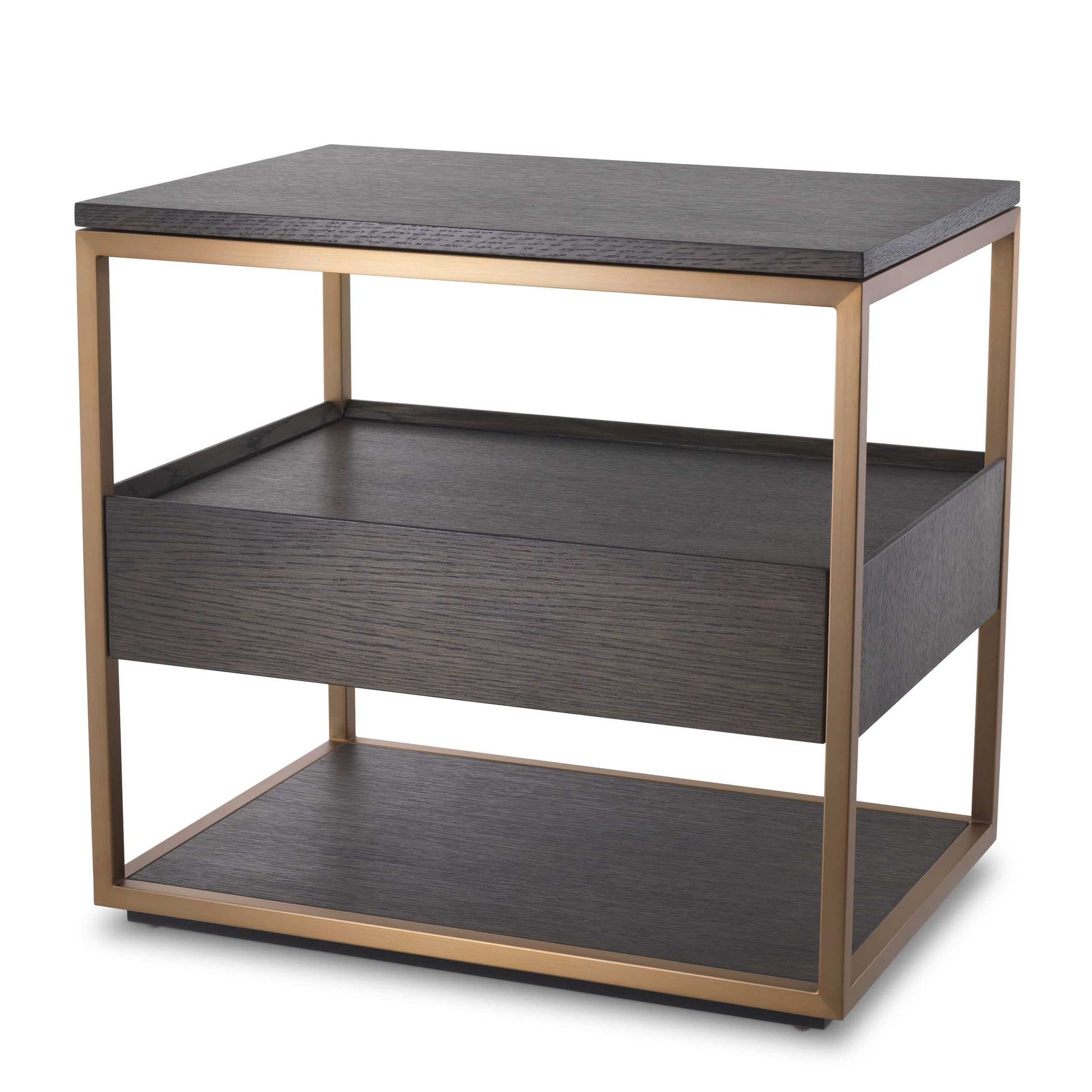 Sidobord Parker från Eichholtz är ett mycket läckert och sobert avställningsbord med både öppna hyllplan samt en praktisk låda som rymmer mycket förvaring. En elegant och snygg möbel i ekfaner och benställning i borstad mässingsfinish. Läckert, exklusivt och tidlöst.