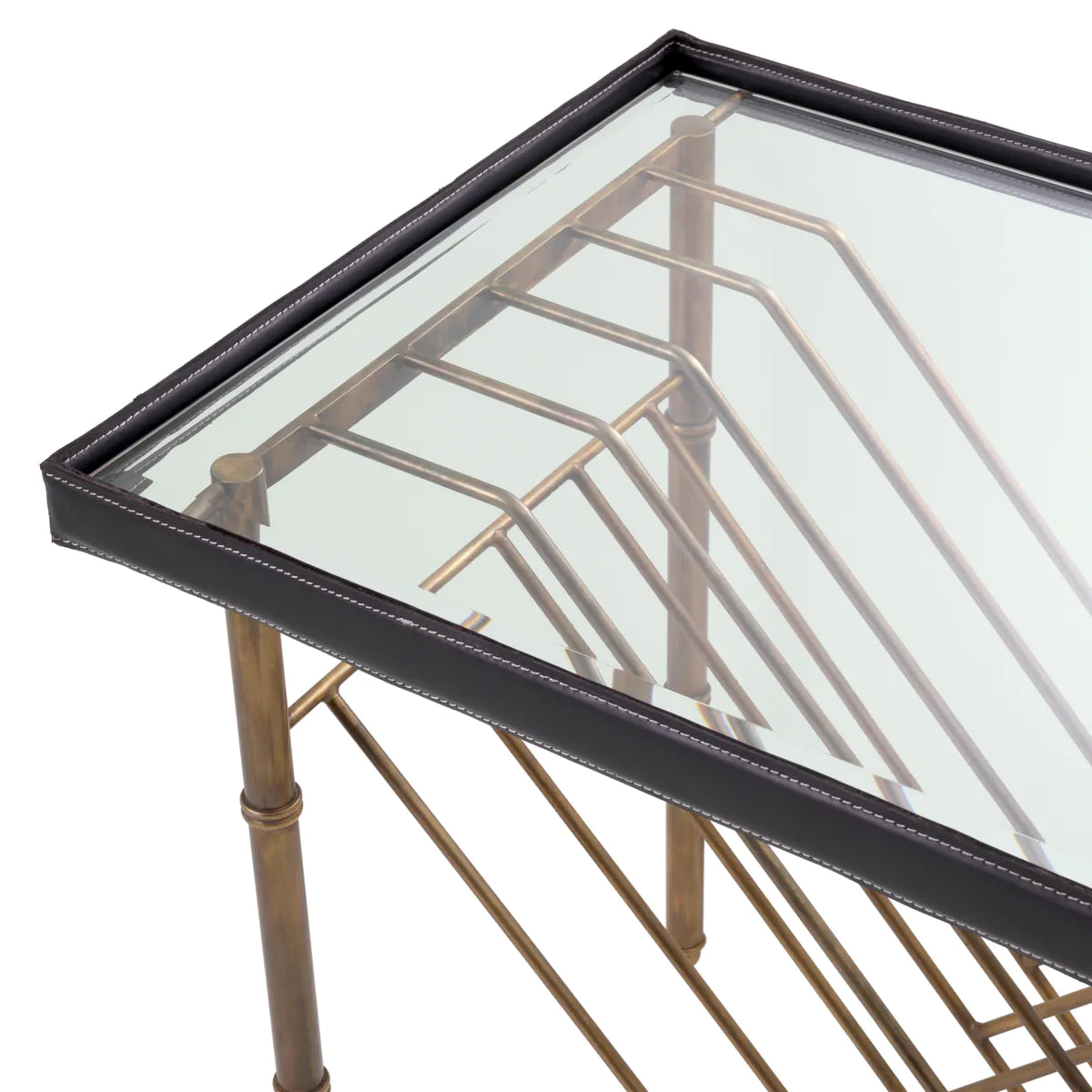 Bordet har en vintage brass finish som ger en lyxig och tidlös känsla, och den äkta svarta läderklädseln runt det rektangulära glaset tillför både textur och stil. Den robusta basen i vintage brass ger bordet en stabilitet och en extra dimension av elegans. Med sin praktiska tidningshållare erbjuder bordet även gott om plats för att förvara tidningar, böcker eller andra småsaker på ett organiserat sätt, vilket gör det till ett utmärkt val för både vardagsrummet och andra sociala utrymmen.