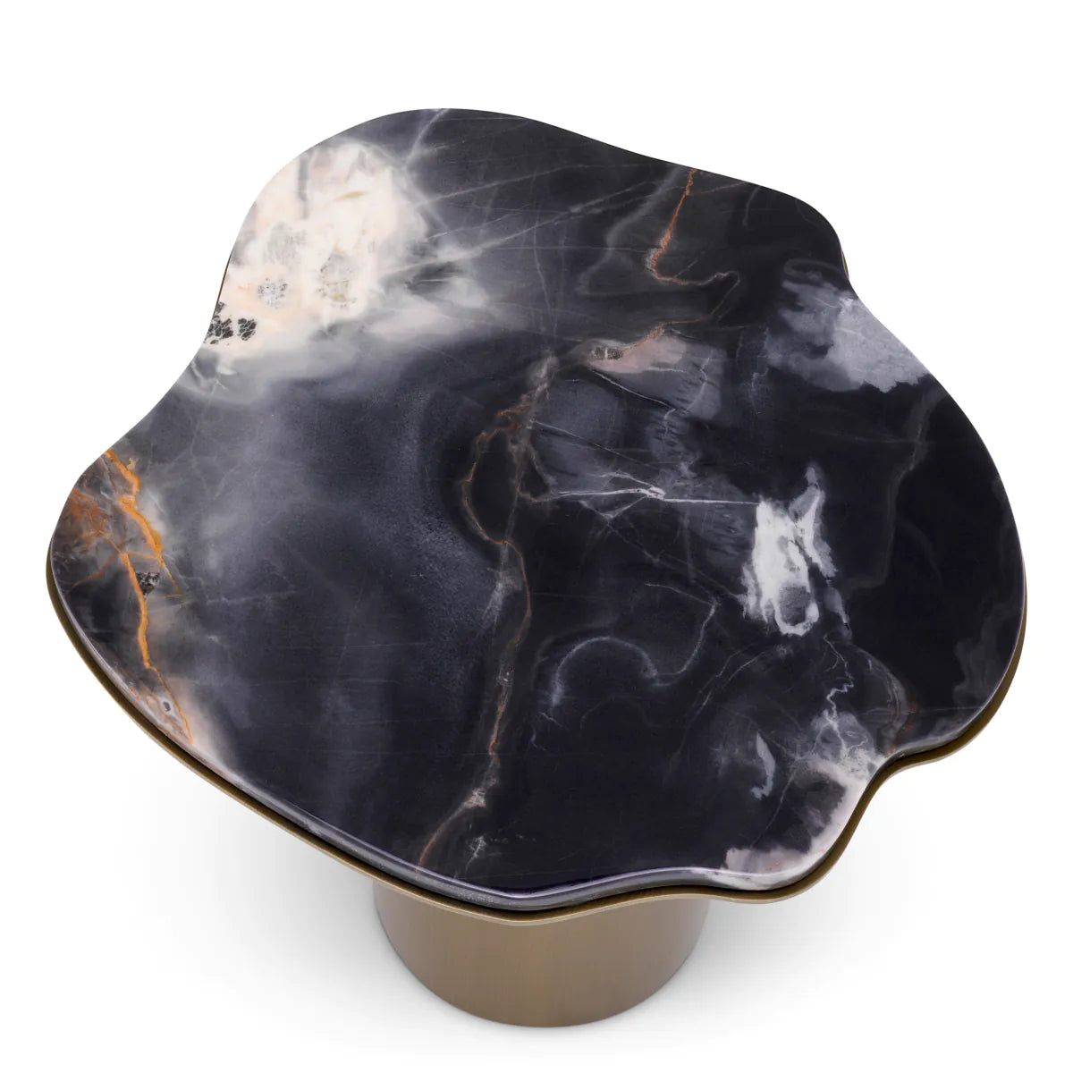 Detta exklusiva sidobord kombinerar en unik, konstnärlig design med en tidlös känsla av lyx. Den organiskt formade marmorskivan, med sina naturliga ådringar och mönster, skapar en elegant kontrast mot den borstade mässingsfinishen på basen. Den harmoniska blandningen av material gör bordet till en iögonfallande detalj i ditt hem, oavsett om det används som ett stilfullt avlastningsbord eller en dekorativ accent.
