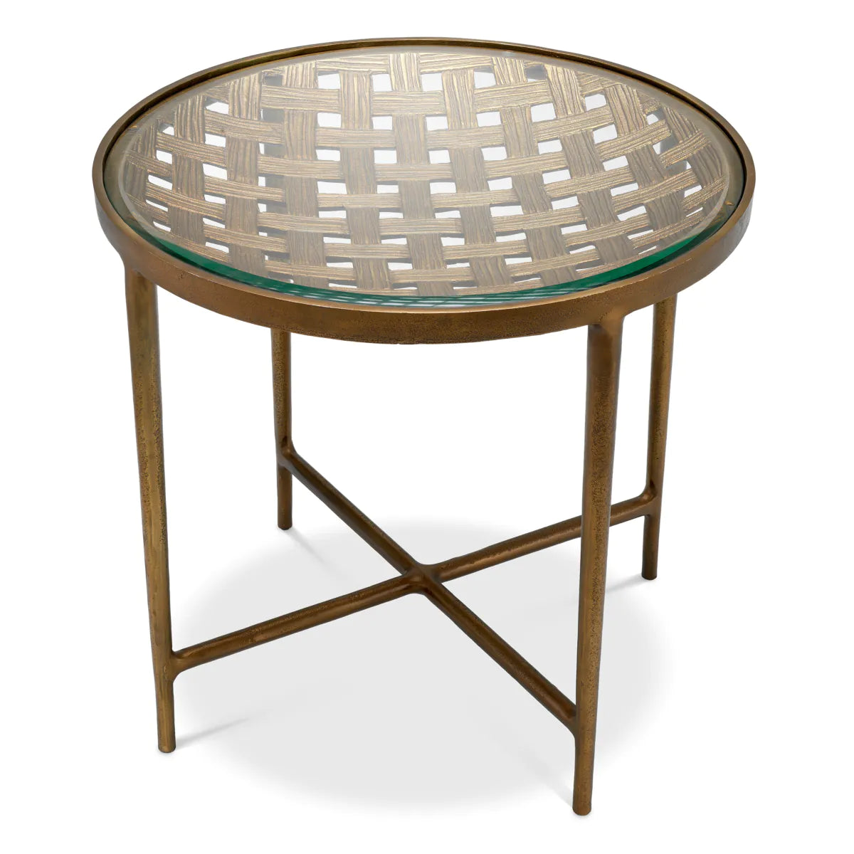 Den intrikata flätade designen i en utsökt antik mässingsfinish ger bordet en konstnärlig och exklusiv känsla, medan den klara glasskivan skapar en luftig och sofistikerad estetik. Kombinationen av gediget hantverk och tidlös design gör detta sidobord till ett perfekt tillskott för den som uppskattar stilfull inredning med en touch av lyx. Placera det bredvid en fåtölj eller soffa för en elegant accent i vardagsrummet, eller använd det som ett dekorativt inslag i sovrummet – Matcha med soffbordet Sorrento.
