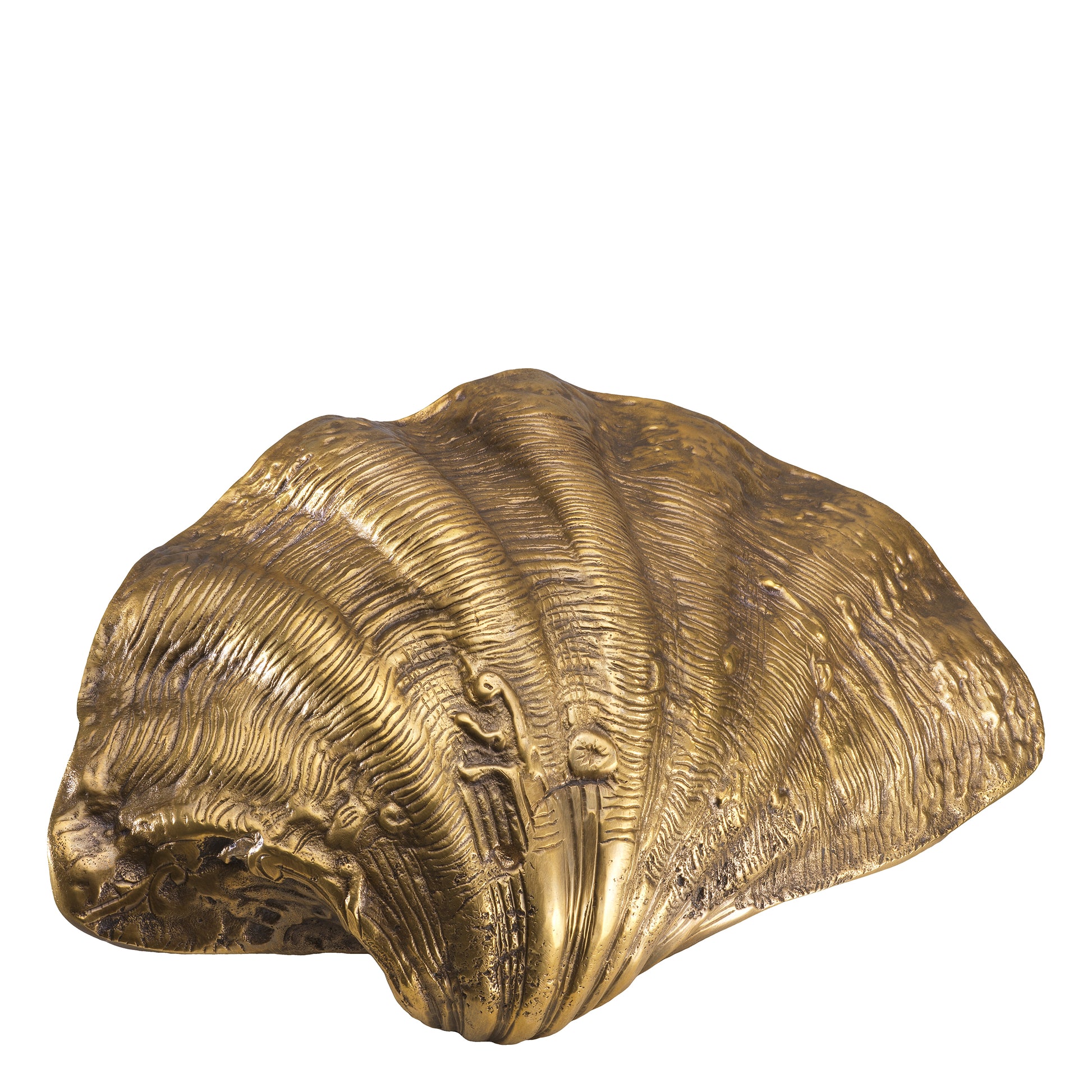 Formgiven som ett snäckskal och gjuten i solid mässing med vintagefinish, fungerar den både som skål för småsaker eller som ett fristående blickfång. Varje exemplar har ett unikt mönster med naturliga variationer i färg, textur och form – detaljer som ger djup och karaktär.