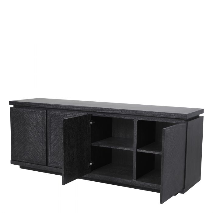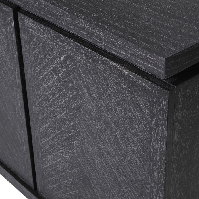 Tillför en iögonfallande inredningsdetalj till ditt vardagsrum eller matplats med skänk Bowen. Den här moderna byrån, utförd i kolgrå ekfanerfinish, förenar enkelt förvaring med stil. Den har fyra handtagslösa dörrar som lämnar ett graciöst intryck med sina raffinerade fiskbensmönster.