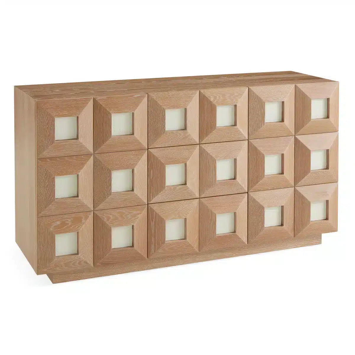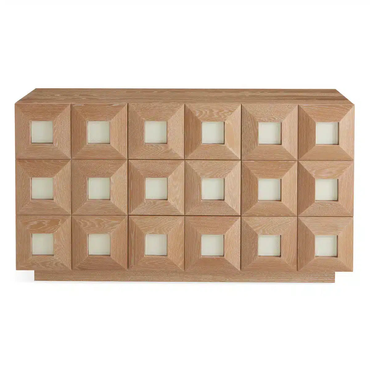 Tillverkad av stålborstad och kalkad massiv ek och kantad med ett dimensionellt mönster som fått inlägg i elfenbensläder detaljerade med tidlösa toppsydda kanter. Skänk Otto i ek erbjuder gott om förvaringsutrymme. En mycket exklusiv och läcker inredningsdetalj.
