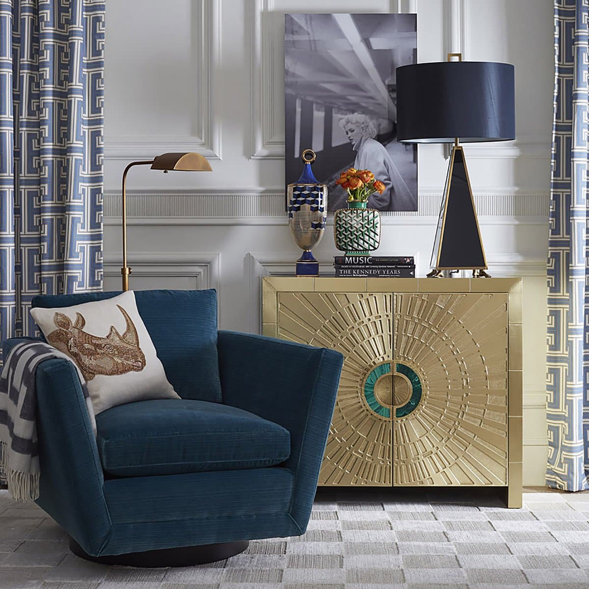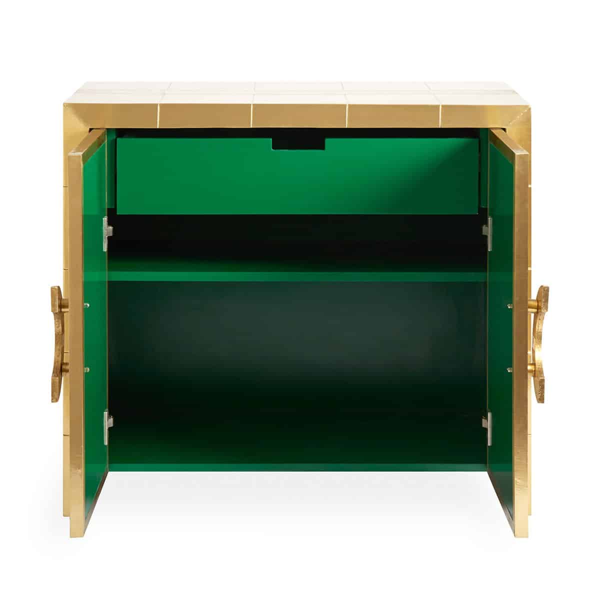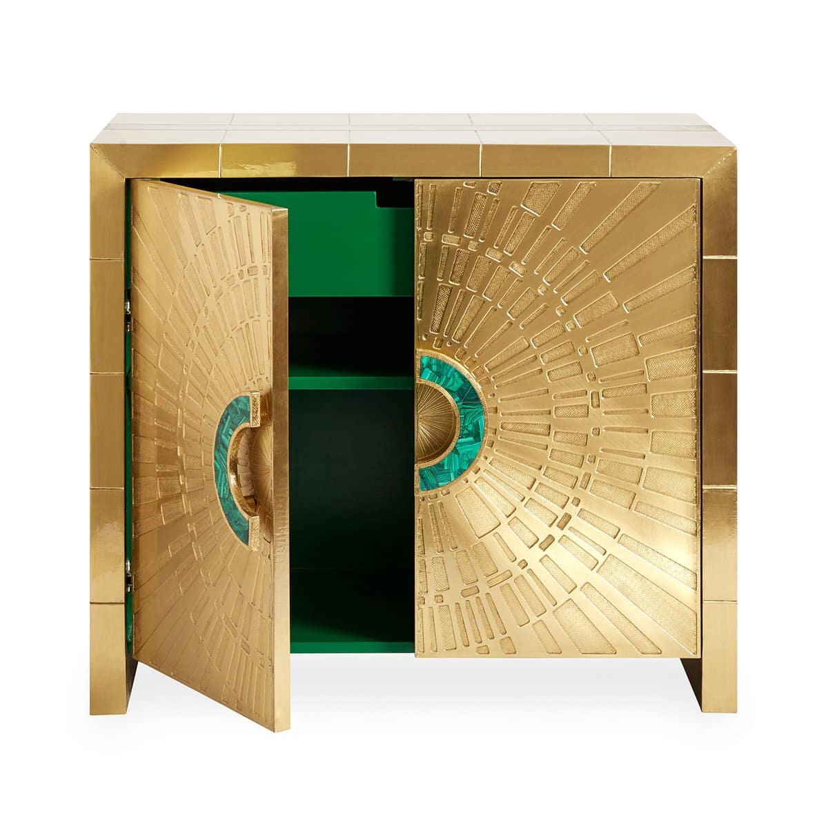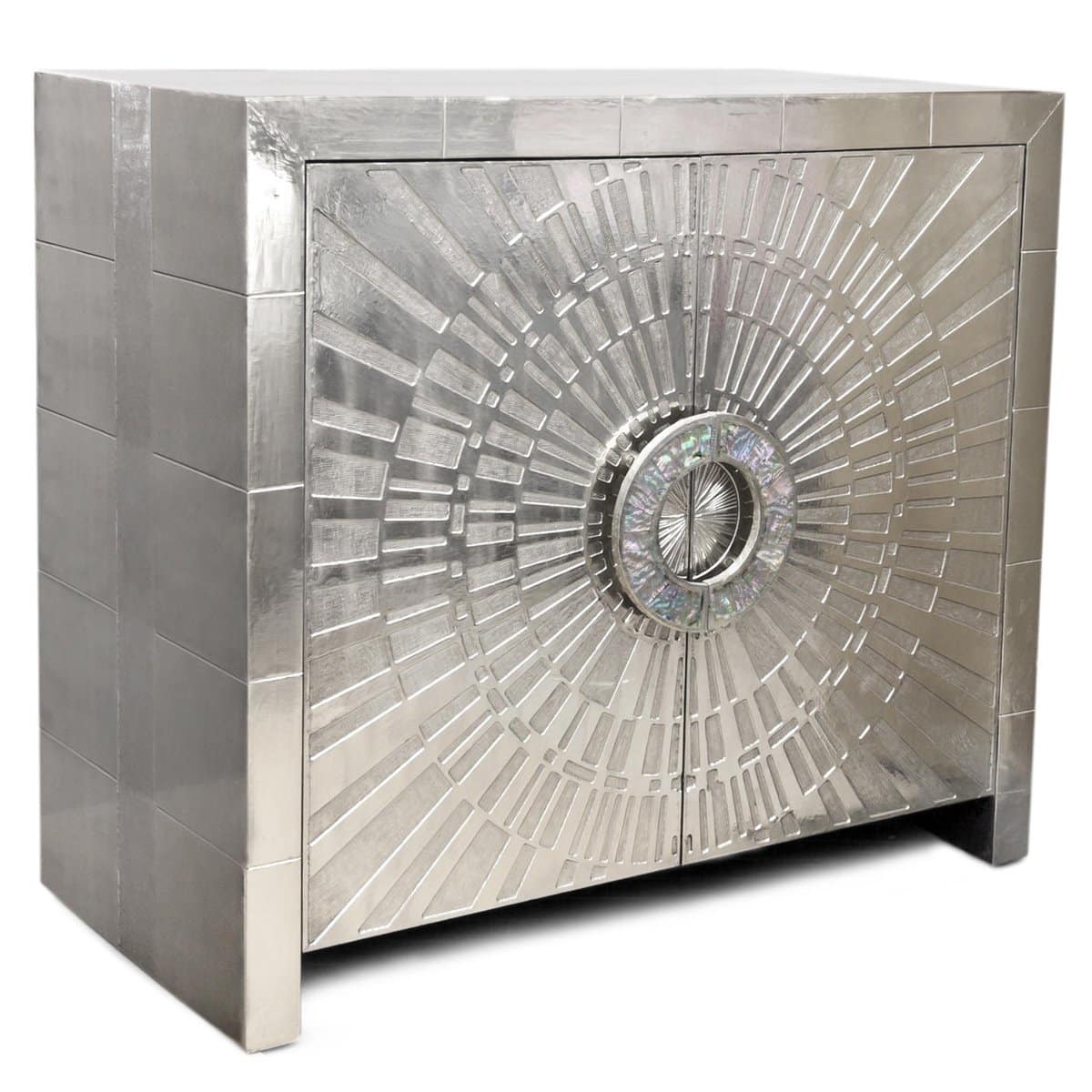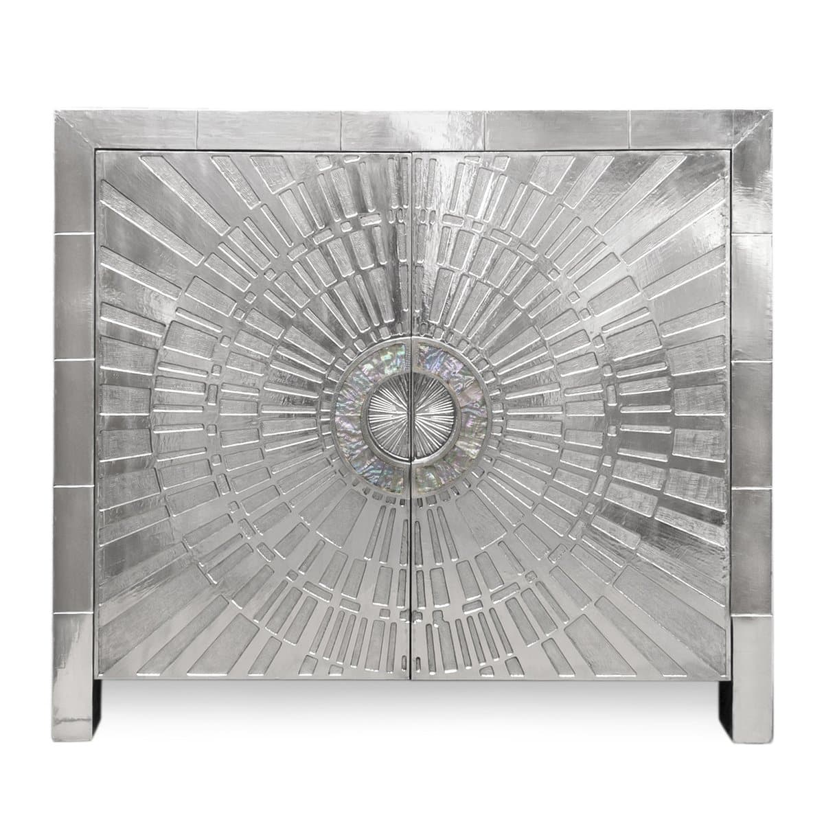 Our Talitha Cabinet features sheets of nickel-plated metal or solid brass hand-stamped into a modern starburst pattern routed onto solid wood. Each is capped with jewel-like door pulls featuring a luminous, hand-cut abalone shell mosaic, or naturally dazzling emerald malachite.