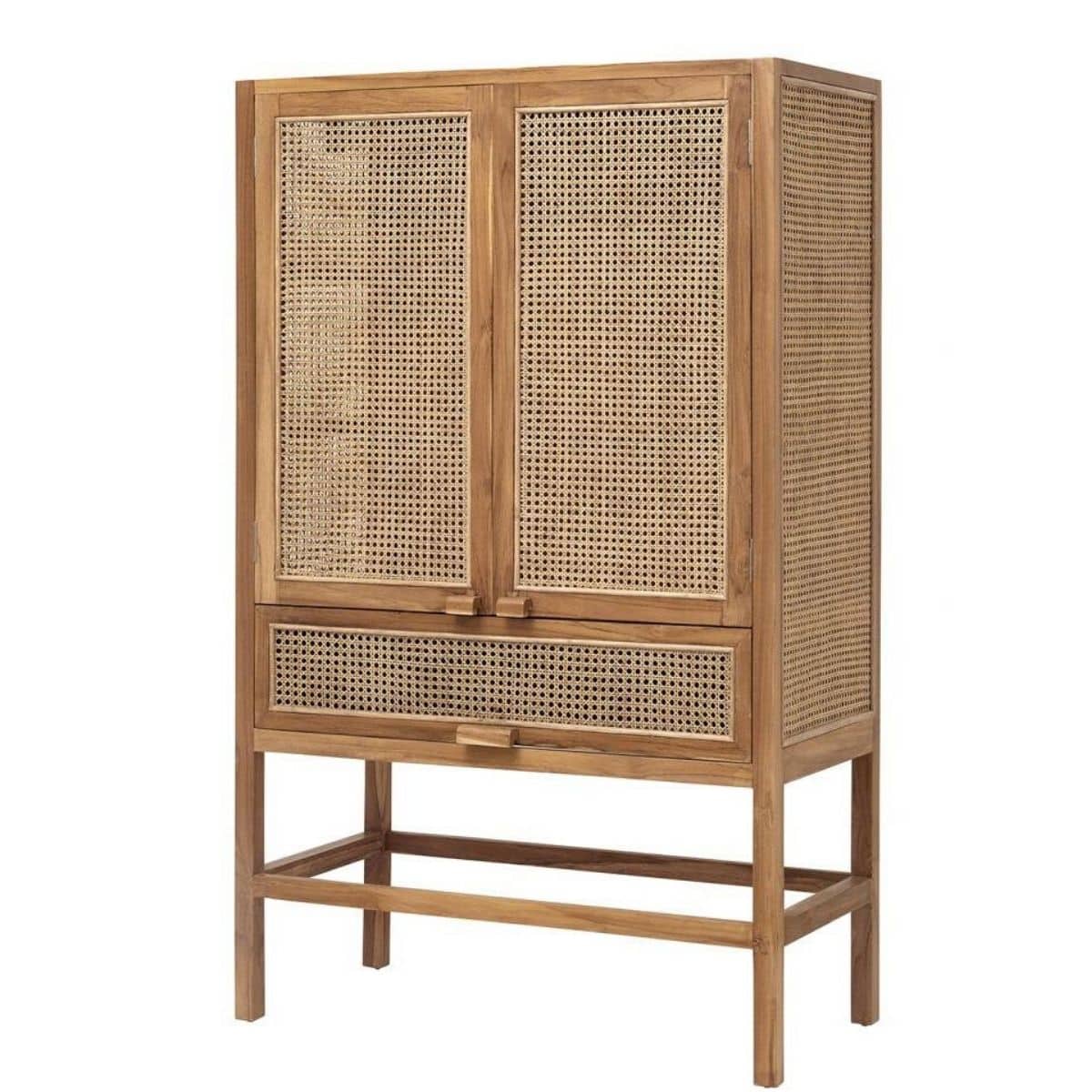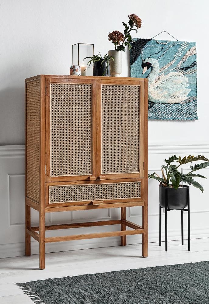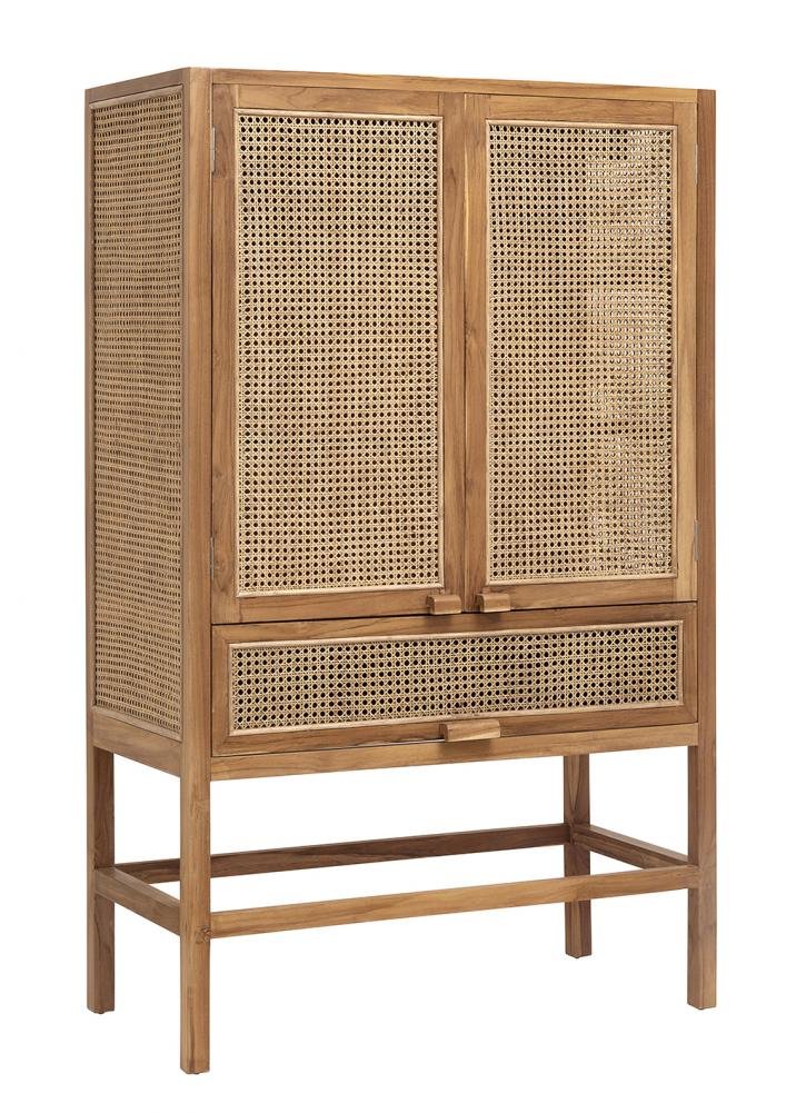 Charmigt och vackert skåp i teakträ. Skåpet har två hyllor bakom de två dörrarna i flätad rotting och en praktisk låda för generös förvaring. Ett läckert skåp i en vacker design och med en mycket fint utseende i antingen naturlig teak eller svart.