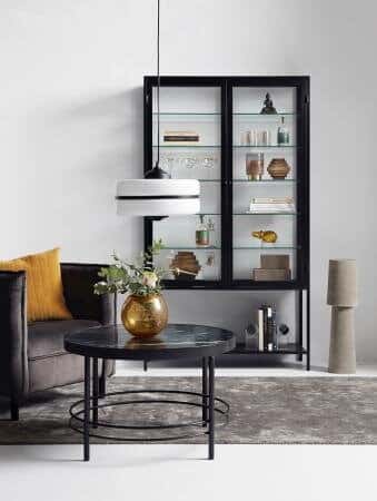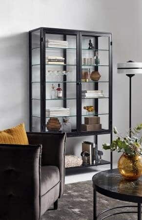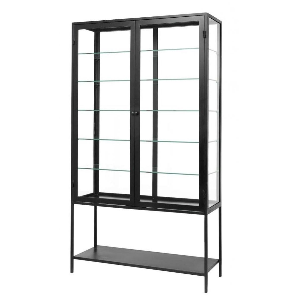 Stort, vackert displayskåp i svartlackat järn och med glas både i sidorna och baksidan samt i de två dörrarna. Fyra smala ben med en öppen hylla i botten, och totalt 6 hyllor inuti, varav 5 är av glas. Ett supertrevligt showcase med en mycket elegant, lätt och öppen look på grund av glas i alla sidor.