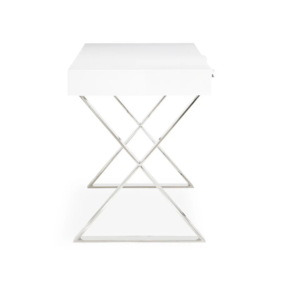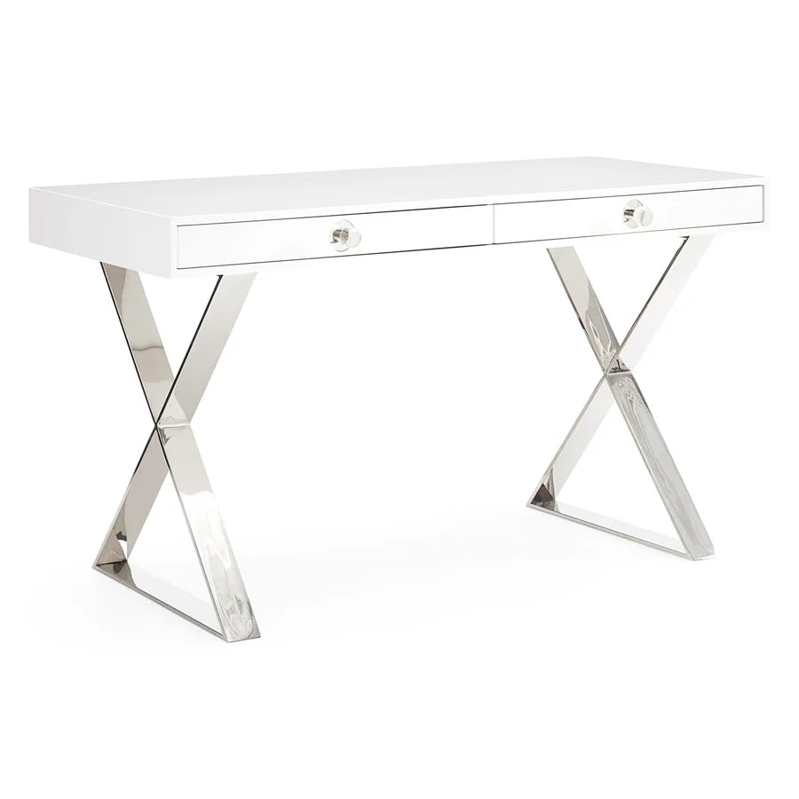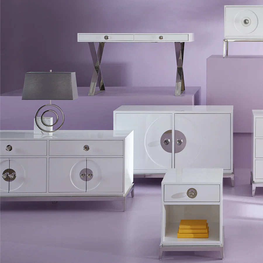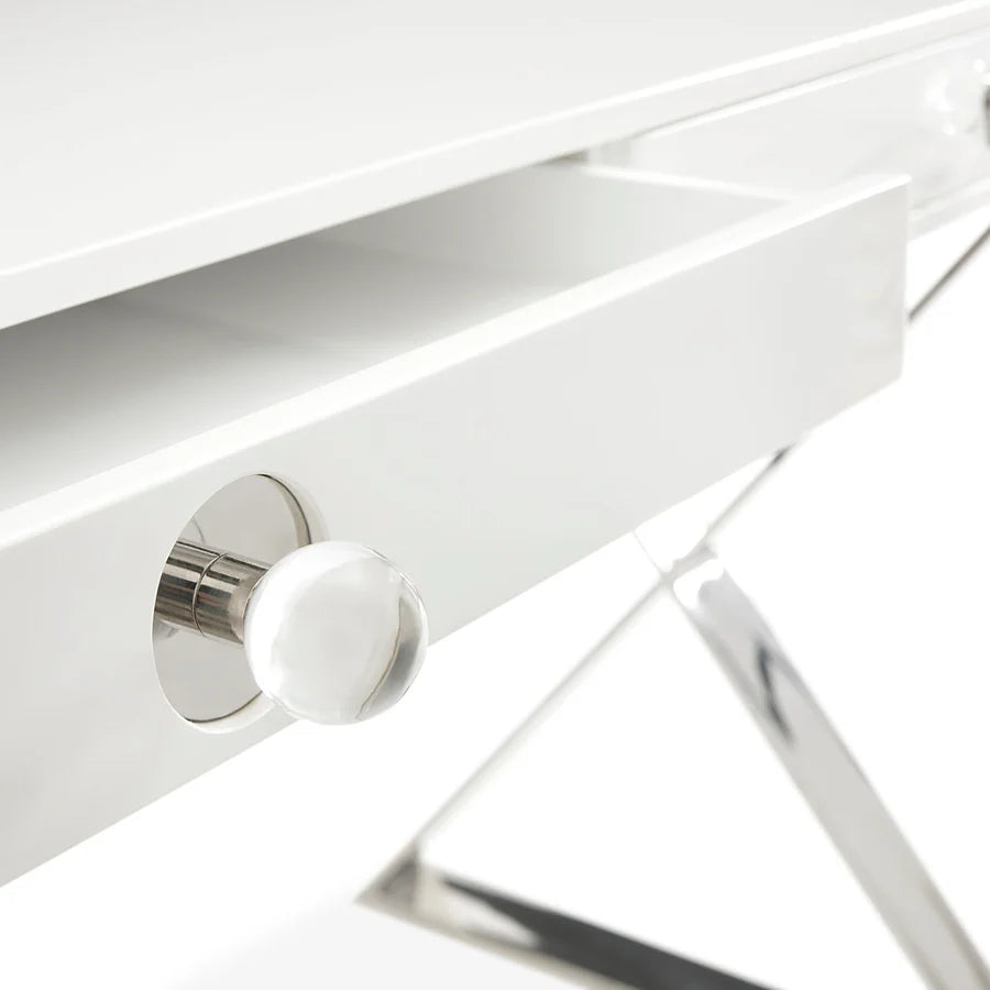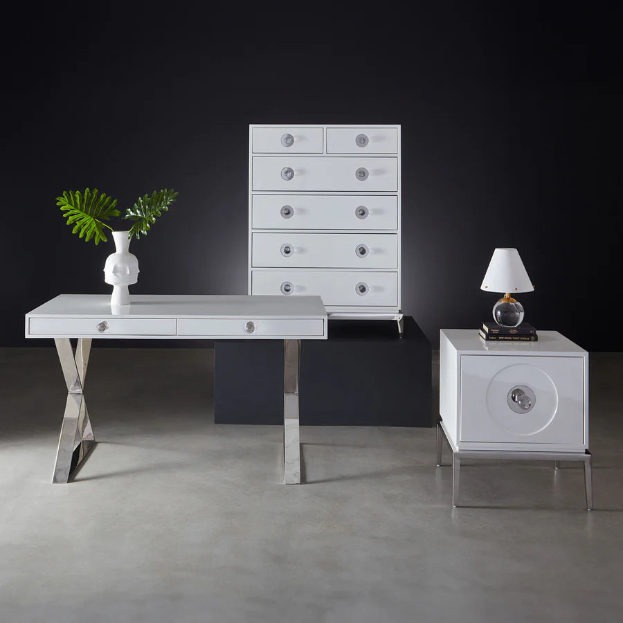 Nyklassiska linjer, en touch av Hollywood-glamour och en hint av modern självsäkerhet: det är Adlers Channing-kollektion. En elegant tolkning av klassisk kampanjstil med ett namn som säger allt – en hyllning till Margo Channing, Bette Davis karaktär i All About Eve. Korslagda polerade ben och överdimensionerade akrylknoppar utstrålar filmisk glamour, vilket gör detta till det perfekta sminkbordet eller en idealisk plats att skriva din nästa stora romantik.