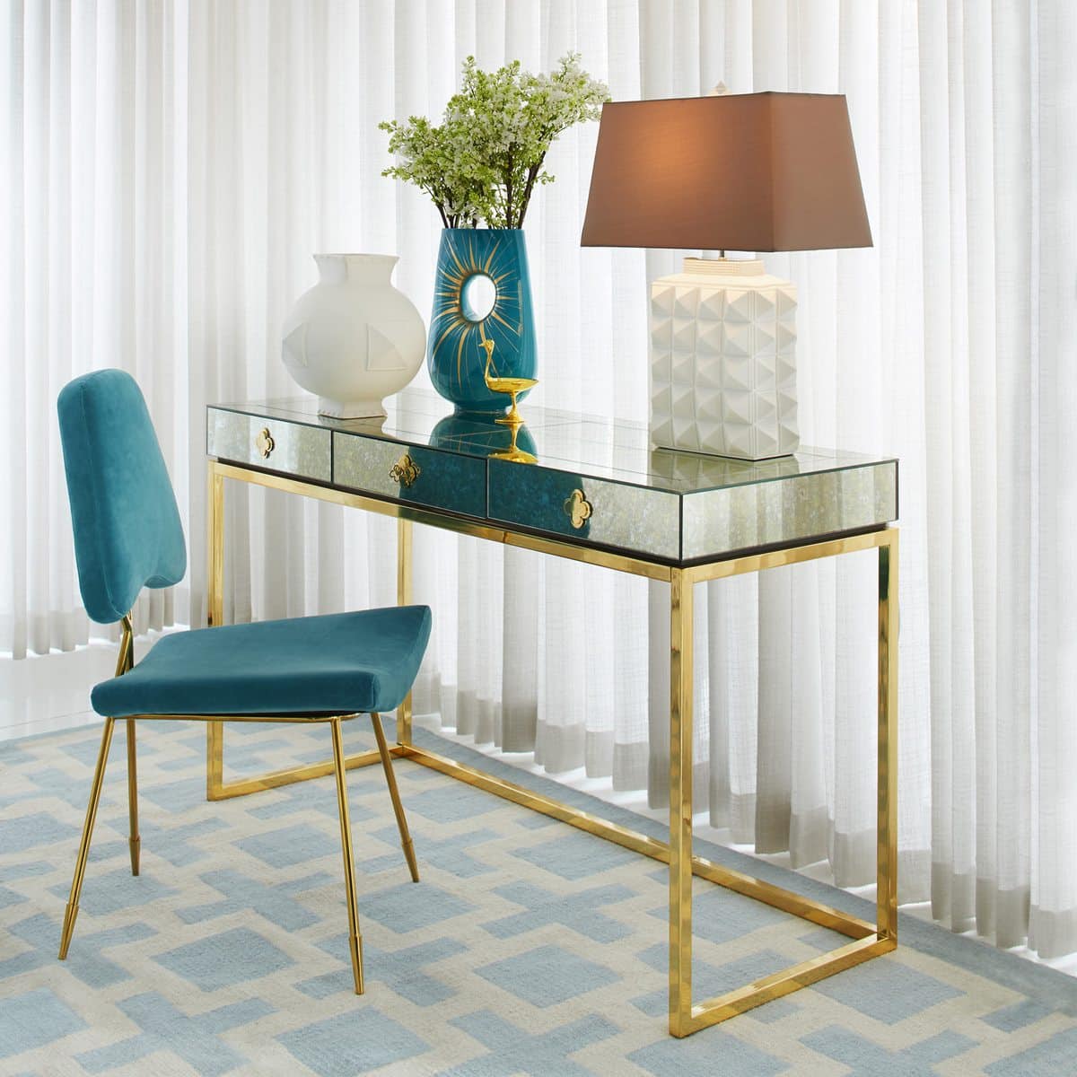 Minimalist forms meet Maximalist glamour. Antiqued mirror with a polished brass base. Our Delphine Desk features a single center drawer finished with bright robin’s egg blue lacquer. Perfect in a starlet’s study or as a bold finish for the modern boudoir.