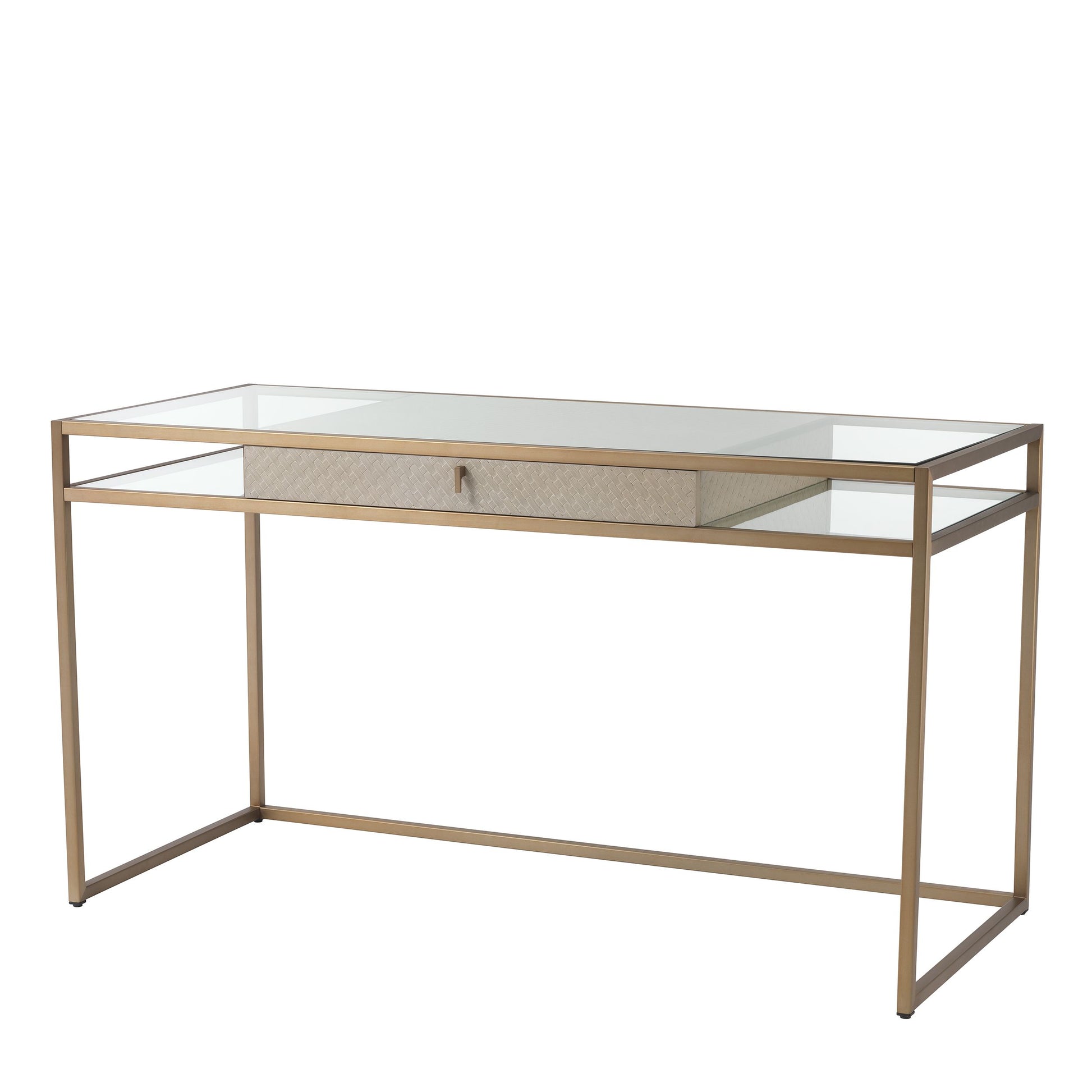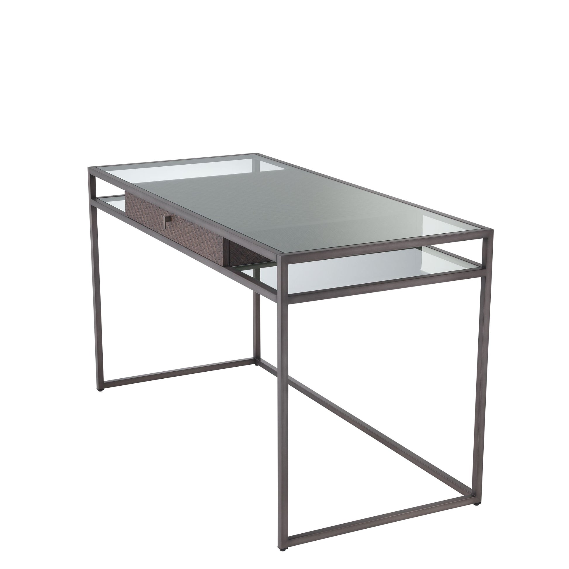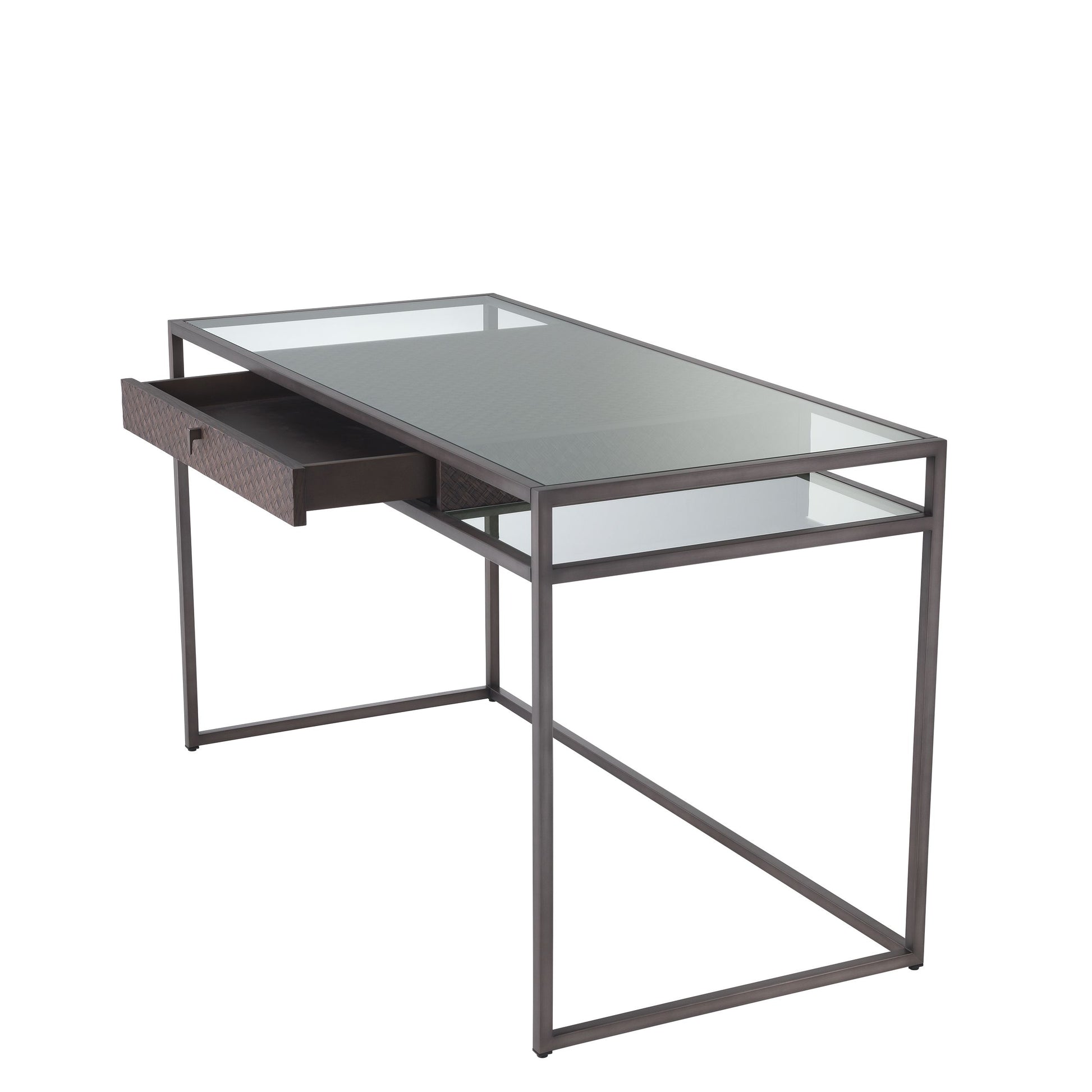 En härlig blandning av tyska designskolan Bauhaus och ett modernt utseende från mitten av århundradet, förgyller detta skrivbord er inredning med en elegant ram av rostfritt stål i bronsfinish, toppat med en glasskiva och en låda av vävd ekfanér.