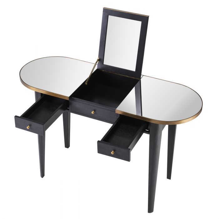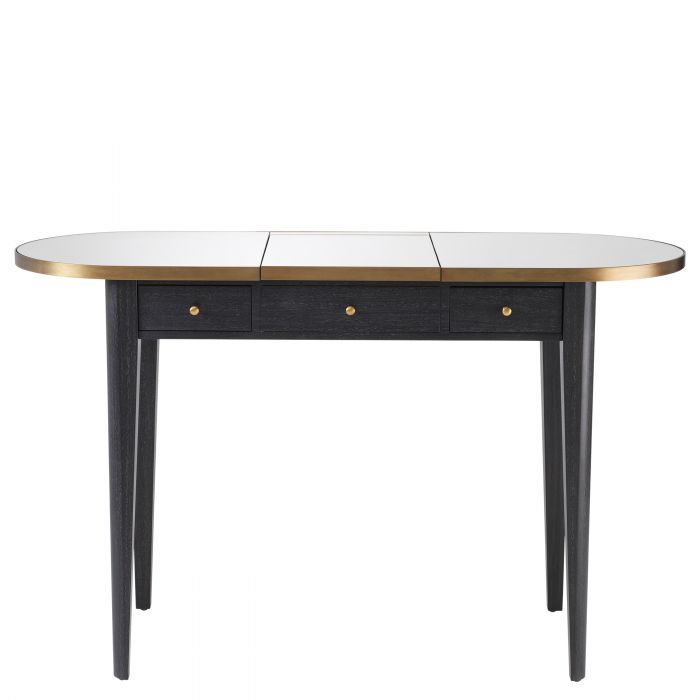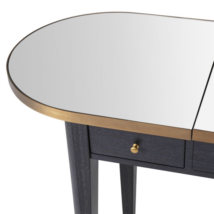 Med sminkbord Toulouse har du dina smink- och hårtillbehör välorganiserade i två stora lådor. Och det är inte allt… Tack vare den upp- och nerfällbara spegeln kan du enkelt omvandla det här läckra sminkbordet med spegel till ett perfekt skrivbord med dolt förvaringsutrymme under locket. Finish i träkolsfärgad ekfaner toppat med en bordsskiva i spegelglas med rundade hörn. Kanten med en finish i borstad mässing ger det här bordet extra lyft och lyxig känsla.