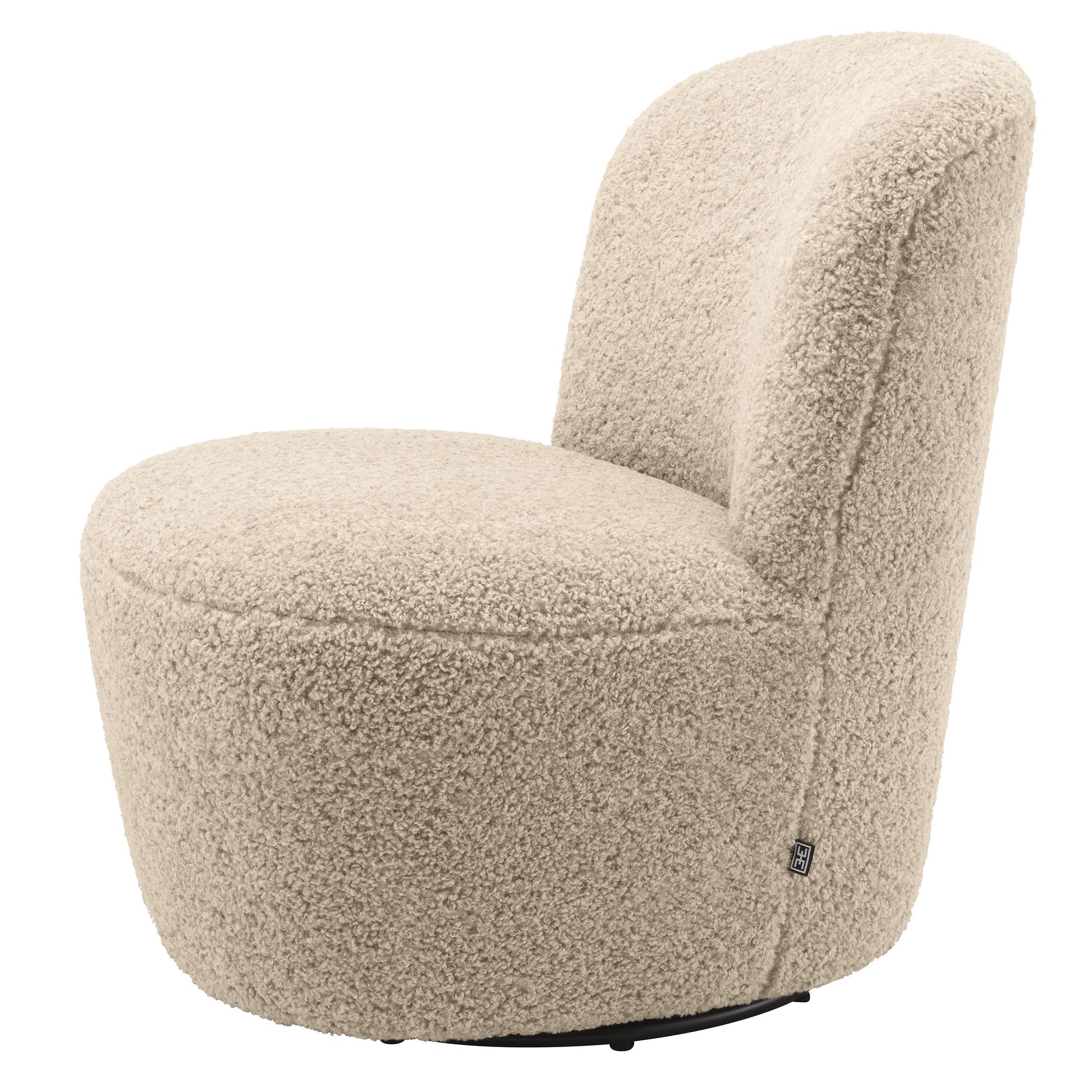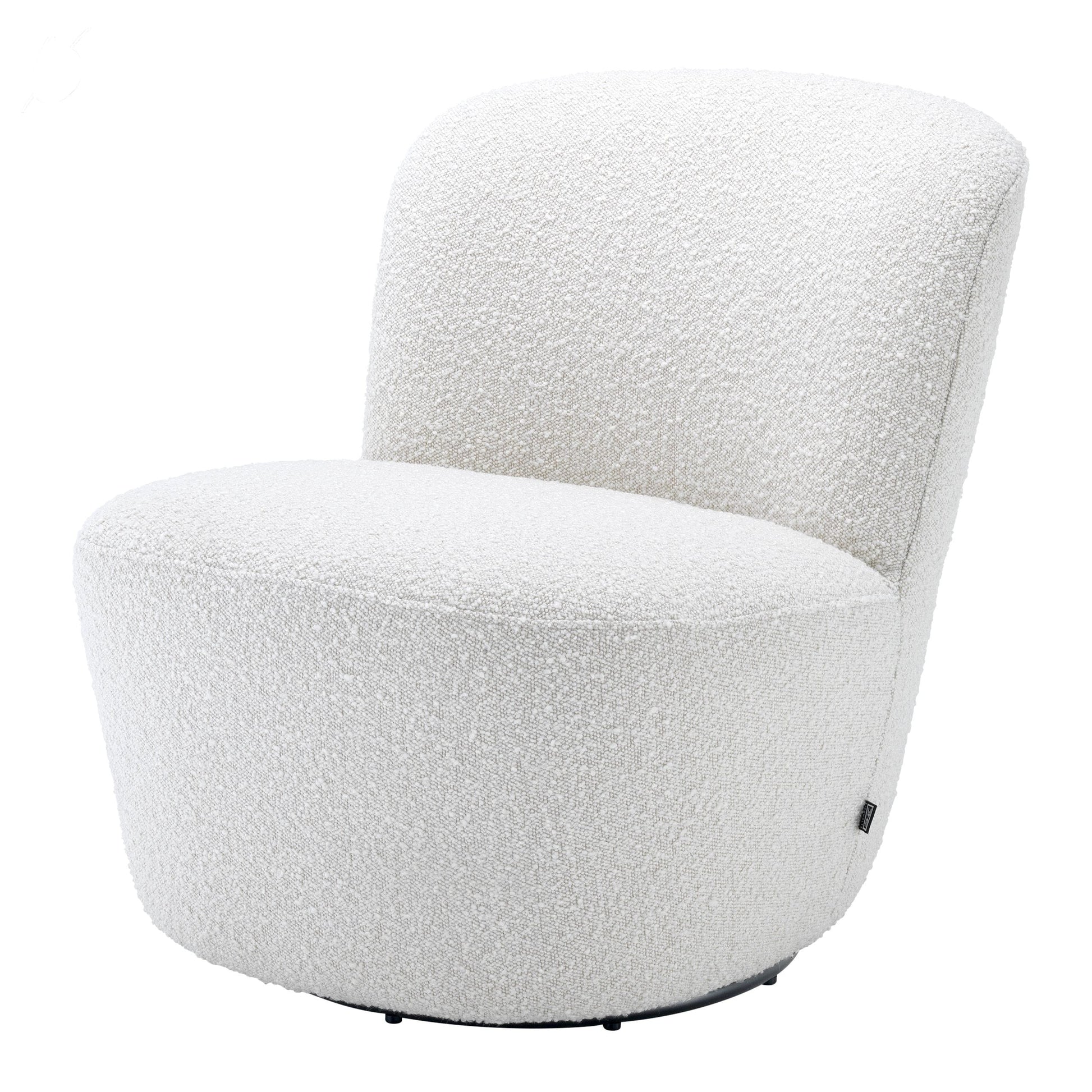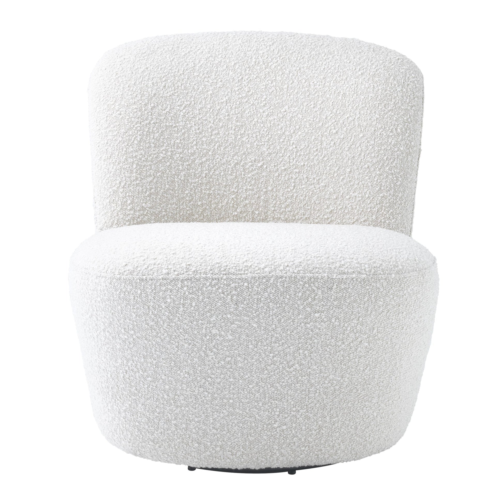 Läckert formad och designad fåtölj med härlig klädsel och mjuka former. Det omåttligt populära tyget Bouclé Cream eller Canberra Cream och nästintill osynliga basen som gör stolen snurrbar bidrar att denna designfåtölj blir en mycket härlig accent till din inredning.