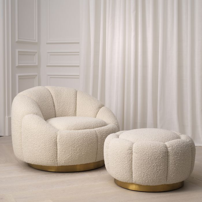 Med sina avkopplande kurvor och mjuka boucléklädsel kommer snurrfåtöljen Inger att ge ditt hem en känsla av lyx i överflöd. Med ett utseende som påminner om en öppen blomma, kommer denna förtjusande accentstol i läckra klädseln bouclé white att vara ett mycket dekorativt tillägg till ditt vardagsrum eller sovrum. Den är monterad på en vridbar bas i borstad mässingsfinish.
