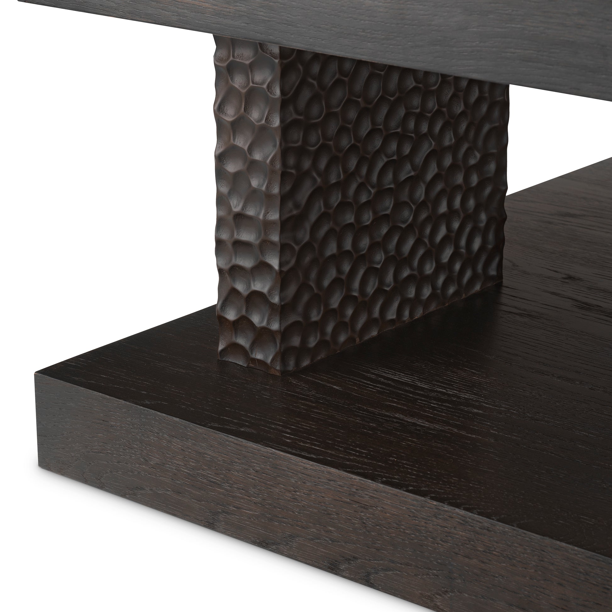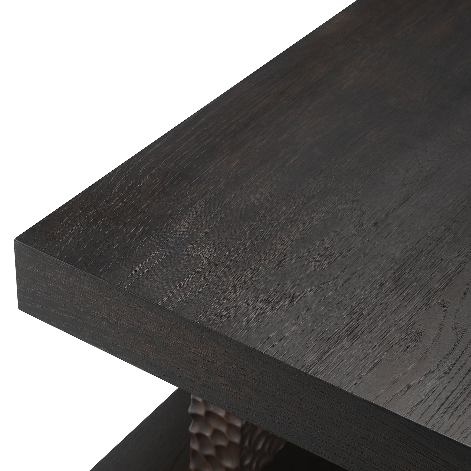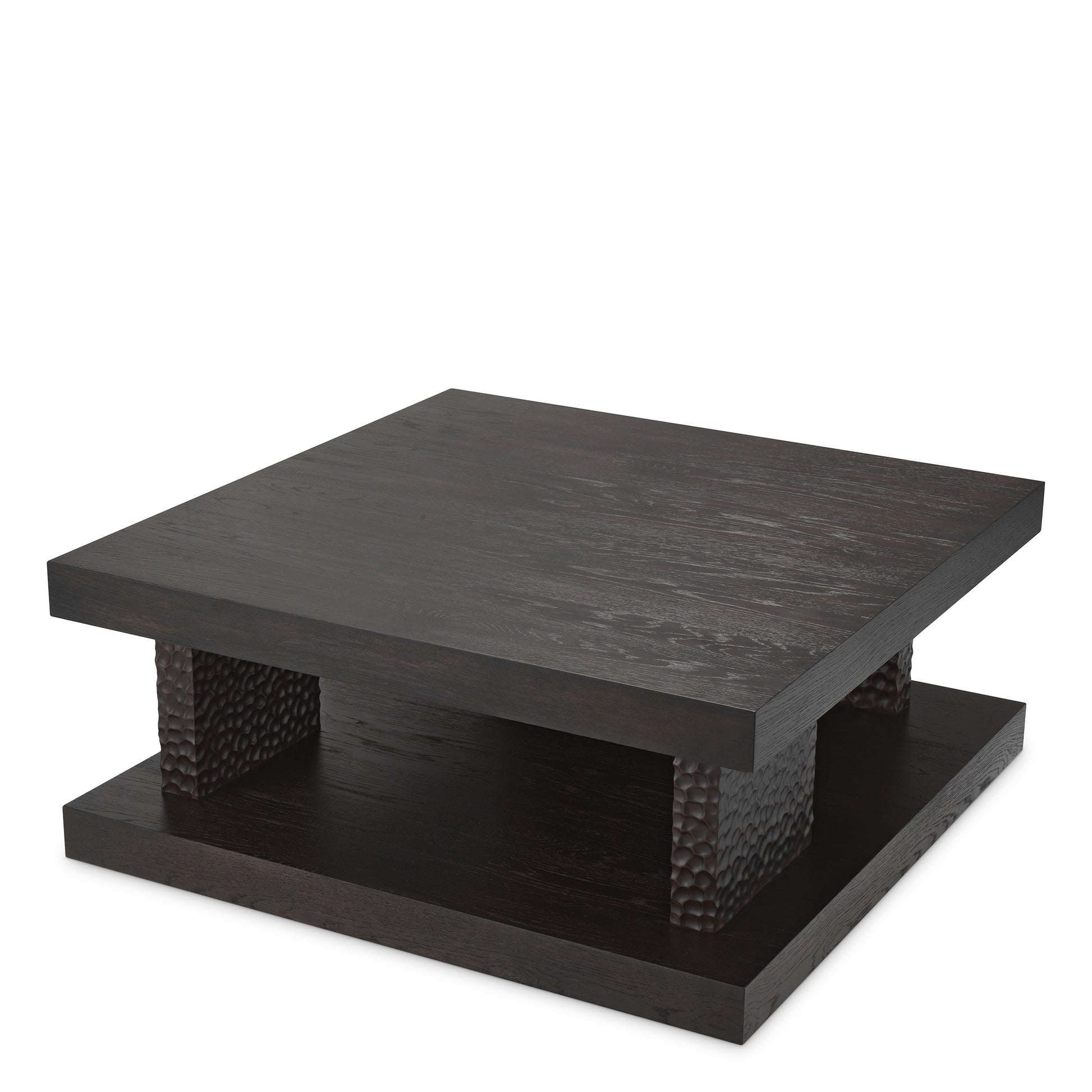 Soffbordet Bravon från Eichholtz förhöjer rummet med sin rika Ebony Oak-fanér och ett distinkt hammrat mönster. Bordets djupa, mörka nyanser kombineras med en subtil textur och skapar en sofistikerad men samtidigt självsäker närvaro – perfekt för lyxiga hem där tidlös elegans möter modern design.