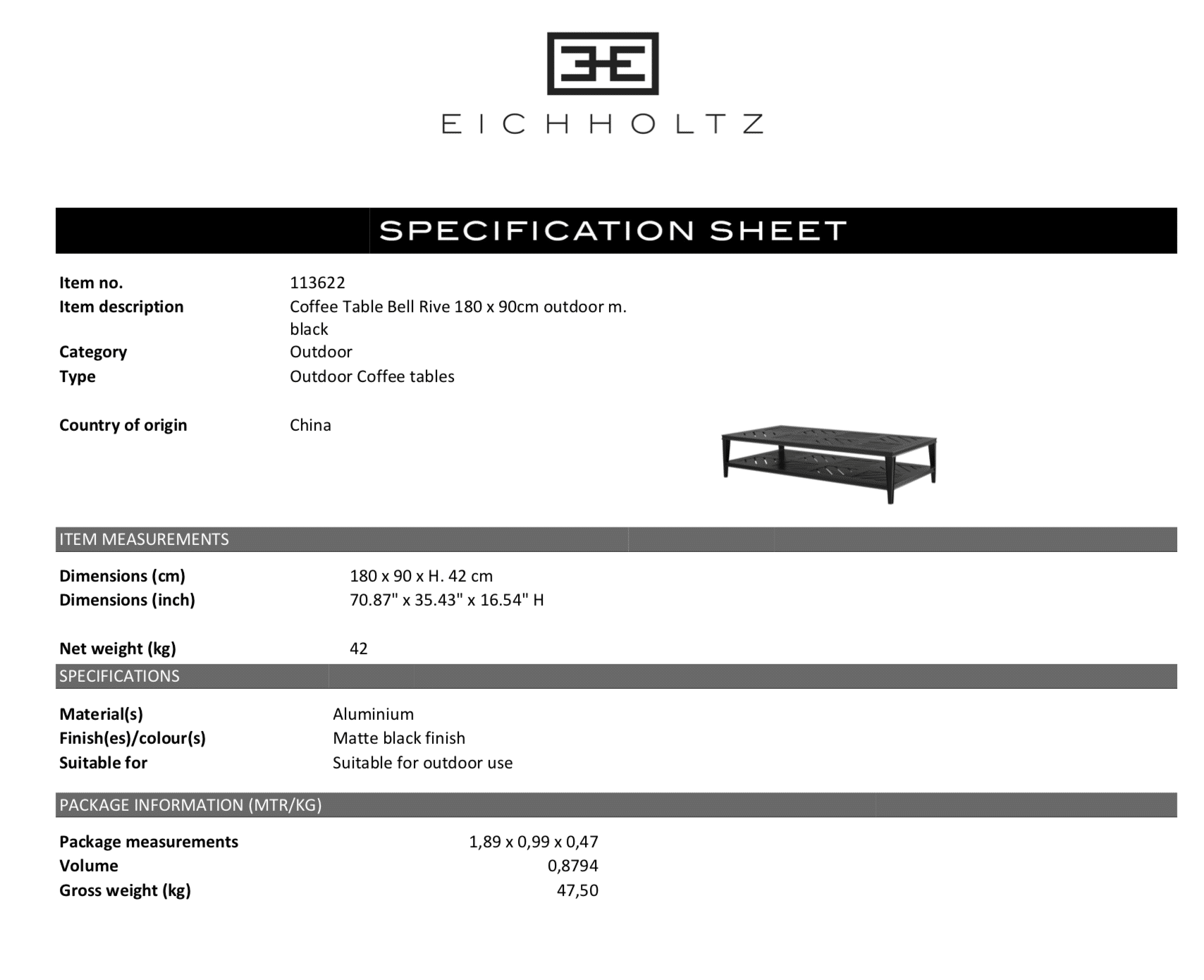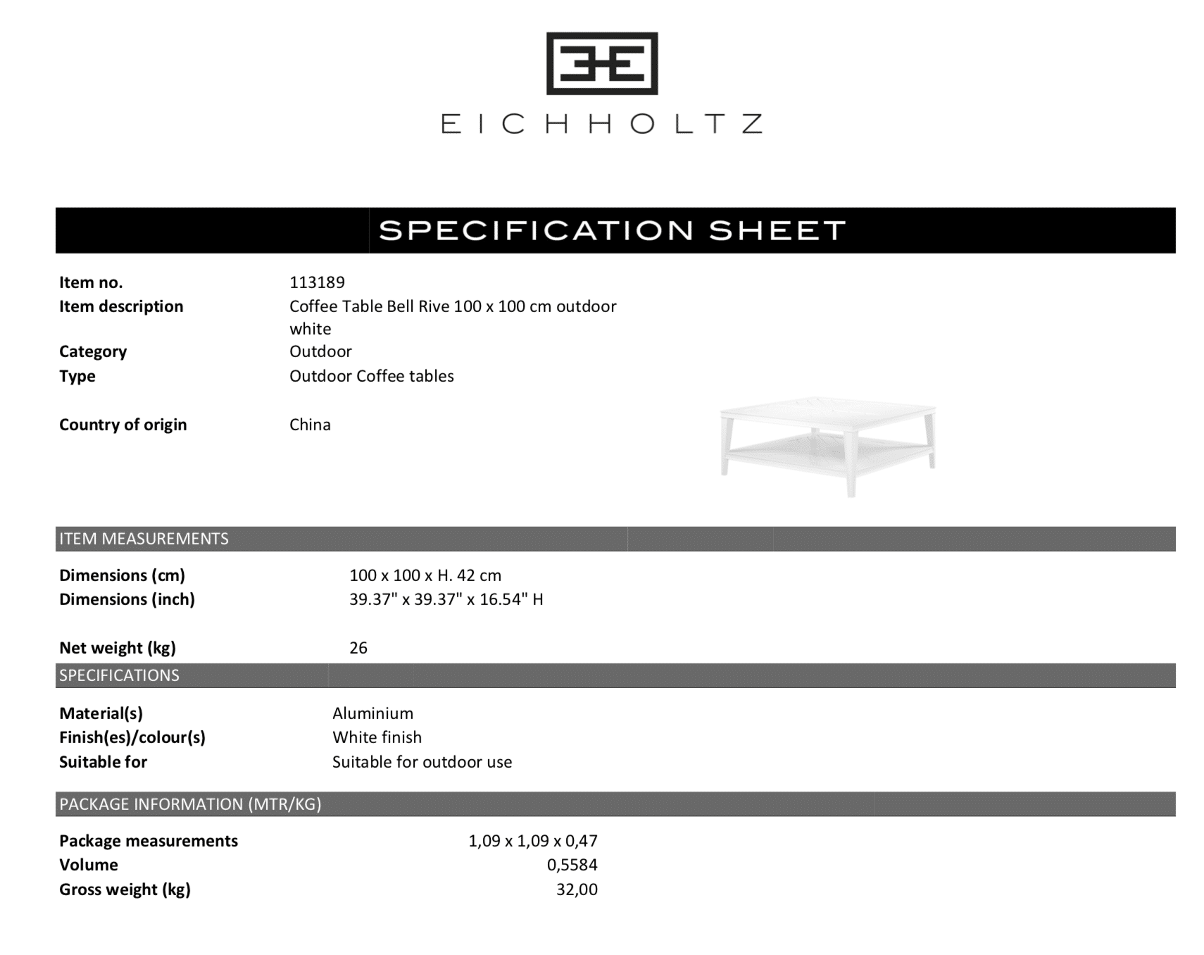 Ett mycket smidigt, snyggt och välbyggt soffbord till uteplatsen, loungegruppen eller pergolan. Lackad aluminium som inte rostar och praktiskt hyllplan under bordsskivan.