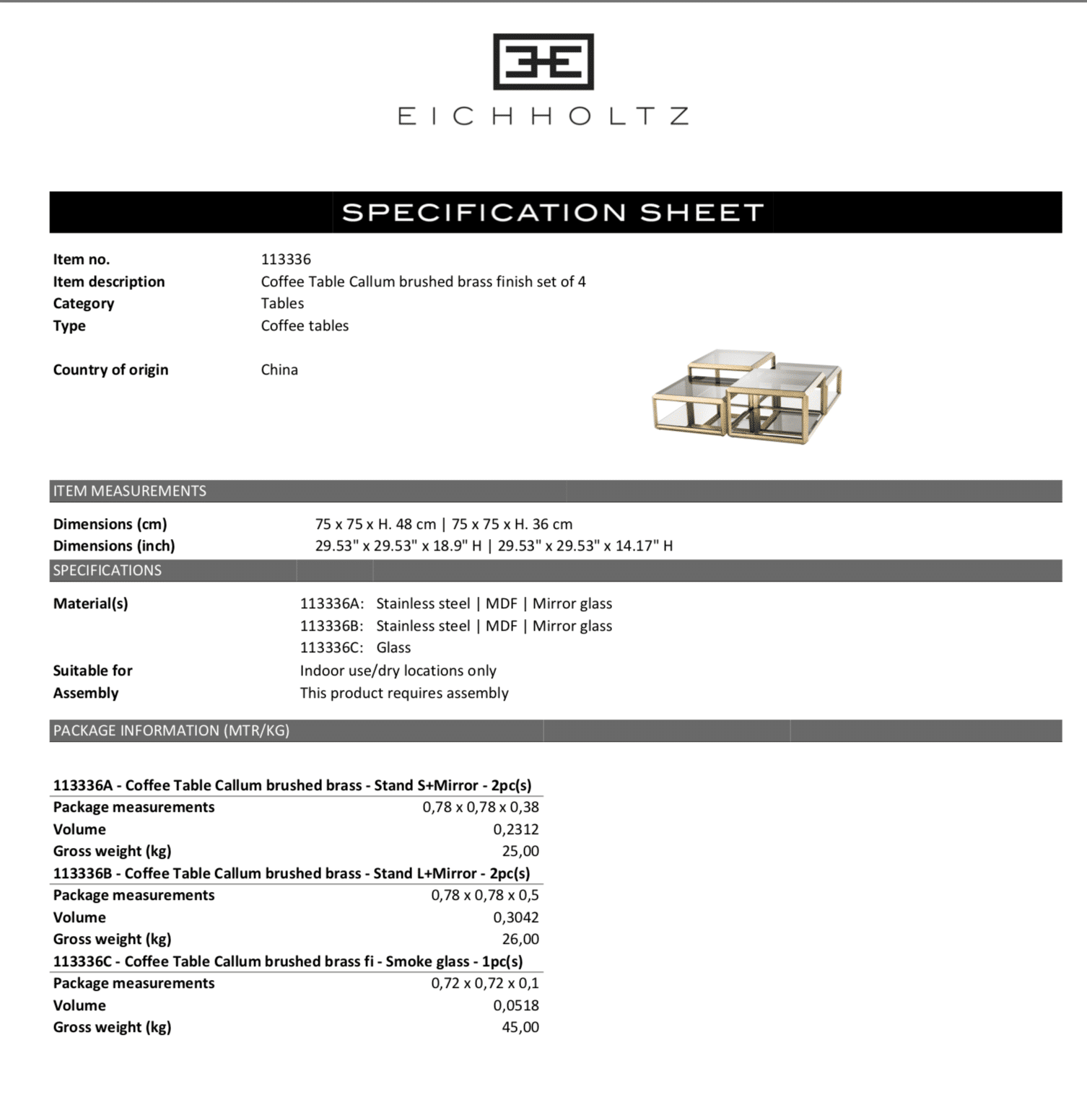 Ett otroligt läckert och välformat soffbord i läcker borstad mässingsfinish och rökfärgat spegelglas samt klarglas. Kombineras gärna med sidobord och konsolbord Callum.