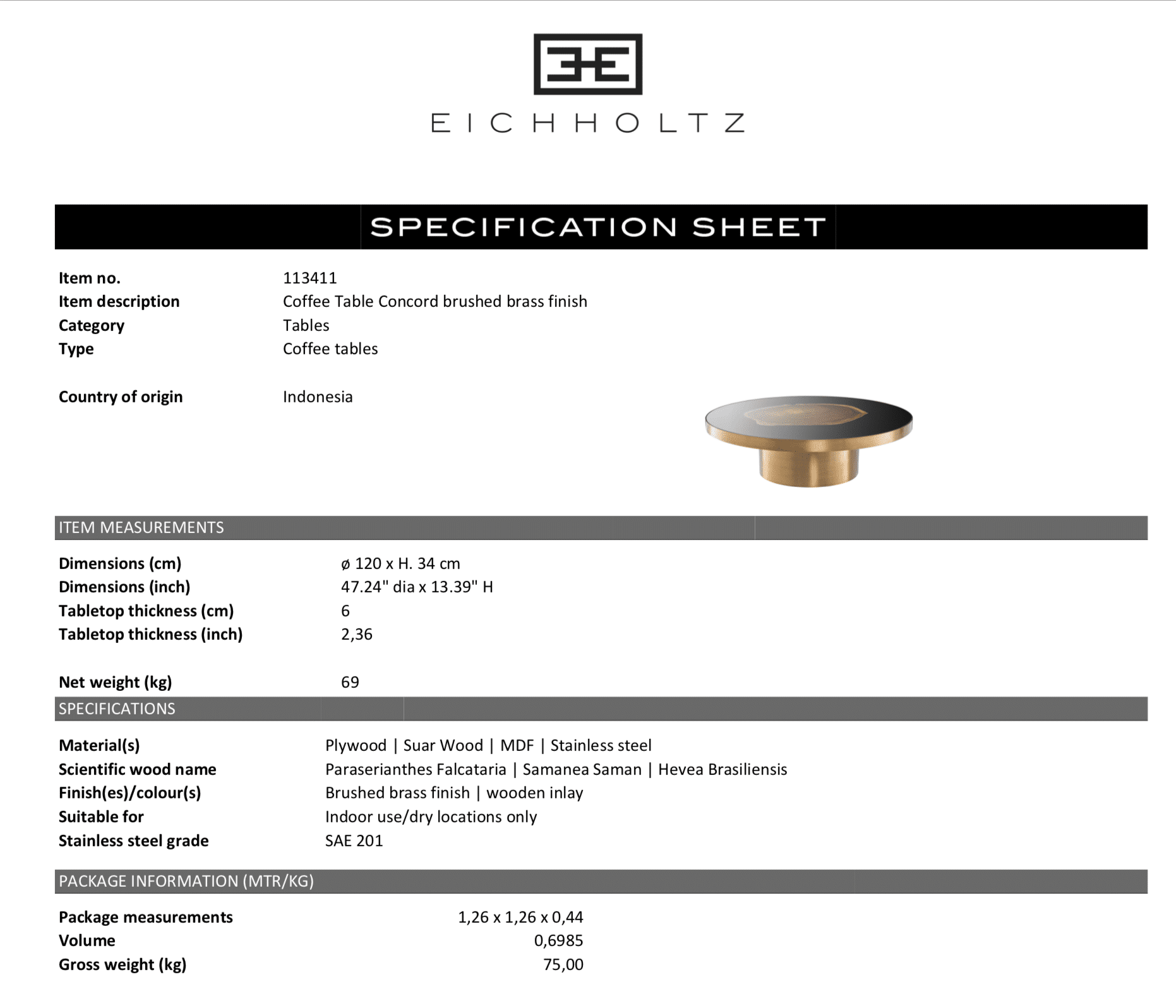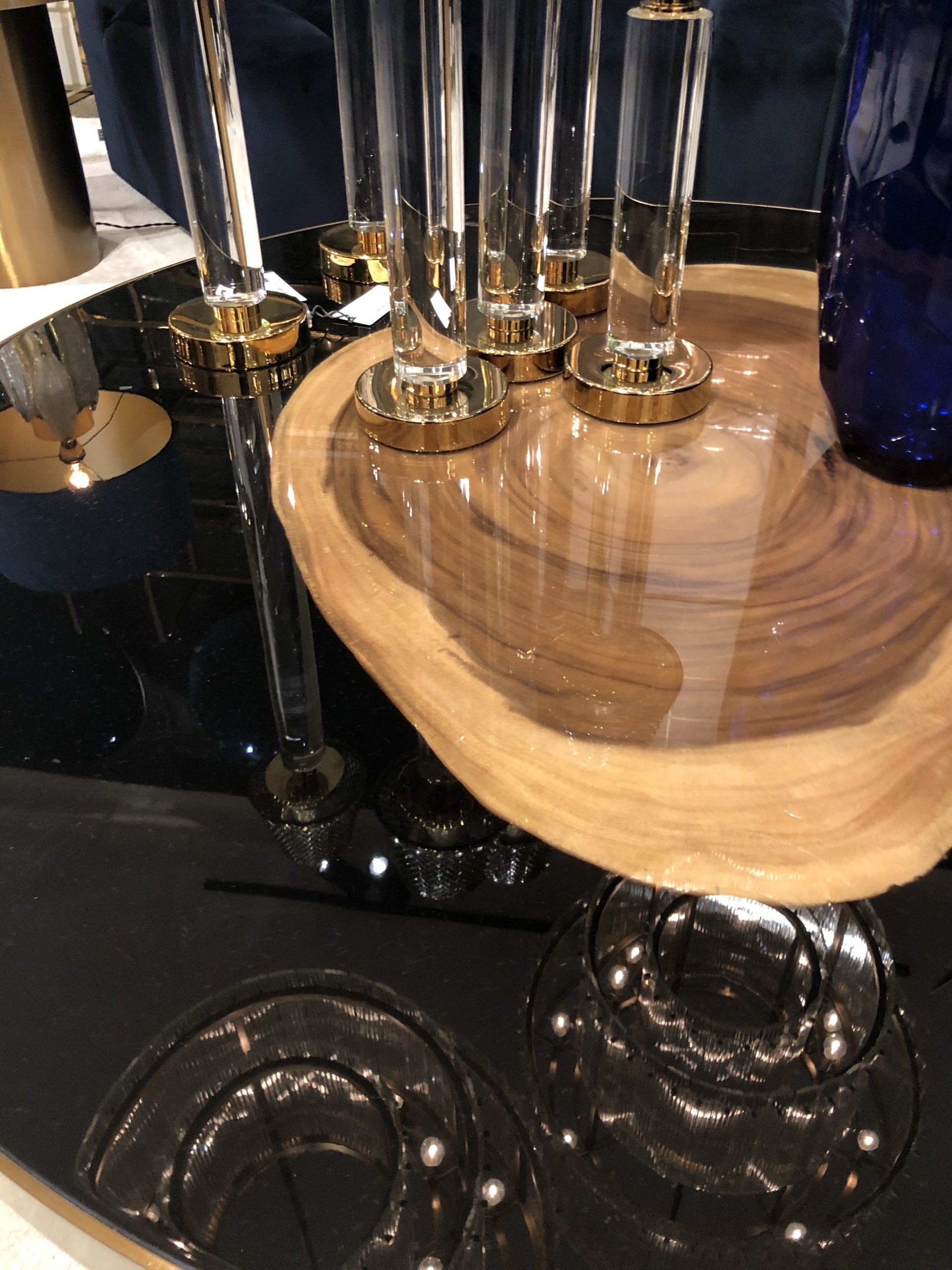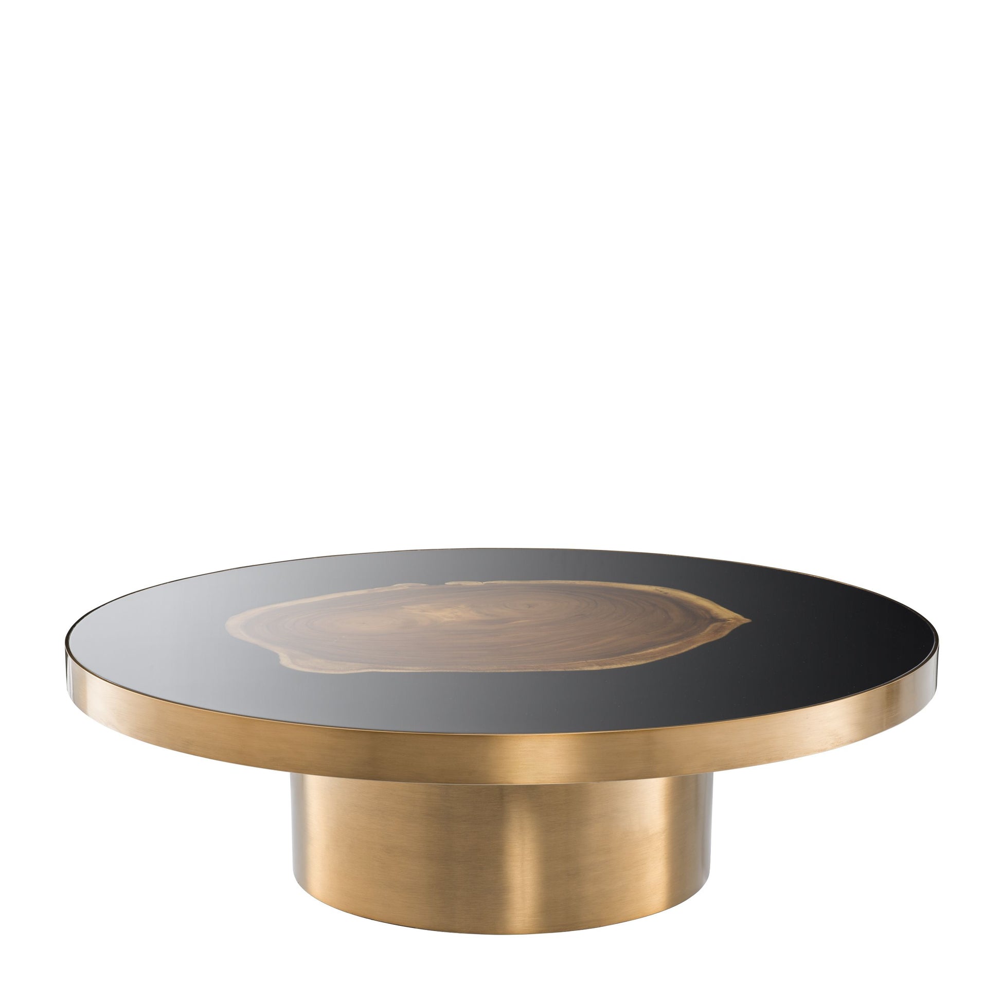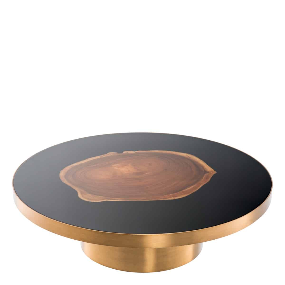Bjud in lite organisk chic känsla blandat med modern elegans och högblank finish till ditt vardagsrum. Detta extraordinära soffbord har en skiva från en trädstam i sig ingjutet i Resin (harts-liknande material) som bordsskiva och ett underrede i borstad mässingsfinish. Materialens underbara kontrast förvandlar det till en exklusiv och mycket originell möbel där inget bord är det andra likt beroende på träets utformning.