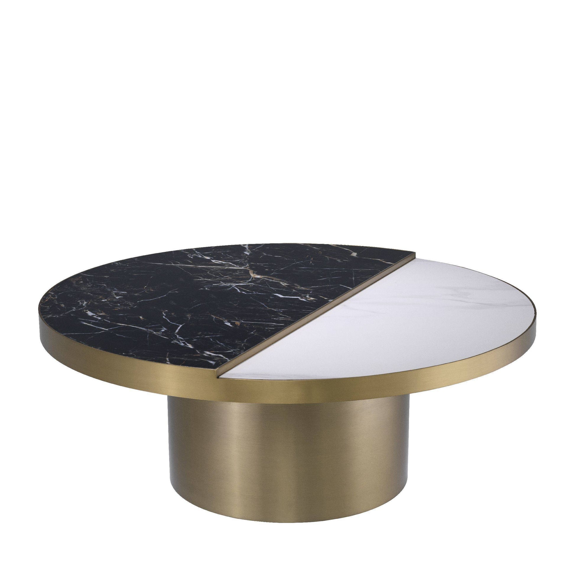 Toppa upp ditt vardagsrum med detta extremt eleganta soffbord. Den exceptionella bordsskivan består av två halvcirkelformade keramiska plattor i vit och svart marmorfinish. Jämfört med den vita marmordelen är den svarta marmordelen större och något upphöjd, vilket ger ett härlig liv och spännande uttryck i bordet. Bas i borstad mässingsfinish.