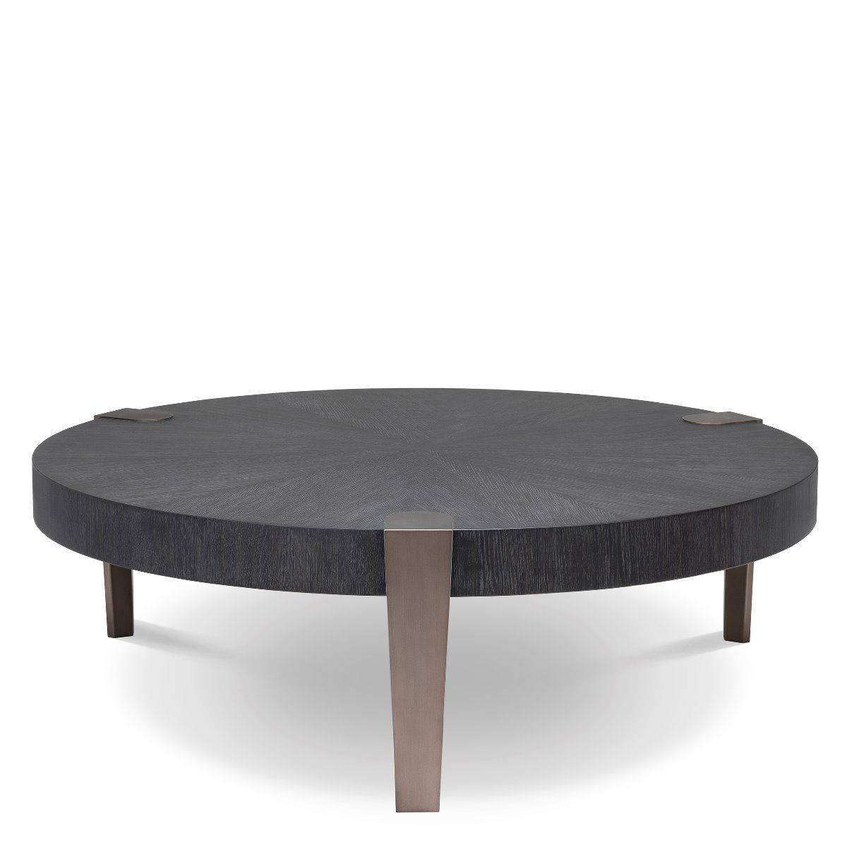 Ett härligt runt soffbord i retrostil och minimalistisk design i ekfanér och tre ben i borstad mässingsfinish alternativt svart/charcoal finish med bronsfinish. Ett mycket härligt soffbord som kompletterar din retrolook eller likväl moderna inredning.
