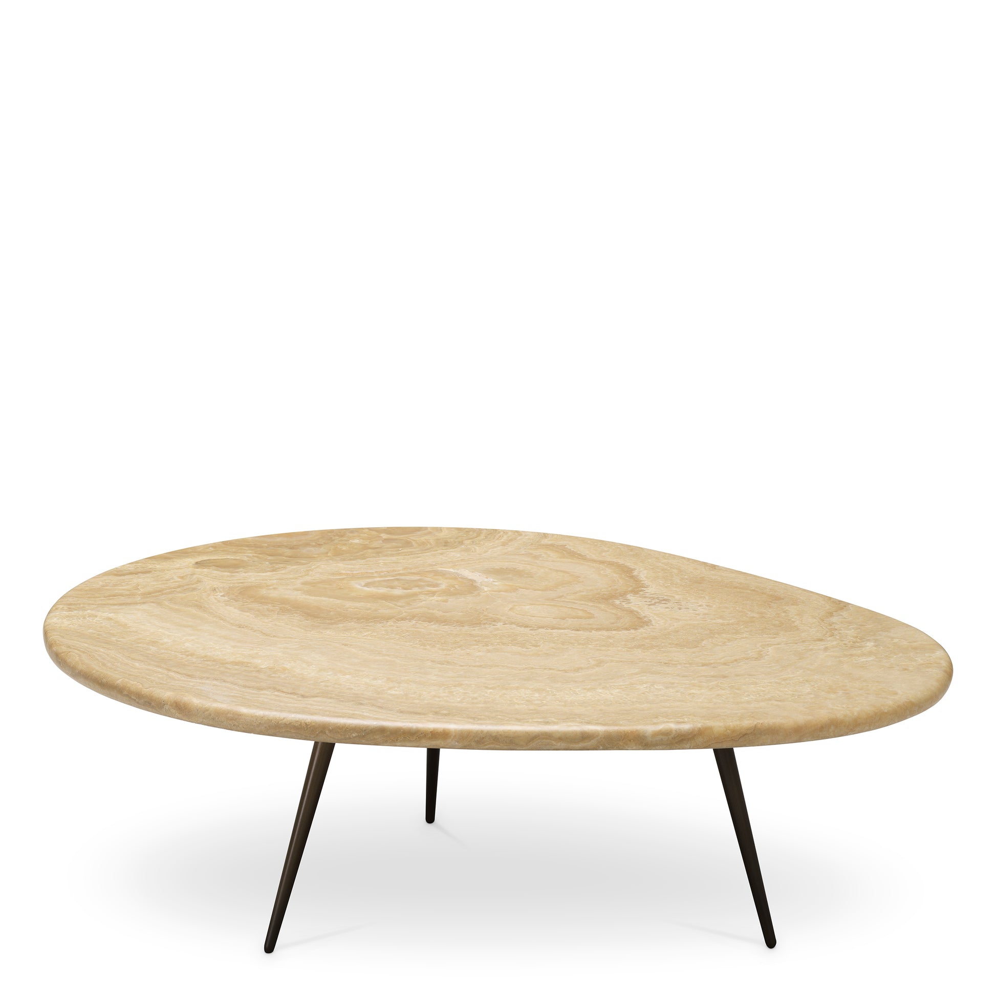 Soffbord Portofino S från Eichholtz har en organiskt formad bordsskiva i onyx med svarta, smala och avsmalnande ben. Den krämiga onyxytan med mjuka, flödande ådringar ger ett ljust djup som fångar och reflekterar ljus, vilket gör varje bord unikt. Perfekt för ett sofistikerat vardagsrum eller en lugn loungemiljö, tillför det värme, elegans och subtil lyx till varje interiör.