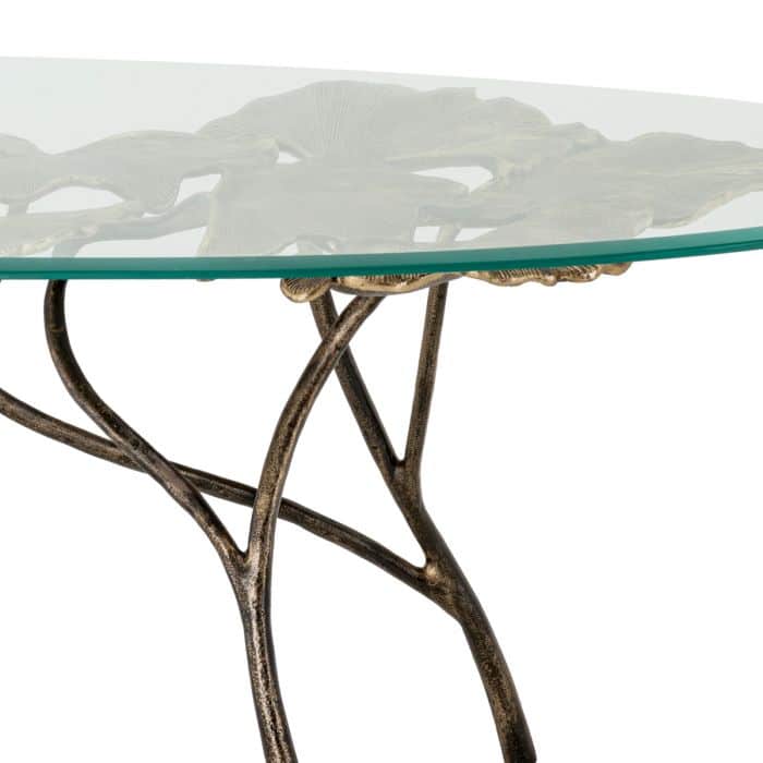 Havsinspirerad Skönhet: Ett subtilt formspråk genomsyrar designen av soffbordet Poseidon. Dess eleganta bordsskiva i glas förstärker den naturliga skönheten i ditt vardagsrum. De eleganta metallramarna i rostfritt stål som varsamt fått en vintage mässingsfinish utgör en perfekt balans mellan styrka och raffinerad estetik, vilket ger en omedelbar känsla av lyx till rummet.