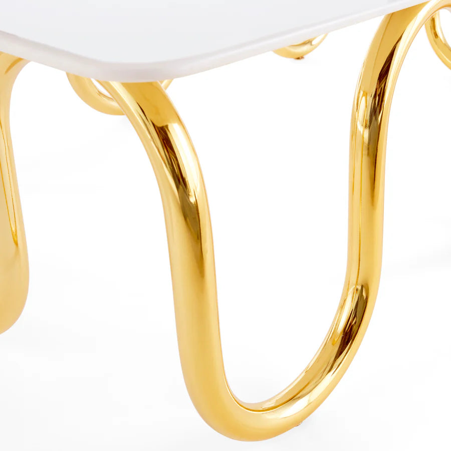 Detta skulpturala cocktailbord är en hyllning till surrealistisk elegans och sofistikerad enkelhet. Den böljande basen i böjd mässingsfinish skapar en dynamisk form som fångar ögat, medan den rena vita Carrara-marmor-skivan tillför en känsla av klassisk lyx. Marmorbord Scalinatella är lika förföriskt som sitt namn antyder – ett mästerverk av form, glittrande detaljer och tidlös glamour.